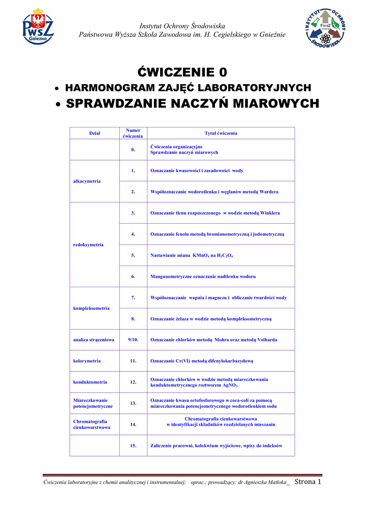Instytut Ochrony Środowiska Państwowa Wyższa Szkoła Zawodowa im. H. Cegielskiego w Gnieźnie ĆWICZENIE 0 HARMONOGRAM ZAJĘĆ LABORATORYJNYCH SPRAWDZANIE NACZYŃ MIAROWYCH Dział Numer ćwiczenia Tytuł ćwiczenia 0. Ćwiczenia organizacyjne Sprawdzanie naczyń miarowych 1. Oznaczanie kwasowości i zasadowości wody 2. Współoznaczanie wodorotlenku i węglanów metodą Wardera 3. Oznaczanie tlenu rozpuszczonego w wodzie metodą Winklera 4. Oznaczanie fenolu metodą bromianometryczną i jodometryczną 5. Nastawianie miana KMnO4 na H2C2O4 6. Manganometryczne oznaczanie nadtlenku wodoru 7. Współoznaczanie wapnia i magnezu i obliczanie twardości wody 8. Oznaczanie żelaza w wodzie metodą kompleksometryczną alkacymetria redoksymetria kompleksometria analiza strąceniowa 9/10. Oznaczanie chlorków metodą Mohra oraz metodą Volharda kolorymetria 11. Oznaczanie Cr(VI) metodą difenylokarbazydową konduktometria 12. Oznaczanie chlorków w wodzie metodą miareczkowania konduktometrycznego roztworem AgNO 3 Miareczkowanie potencjometryczne 13. Oznaczanie kwasu ortofosforowego w coca-coli za pomocą miareczkowania potencjometrycznego wodorotlenkiem sodu Chromatografia cienkowarstwowa 14. 15. Chromatografia cienkowarstwowa w identyfikacji składników rozdzielanych mieszanin Zaliczenie pracowni, kolokwium wyjściowe, wpisy do indeksów Ćwiczenia laboratoryjne z chemii analitycznej i instrumentalnej; oprac.; prowadzący: dr Agnieszka Matłoka Strona 1 Instytut Ochrony Środowiska Państwowa Wyższa Szkoła Zawodowa im. H. Cegielskiego w Gnieźnie I. WSTĘP I CEL ĆWICZENIA Należy odróżnić sprawdzanie pojemności od kalibracji naczynia miarowego. SPRAWDZANIE POJEMNOŚCI polega na wyznaczeniu rzeczywistej pojemności naczynia. KALIBROWANIE polega na wyznaczeniu i cechowaniu objętości odpowiadającej deklarowanej pojemności naczynia. POPRAWKA KALIBRACYJNA różnica między deklarowaną a rzeczywistą pojemnością naczynia miarowego; a gdy da różnica wyrażona jest w procentach to nazywamy ją BŁĘDEM KALIBRACYJNYM. Naczynia miarowe przed użyciem należy sprawdzić, jeżeli nie są one urzędowo sprawdzone. Do sprawdzenia naczyń miarowych należy: - sprawdzenie pojemności kolb miarowych na wlew - sprawdzenie pipet i biuret na wylew - wyznaczenie współmierności kolby z pipetą. Sprawdzanie pojemności kolby miarowej czy pipety wykonuje się 3-4 –krotnie, aż do uzyskania zgodnych z sobą wyników. Różnica między zgodnymi wynikami powinna być mniejsza niż 0,05%. Jeżeli chodzi o współmierność należy zwrócić uwagę z jakiej cieczy się korzysta. Jeżeli podczas wyznaczania współmierności kolby z pipetą korzystamy z wody, to należy pamiętać iż wyznaczoną współmiernością możemy posługiwać się w przypadku rozcieńczonych wodnych roztworów. Natomiast wodne roztwory stężone czy roztwory w innych rozpuszczalnikach mają inną lepkość, a więc współmierność też będzie inna. Celem ćwiczenia jest nabycie przez studenta w laboratorium analizy ilościowej umiejętności sprawdzania naczyń miarowych poprzez wyznaczenie pojemności kolby miarowej i pipety oraz wyznaczenie współmierności kolby i pipety. Natomiast studenci nie kalibrują ich. II. SPRZĘT I ODCZYNNIKI: - waga techniczna - waga analityczna - kolba miarowa poj. 50 ml - pipeta wielomiarowa poj. 10 ml - naczynko wagowe z pokrywką - termometr - zlewka poj. 250 ml - tryskawka - woda destylowana III. METODYKA: 1. Sprawdzanie pojemności kolby miarowej na wlew 1. Zważyć na wadze technicznej suchą, pustą, zakorkowaną kolbę miarową i zapisać masę kolbki. 2. Wlej do zlewki wodę destylowaną i zmierz jej temperaturę, a następnie ją zapisz. Ćwiczenia laboratoryjne z chemii analitycznej i instrumentalnej; oprac.; prowadzący: dr Agnieszka Matłoka Strona 2 Instytut Ochrony Środowiska Państwowa Wyższa Szkoła Zawodowa im. H. Cegielskiego w Gnieźnie 3. Następnie napełnij za pomocą tryskawki kolbkę miarową wodą destylowaną do kreski. Zamknij kolbkę korkiem. 4. Zważ kolbkę z wodą i zapisz masę. 5. Różnica mas stanowi masę wody zawartej w kolbie mk H2O , co należy obliczyć z poniższego wzoru: mk H2O = m peł. – m pust. gdzie: mk H2O – masa wody destylowanej m peł. - masa kolbki z wodą destylowaną m pust. – masa pustej kolbki. 6. Pojemność kolby Vk, równa się objętości zważonej wody, którą oblicza się z poniższego wzoru: Vk mk H 2O d gdzie: Vk – pojemność kolby, równa objętości zważonej wody mk H2O – masa wody destylowanej zawartej w kolbie miarowej d – gęstość wody w danej temperaturze 7. Zestawienie wartości gęstości wody w zależności od temperatury w poniższej tabeli: Temperatura T [° C] 15 16 17 18 19 20 Gęstość wody d [g/ml] 0,9979 0,9978 0,9977 0,9975 0,9974 0,9972 Temperatura T [° C] 21 22 23 24 25 26 Gęstość wody d [g/ml] 0,9970 0,9968 0,9966 0,9964 0,9962 0,9960 8. Pomiar należy wykonać trzy razy. 9. Zestawienie i opracowanie wyników: Lp. m pust. [g] m peł. [g] mk H2O [g] Pojemność kolby Vk Średnia pojemność kolby Vk 1 2 3 Ćwiczenia laboratoryjne z chemii analitycznej i instrumentalnej; oprac.; prowadzący: dr Agnieszka Matłoka Strona 3 Instytut Ochrony Środowiska Państwowa Wyższa Szkoła Zawodowa im. H. Cegielskiego w Gnieźnie Średnia wartość masy wody zawartej w kolbce miarowej: mk H2O śr. = 2. Sprawdzanie pojemności pipety na wylew 1. Wlej do zlewki wodę destylowaną i zmierz jej temperaturę, a następnie ją zapisz. 2. Na wadze analitycznej zważ puste, suche, zamknięte naczynko wagowe i zapisz jego masę. 3. Napełnij pipetę wodą destylowaną o znanej temperaturze, a następnie przenieść do zważonego naczynka wagowego. 4. Zważyć na wadze analitycznej zamknięte, napełnione wodą destylowaną naczynko wagowe i zapisz jego masę. 5. Różnica mas stanowi masę wody zawartej w pipecie mp H2O , co należy obliczyć z poniższego wzoru: mp H2O = m peł. – m pust. gdzie: mp H2O 