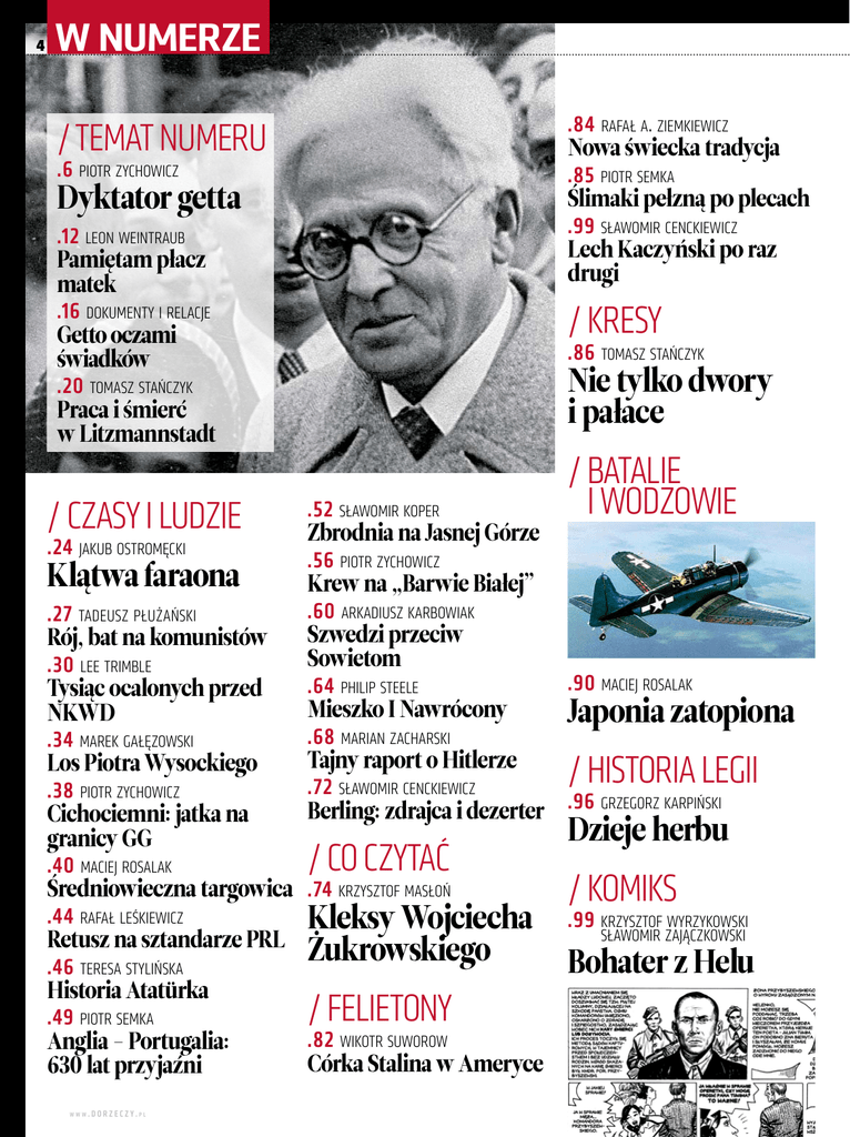 4 W NUMERZE .84 RAFAŁ A. ZIEMKIEWICZ / TEMAT NUMERU Nowa świecka tradycja .6 PIOTR ZYCHOWICZ .85 PIOTR SEMKA Dyktator getta Ślimaki pełzną po plecach .99 SŁAWOMIR CENCKIEWICZ .12 LEON WEINTRAUB Lech Kaczyński po raz drugi Pamiętam płacz matek .16 DOKUMENTY I RELACJE Getto oczami świadków / KRESY .86 TOMASZ STAŃCZYK Nie tylko dwory i pałace .20 TOMASZ STAŃCZYK Praca i śmierć w Litzmannstadt eprasa.pl / CZASY I LUDZIE .24 JAKUB OSTROMĘCKI Klątwa faraona .27 TADEUSZ PŁUŻAŃSKI / BATALIE I WODZOWIE Rój, bat na komunistów .30 LEE TRIMBLE .52 SŁAWOMIR KOPER Zbrodnia na Jasnej Górze .56 PIOTR ZYCHOWICZ Krew na „Barwie Białej” .60 ARKADIUSZ KARBOWIAK Szwedzi przeciw Sowietom .90 MACIEJ ROSALAK Tysiąc ocalonych przed NKWD .64 PHILIP STEELE Mieszko I Nawrócony Japonia zatopiona Los Piotra Wysockiego Tajny raport o Hitlerze / HISTORIA LEGII .34 MAREK GAŁĘZOWSKI .68 MARIAN ZACHARSKI .38 PIOTR ZYCHOWICZ .72 SŁAWOMIR CENCKIEWICZ Cichociemni: jatka na granicy GG Berling: zdrajca i dezerter .96 GRZEGORZ KARPIŃSKI .40 MACIEJ ROSALAK / CO CZYTAĆ .44 RAFAŁ LEŚKIEWICZ Kleksy Wojciecha Żukrowskiego Średniowieczna targowica .74 KRZYSZTOF MASŁOŃ Retusz na sztandarze PRL .46 TERESA STYLIŃSKA Historia Atatürka .49 PIOTR SEMKA Anglia - Portugalia: 630 lat przyjaźni WWW.DORZECZY.PL / FELIETONY .82 WIKOTR SUWOROW Córka Stalina w Ameryce Dzieje herbu / KOMIKS .99 KRZYSZTOF WYRZYKOWSKI SŁAWOMIR ZAJĄCZKOWSKI Bohater z Helu