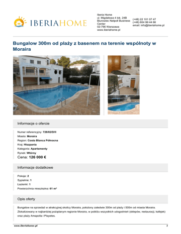 Iberia Home ul. Migdałowa 4 lok. 24B (+48) 22 101 07 47 Biurowiec Natpoll Business (+48) 604 99 44 66 Center email: [email protected] 02-796 Warszawa www.iberiahome.pl Bungalow 300m od plaży z basenem na terenie wspólnoty w Moraira Informacje o ofercie Numer referencyjny: 728/02/D/II Miasto: Moraira Region: Costa Blanca Północna Kraj: Hiszpania Kategoria: Apartamenty Rynek: Wtórny Cena: 126 000 € Informacje dodatkowe Pokoje: 2 Sypialnie: 1 Łazienki: 1 Powierzchnia mieszkalna: 61 m² Opis oferty Bungalow na sprzedaż w atrakcyjnej okolicy Moraira, położony zaledwie 300m od plaży i 500m od miasta Moraira. Zlokalizowany w najbardziej pożądanym regionie Moraira, w pobliżu wszystkich udogodnień (sklepów, restauracji, kafejek) oraz plaży Amapolla i Playetes. www.iberiahome.pl 1 Bungalow zorientowany na stronę południową posiada całkowicie wyposażoną kuchnię, spiżarnię, pokój dzienny, dużą sypialnię, łazienkę, pomieszczenie gospodarcze, taras oraz strefę parkingu. Przed domem znajduje się basen wspólnoty. Bungalow for sale in a prestigious area of Moraira, near the sea, just 500 m from the town of Moraira and 300 metres from the beach. Bungalow en venta en una prestigiosa zona de de Moraira, cerca del mar, a sólo 500 m del pueblo de Moraira y a 300 metros de la playa. This property is located in one of the areas with the highest demand of Moraira, close to all amenities of the town (shops, cafés, restaurants, etc) and the beaches of the 'Ampolla" and 'Playetes'. This is a nice bungalow facing south and is distributed in fully equipped kitchen, pantry, living - dining room, 1 large bedroom, bathroom, storage room, outside terrace and parking area. There is a possibility to have a second bedroom. It also has a communal swimming pool and terrace around it. - See more at: http://www.realestatecelenia.co.uk/sale/bungalow-300-meters-beach-prestigious-area-moraira#sthash.DYsVUOAA.dpuf Bungalow for sale in a prestigious area of Moraira, near the sea, just 500 m from the town of Moraira and 300 metres from the beach. Bungalow en venta en una prestigiosa zona de de Moraira, cerca del mar, a sólo 500 m del pueblo de Moraira y a 300 metros de la playa. This property is located in one of the areas with the highest demand of Moraira, close to all amenities of the town (shops, cafés, restaurants, etc) and the beaches of the 'Ampolla" and 'Playetes'. This is a nice bungalow facing south and is distributed in fully equipped kitchen, pantry, living - dining room, 1 large bedroom, bathroom, storage room, outside terrace and parking area. There is a possibility to have a second bedroom. It also has a communal swimming pool and terrace around it. - See more at: http://www.realestatecelenia.co.uk/sale/bungalow-300-meters-beach-prestigious-area-moraira#sthash.DYsVUOAA.dpuf Bungalow for sale in a prestigious area of Moraira, near the sea, just 500 m from the town of Moraira and 300 metres from the beach. Bungalow en venta en una prestigiosa zona de de Moraira, cerca del mar, a sólo 500 m del pueblo de Moraira y a 300 metros de la playa. This property is located in one of the areas with the highest demand of Moraira, close to all amenities of the town (shops, cafés, restaurants, etc) and the beaches of the 'Ampolla" and 'Playetes'. This is a nice bungalow facing south and is distributed in fully equipped kitchen, pantry, living - dining room, 1 large bedroom, bathroom, storage room, outside terrace and parking area. There is a possibility to have a second bedroom. It also has a communal swimming pool and terrace around it. - See more at: http://www.realestatecelenia.co.uk/sale/bungalow-300-meters-beach-prestigious-area-moraira#sthash.DYsVUOAA.dpuf www.iberiahome.pl 2 Bungalow for sale in a prestigious area of Moraira, near the sea, just 500 m from the town of Moraira and 300 metres from the beach. Bungalow en venta en una prestigiosa zona de de Moraira, cerca del mar, a sólo 500 m del pueblo de Moraira y a 300 metros de la playa. This property is located in one of the areas with the highest demand of Moraira, close to all amenities of the town (shops, cafés, restaurants, etc) and the beaches of the 'Ampolla" and 'Playetes'. This is a nice bungalow facing south and is distributed in fully equipped kitchen, pantry, living - dining room, 1 large bedroom, bathroom, storage room, outside terrace and parking area. There is a possibility to have a second bedroom. It also has a communal swimming pool and terrace around it. - See more at: http://www.realestatecelenia.co.uk/sale/bungalow-300-meters-beach-prestigious-area-moraira#sthash.DYsVUOAA.dpuf Udogodnienia ● Basen wspólnoty ● Taras ● Umeblowany ● Miejsce parkingowe www.iberiahome.pl 3
