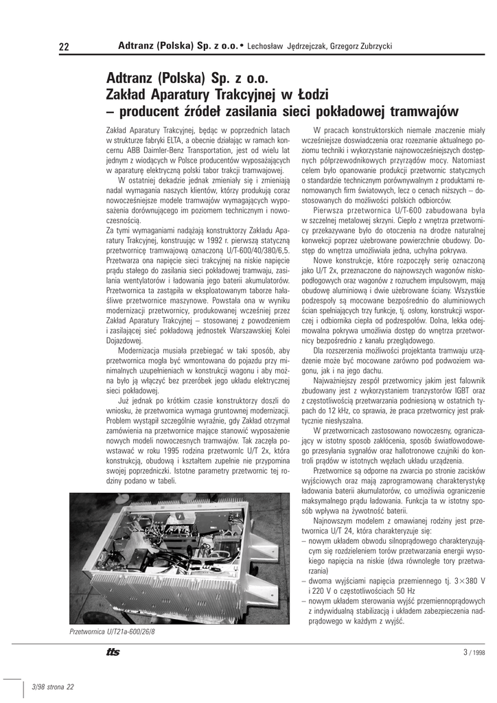Adtranz (Polska) Sp. z o.o.• Lechos³aw Jêdrzejczak, Grzegorz Zubrzycki 22 Adtranz (Polska) Sp. z o.o. Zak³ad Aparatury Trakcyjnej w £odzi – producent Ÿróde³ zasilania sieci pok³adowej tramwajów Zak³ad Aparatury Trakcyjnej, bêd¹c w poprzednich latach w strukturze fabryki ELTA, a obecnie dzia³aj¹c w ramach koncernu ABB Daimler-Benz Transportation, jest od wielu lat jednym z wiod¹cych w Polsce producentów wyposa¿aj¹cych w aparaturê elektryczn¹ polski tabor trakcji tramwajowej. W ostatniej dekadzie jednak zmienia³y siê i zmieniaj¹ nadal wymagania naszych klientów, którzy produkuj¹ coraz nowoczeœniejsze modele tramwajów wymagaj¹cych wyposa¿enia dorównuj¹cego im poziomem technicznym i nowoczesnoœci¹. Za tymi wymaganiami nad¹¿aj¹ konstruktorzy Zak³adu Aparatury Trakcyjnej, konstruuj¹c w 1992 r. pierwsz¹ statyczn¹ przetwornicê tramwajow¹ oznaczon¹ U/T-600/40/380/6,5. Przetwarza ona napiêcie sieci trakcyjnej na niskie napiêcie pr¹du sta³ego do zasilania sieci pok³adowej tramwaju, zasilania wentylatorów i ³adowania jego baterii akumulatorów. Przetwornica ta zast¹pi³a w eksploatowanym taborze ha³aœliwe przetwornice maszynowe. Powsta³a ona w wyniku modernizacji przetwornicy, produkowanej wczeœniej przez Zak³ad Aparatury Trakcyjnej – stosowanej z powodzeniem i zasilaj¹cej sieæ pok³adow¹ jednostek Warszawskiej Kolei Dojazdowej. Modernizacja musia³a przebiegaæ w taki sposób, aby przetwornica mog³a byæ wmontowana do pojazdu przy minimalnych uzupe³nieniach w konstrukcji wagonu i aby mo¿na by³o j¹ w³¹czyæ bez przeróbek jego uk³adu elektrycznej sieci pok³adowej. Ju¿ jednak po krótkim czasie konstruktorzy doszli do wniosku, ¿e przetwornica wymaga gruntownej modernizacji. Problem wyst¹pi³ szczególnie wyraŸnie, gdy Zak³ad otrzyma³ zamówienia na przetwornice maj¹ce stanowiæ wyposa¿enie nowych modeli nowoczesnych tramwajów. Tak zaczê³a powstawaæ w roku 1995 rodzina przetwornlc U/T 2x, która konstrukcj¹, obudow¹ i kszta³tem zupe³nie nie przypomina swojej poprzedniczki. Istotne parametry przetwornic tej rodziny podano w tabeli. W pracach konstruktorskich niema³e znaczenie mia³y wczeœniejsze doswiadczenia oraz rozeznanie aktualnego poziomu techniki i wykorzystanie najnowoczeœniejszych dostêpnych pó³przewodnikowych przyrz¹dów mocy. Natomiast celem by³o opanowanie produkcji przetwornic statycznych o standardzie technicznym porównywalnym z produktami renomowanych firm œwiatowych, lecz o cenach ni¿szych – dostosowanych do mo¿liwoœci polskich odbiorców. Pierwsza przetwornica U/T-600 zabudowana by³a w szczelnej metalowej skrzyni. Ciep³o z wnêtrza przetwornicy przekazywane by³o do otoczenia na drodze naturalnej konwekcji poprzez u¿ebrowane powierzchnie obudowy. Dostêp do wnêtrza umo¿liwia³a jedna, uchylna pokrywa. Nowe konstrukcje, które rozpoczê³y seriê oznaczon¹ jako U/T 2x, przeznaczone do najnowszych wagonów niskopod³ogowych oraz wagonów z rozruchem impulsowym, maj¹ obudowê aluminiow¹ i dwie u¿ebrowane œciany. Wszystkie podzespo³y s¹ mocowane bezpoœrednio do aluminiowych œcian spe³niaj¹cych trzy funkcje, tj. os³ony, konstrukcji wsporczej i odbiornika ciep³a od podzespo³ów. Dolna, lekka odejmowalna pokrywa umo¿liwia dostêp do wnêtrza przetwornicy bezpoœrednio z kana³u przegl¹dowego. Dla rozszerzenia mo¿liwoœci projektanta tramwaju urz¹dzenie mo¿e byæ mocowane zarówno pod podwoziem wagonu, jak i na jego dachu. Najwa¿niejszy zespó³ przetwornicy jakim jest falownik zbudowany jest z wykorzystaniem tranzystorów IGBT oraz z czêstotliwoœci¹ przetwarzania podniesion¹ w ostatnich typach do 12 kHz, co sprawia, ¿e praca przetwornicy jest praktycznie nies³yszalna. W przetwornicach zastosowano nowoczesny, ograniczaj¹cy w istotny sposob zak³ócenia, sposób œwiat³owodowego przesy³ania sygna³ów oraz hallotronowe czujniki do kontroli pr¹dów w istotnych wêz³ach uk³adu urz¹dzenia. Przetwornice s¹ odporne na zwarcia po stronie zacisków wyjœciowych oraz maj¹ zaprogramowan¹ charakterystykê ³adowania baterii akumulatorów, co umo¿liwia ograniczenie maksymalnego pr¹du ³adowania. Funkcja ta w istotny sposób wp³ywa na ¿ywotnoœæ baterii. Najnowszym modelem z omawianej rodziny jest przetwornica U/T 24, która charakteryzuje siê: – nowym uk³adem obwodu silnopr¹dowego charakteryzuj¹cym siê rozdzieleniem torów przetwarzania energii wysokiego napiêcia na niskie (dwa równoleg³e tory przetwarzania) – dwoma wyjœciami napiêcia przemiennego tj. 3×380 V i 220 V o czêstotliwoœciach 50 Hz – nowym uk³adem sterowania wyjœæ przemiennopr¹dowych z indywidualn¹ stabilizacj¹ i uk³adem zabezpieczenia nadpr¹dowego w ka¿dym z wyjœæ. Przetwornica U/T21a-600/26/8 3 / 1998 3/98 strona 22 23 Typ przetwornicy Moc wyjœciowa Napiêcie wyjœciowa Wymiary S×W×D 6,5 kW 40 V DC 3×280 V AC 36 2/3 Hz 560×415×1100 U/T 21-600/26/8 8 kW 26 V DC 620×408×962 112N, 114N Gdañsk U/T 21a-600/26/8 8 kW 26 V DC 620×408×962 Wagony „Tatra” RT6-N Poznañ U/T-600/40/380/6,5 Stosowana w tramwaju 805N, 105N U/T 22-600/26/380/8,5 8,5 kW 6 kW 2,5 kVA 26 V DC 3×280 V AC 36 2/3 Hz 620×408×1162 805Na £ódŸ U/T 22a-600/26/380/8,5 8,5 kW 6 kW 2,5 kVA 26 V DC 3×380 V AC 50 Hz 620×408×1162 do pierwszej wersji 116Na U/T 23-600/40/380/8,5 8,5 kW 6 kW 2,5 kVA 40 V DC 3×280 V AC 36 2/3 Hz 620×408×1162 modernizowane wagony 105N2K U/T 23a-600/40/380/8,5 6,5 (8,5) kW 4 kW 2,5 kVA 40 V DC 3×280 V AC 36 2/3 Hz 620×408×1162 105N2K Warszawa 10 kW 6 kW 2,5 kVA 0,5 kW 26 V DC 3×380 V AC 50 Hz 220 V AC 50 Hz 620×408×1162 116Na Warszawa U/T 24-600/26/380/220/10 Zaprojektowanie tak g³êboko zmodernizowanego typu przetwornicy spowodowane jest: – pojawieniem siê w najnowszym modelu tramwaju zapotrzebowania na dwa ró¿ne napiêcia przemienne o znacznie zaostrzonych wymaganiach elektrycznych, – wyczerpaniem siê technicznych mo¿liwoœci modernizacji po