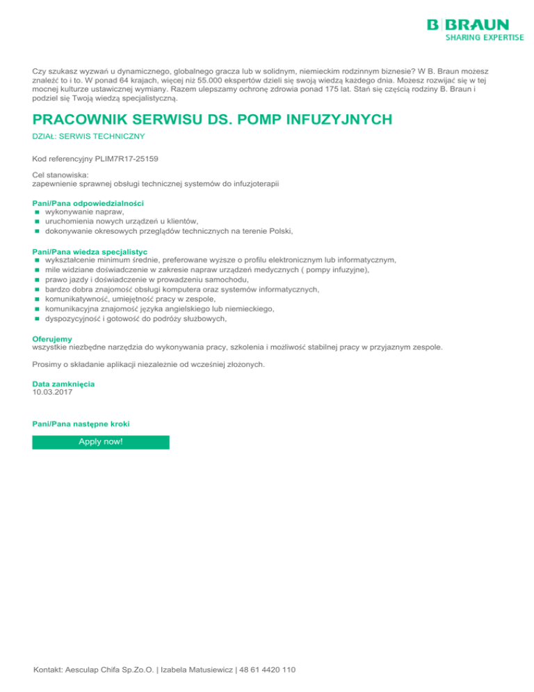 Czy szukasz wyzwań u dynamicznego, globalnego gracza lub w solidnym, niemieckim rodzinnym biznesie? W B. Braun możesz znaleźć to i to. W ponad 64 krajach, więcej niż 55.000 ekspertów dzieli się swoją wiedzą każdego dnia. Możesz rozwijać się w tej mocnej kulturze ustawicznej wymiany. Razem ulepszamy ochronę zdrowia ponad 175 lat. Stań się częścią rodziny B. Braun i podziel się Twoją wiedzą specjalistyczną. PRACOWNIK SERWISU DS. POMP INFUZYJNYCH DZIAŁ: SERWIS TECHNICZNY Kod referencyjny PLIM7R17-25159 Cel stanowiska: zapewnienie sprawnej obsługi technicznej systemów do infuzjoterapii Pani/Pana odpowiedzialności wykonywanie napraw, uruchomienia nowych urządzeń u klientów, dokonywanie okresowych przeglądów technicznych na terenie Polski, Pani/Pana wiedza specjalistyc wykształcenie minimum średnie, preferowane wyższe o profilu elektronicznym lub informatycznym, mile widziane doświadczenie w zakresie napraw urządzeń medycznych ( pompy infuzyjne), prawo jazdy i doświadczenie w prowadzeniu samochodu, bardzo dobra znajomość obsługi komputera oraz systemów informatycznych, komunikatywność, umiejętność pracy w zespole, komunikacyjna znajomość języka angielskiego lub niemieckiego, dyspozycyjność i gotowość do podróży służbowych, Oferujemy wszystkie niezbędne narzędzia do wykonywania pracy, szkolenia i możliwość stabilnej pracy w przyjaznym zespole. Prosimy o składanie aplikacji niezależnie od wcześniej złożonych. Data zamknięcia 10.03.2017 Pani/Pana następne kroki Apply now! Kontakt: Aesculap Chifa Sp.Zo.O. | Izabela Matusiewicz | 48 61 4420 110