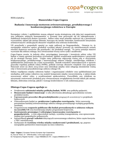 RES(12)5658:4 Stanowisko Copa-Cogeca Badania i innowacja motorem zrównoważonego, produktywnego i konkurencyjnego rolnictwa w Europie Europejscy rolnicy i spółdzielnie muszą odegrać swoją strategiczną rolę jaką jest zaopatrzenie 500 milionów unijnych konsumentów w żywność oraz przyczynić się do zabezpieczenia i stabilizacji światowych dostaw żywności. Sektor rolny musi ponadto zmierzyć się z poważnymi wyzwaniami, takimi jak zmiany klimatu, kurczące się zasoby naturalne, konieczność utrzymania zróżnicowanych i atrakcyjnych obszarów wiejskich oraz ochrona środowiska. UE przechodzi z gospodarki opartej na ropie naftowej na biogospodarkę. Oznacza to, że europejskie rolnictwo oprócz produkcji wysokiej jakości żywności po umiarkowanych cenach również dostarcza surowców dla przemysłu i do produkcji energii. Ta nowa sytuacja stanowi wyzwanie dla sektora rolnego, lecz równocześnie tworzy nowe rynki i możliwości. Copa-Cogeca uważa, że jedynie silny, przyciągający innowacje i inwestycje sektor rolny UE będzie w stanie sprostać przyszłym wyzwaniom, spełnić oczekiwania społeczeństwa i przyczynić się do strategii Europa 2020. Unijne ramy polityczne odgrywają ważną rolę w utrzymaniu konkurencyjnego, produktywnego i innowacyjnego sektora rolnego, umożliwiając rolnikom i spółdzielniom zmierzenie się z tymi wyzwaniami. Kształt wniosków ustawodawczych w sprawie przyszłej wspólnej polityki rolnej (WPR), polityki rozwoju obszarów wiejskich oraz programu Horyzont 2020 na okres 2014-2020 oraz interakcje między nimi odegrają niezmiernie ważną rolę w formowaniu przyszłościowego sektora rolnego UE. Dalsza współpraca między sektorem badań i organizacjami rolników oraz spółdzielniami jest niezbędna, jeśli unijne rolnictwo ma znaleźć kompromis między rzeczywistością, w jakiej działa nowoczesny sektor rolny, a oczekiwaniami społeczeństwa. Pozwoliłaby ona rolnikom na utrzymanie rentowności produkcji przy równoczesnym uwzględnieniu kwestii takich jak zmiany klimatu, dobrostan zwierząt, jakość i wymogi środowiskowe w ich codziennej pracy. Dlatego Copa-Cogeca apeluje o: • • • • • • • • Zwiększenie zależności między polityką badań, WPR oraz polityką spójności, Stosowanie badań i innowacji w celu odwrócenia aktualnego spowolnienia wzrostu produktywności, Uproszczenie procedur dla przedsiębiorstw pragnących uczestniczyć w projektach badawczych Ukierunkowanie badań na praktyczne i opłacalne rozwiązania, które zaowocują powstaniem bardziej zrównoważonego sektora rolnego prowadzącego wydajną gospodarkę zasobami, Zorganizowane wsparcie publiczne dla badań prowadzonych w sektorze rolnym na szczeblu UE oraz koordynację między programami krajowymi, Instrumenty promujące i wdrażające innowacyjne rozwiązania w gospodarstwie, w tym odpowiednie zachęty, wymianę transgraniczną oraz opracowanie unijnej sieci gospodarstw pokazowych, Intensyfikację porad i szkoleń dotyczących nowoczesnego rolnictwa, które często korzysta z TIK i automatyzacji, Zachęcanie do wymiany wiedzy między naukowcami i praktykami, np. poprzez europejskie partnerstwo innowacyjne na rzecz rolnictwa. Copa - Cogeca | European Farmers European Agri-Cooperatives 61, Rue de Trèves | B - 1040 Bruxelles | www.copa-cogeca.eu EU Transparency Register Number | Copa 44856881231-49 | Cogeca 09586631237-74 Europejskie rolnictwo będzie w stanie spełnić oczekiwania społeczeństwa tylko jeśli stanie się konkurencyjne i opłacalne. W związku z tym Copa-Cogeca zdecydowała się na aktywniejszy udział w dyskusjach na temat badań i innowacji w rolnictwie, co ma na celu pomoc w opracowaniu i rozprzestrzenianiu praktycznych rozwiązań. Copa-Cogeca oraz jej członkowie będą ponadto brać aktywny udział w ustalaniu tematów badań oraz priorytetów na szczeblu agronomicznym i politycznym. Są one warunkiem wstępnym do utworzenia ram politycznych opartych na wiedzy. Motor badań i innowacji w unijnym sektorze rolnym Unijne rolnictwo musi znaleźć sposób na sprostanie wielu wyzwaniom, aby można było jak najlepiej wykorzystać jego potencjał. Każde z wyzwań wiąże się z ogromnym wysiłkiem rolników i spółdzielni, jednak pojawienie się wielu trudności naraz, a w niektórych przypadkach pozornych konfliktów interesów, sprawia, że zadania te stają się jeszcze trudniejsze. Rolnictwo musi stawić czoła wzrastającemu zapotrzebowaniu na żywność, pasze i produkty pochodzenia biologicznego oraz czynnikom zagrażającym systemom produkcji podstawowej, jak np. zmiany klimatu oraz nieustannie zmieniające się środowisko produkcyjne UE. Europejskie rolnictwo charakteryzuje się niezwykle zróżnicowanymi warunkami rolnoklimatycznymi, przez co stosowanie transgranicznych innowacji jest problematyczne. Coraz większa nieprzewidywalność pogody oznacza, że standaryzacja procesów produkcji jest również ograniczona. Z ekonomicznego punktu widzenia, udział produkcji podstawowej w łańcuchu wartości skurczył się ze względu na wzrost międzynarodowej wymiany handlowej. Wydaje się, że tendencja ta się utrzyma. Cykle inwestycyjne w rolnictwie są względnie długie ponieważ kapitał jest zazwyczaj uwięziony w gruntach, budynkach i maszynach. Dlatego też dostęp do funduszy niezbędnych do wprowadzenia innowacji w gospodarstwie nie jest łatwy. W wielu dziedzinach obowiązują surowe przepisy, które prowadzą do względnie wysokich kosztów produkcji. Ponieważ kontekst prawny sektora rolnego nieustannie się zmienia, trzeba prowadzić konieczne inwestycje ze znacznym wyprzedzeniem. Dlatego też innowacyjne rozwiązania umożliwiające niskokosztowe przystosowanie się do zmian przepisów lub wymagań rynku są niezmiernie ważne Daleko idące zmiany dotykają również samego zawodu rolnika. Jedna trzecia rolników w UE-27 ma ponad 65 lat (Eurostat 2007). Równocześnie liczba osób gotowych na przej