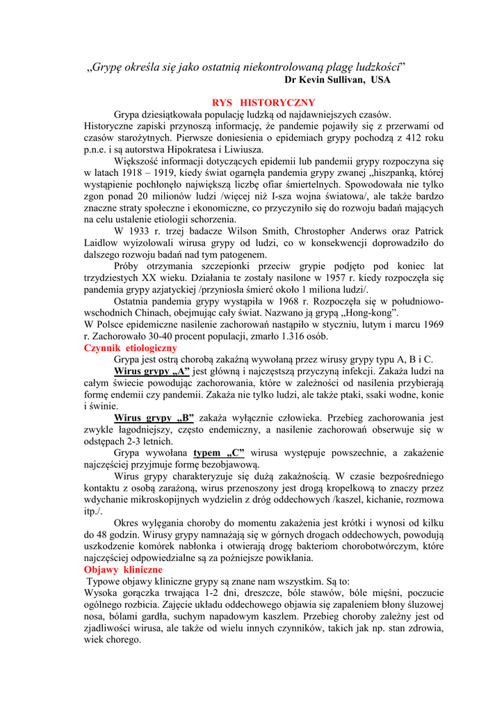„Grypę określa się jako ostatnią niekontrolowaną plagę ludzkości” Dr Kevin Sullivan, USA RYS HISTORYCZY Grypa dziesiątkowała populację ludzką od najdawniejszych czasów. Historyczne zapiski przynoszą informację, że pandemie pojawiły się z przerwami od czasów starożytnych. Pierwsze doniesienia o epidemiach grypy pochodzą z 412 roku p.n.e. i są autorstwa Hipokratesa i Liwiusza. Większość informacji dotyczących epidemii lub pandemii grypy rozpoczyna się w latach 1918 – 1919, kiedy świat ogarnęła pandemia grypy zwanej „hiszpanką, której wystąpienie pochłonęło największą liczbę ofiar śmiertelnych. Spowodowała nie tylko zgon ponad 20 milionów ludzi /więcej niż I-sza wojna światowa/, ale także bardzo znaczne straty społeczne i ekonomiczne, co przyczyniło się do rozwoju badań mających na celu ustalenie etiologii schorzenia. W 1933 r. trzej badacze Wilson Smith, Chrostopher Anderws oraz Patrick Laidlow wyizolowali wirusa grypy od ludzi, co w konsekwencji doprowadziło do dalszego rozwoju badań nad tym patogenem. Próby otrzymania szczepionki przeciw grypie podjęto pod koniec lat trzydziestych XX wieku. Działania te zostały nasilone w 1957 r. kiedy rozpoczęła się pandemia grypy azjatyckiej /przyniosła śmierć około 1 miliona ludzi/. Ostatnia pandemia grypy wystąpiła w 1968 r. Rozpoczęła się w południowowschodnich Chinach, obejmując cały świat. Nazwano ją grypą „Hong-kong”. W Polsce epidemiczne nasilenie zachorowań nastąpiło w styczniu, lutym i marcu 1969 r. Zachorowało 30-40 procent populacji, zmarło 1.316 osób. Czynnik etiologiczny Grypa jest ostrą chorobą zakaźną wywołaną przez wirusy grypy typu A, B i C. Wirus grypy „A” jest główną i najczęstszą przyczyną infekcji. Zakaża ludzi na całym świecie powodując zachorowania, które w zależności od nasilenia przybierają formę endemii czy pandemii. Zakaża nie tylko ludzi, ale także ptaki, ssaki wodne, konie i świnie. Wirus grypy „B” zakaża wyłącznie człowieka. Przebieg zachorowania jest zwykle łagodniejszy, często endemiczny, a nasilenie zachorowań obserwuje się w odstępach 2-3 letnich. Grypa wywołana typem „C” wirusa występuje powszechnie, a zakażenie najczęściej przyjmuje formę bezobjawową. Wirus grypy charakteryzuje się dużą zakaźnością. W czasie bezpośredniego kontaktu z osobą zarażoną, wirus przenoszony jest drogą kropelkową to znaczy przez wdychanie mikroskopijnych wydzielin z dróg oddechowych /kaszel, kichanie, rozmowa itp./. Okres wylęgania choroby do momentu zakażenia jest krótki i wynosi od kilku do 48 godzin. Wirusy grypy namnażają się w górnych drogach oddechowych, powodują uszkodzenie komórek nabłonka i otwierają drogę bakteriom chorobotwórczym, które najczęściej odpowiedzialne są za poźniejsze powikłania. Objawy kliniczne Typowe objawy kliniczne grypy są znane nam wszystkim. Są to: Wysoka gorączka trwająca 1-2 dni, dreszcze, bóle stawów, bóle mięśni, poczucie ogólnego rozbicia. Zajęcie układu oddechowego objawia się zapaleniem błony śluzowej nosa, bólami gardła, suchym napadowym kaszlem. Przebieg choroby zależny jest od zjadliwości wirusa, ale także od wielu innych czynników, takich jak np. stan zdrowia, wiek chorego. Najcięższą postacią grypy jest – pierwotne krwotoczne zapalenie płuc, którego przebieg jest niejednokrotnie piorunujący z towarzyszącą dusznością, sinicą, krwiopluciem. Ta postać grypy w dużym odsetku kończy się zgonem w ciągu 24 godzin. Natomiast przechorowanie pozostawia trwałe zmiany w płucach pod postacią ich zwłóknienia. Powikłania grypy Najczęściej powikłania grypy dotyczą układu oddechowego. Grypowe zapalenie płuc może wystąpić u osób nieobciążonych chorobowo, ale stanowi zagrożenie u pacjentów z przewlekłymi chorobami serca lub płuc i wówczas związane jest z wysoką śmiertelnością. Powikłania ściśle związane z nadkażeniem bakteryjnym to: zapalenie ucha środkowego, zapalenie zatok obocznych nosa, zapalenie oskrzeli, zapalenie płuc. Powikłania grypy to również zaostrzenie chorób przewlekłych np.: nasilenie objawów choroby wieńcowej, niewydolności krążenia, zdekompensowanie cukrzycy, czy też nasilenie napadów astmatycznych. Powikłania grypy ze strony innych układów to: zapalenie opon mózgowordzeniowych, mózgu, Zespół Guillian-Barre, poprzeczne zapalenie rdzenia kręgowego, zapalenie mięśnia sercowego i osierdzia, Zespół Reye’a i inne. Przechorowanie grypy u ciężarnej stwarza ryzyko poronienia. Jedyną metodą zapobiegania zachorowaniu na grypę jest profilaktyka, ponieważ nie istnieje leczenie przyczynowe grypy. Charakterystyczną cechą wirusa grypy jest jego zmienność antygenowa, stąd WHO /Światowa Organizacja Zdrowia/ corocznie uaktualnia antygenowy skład szczepionki na następny sezon epidemiczny. Szczepienia powinny być stosowane w każdym roku przed sezonem epidemicznym. W Polsce szczyt zachorowań na grypę przypada na okres od stycznia do marca, dlatego optymalnym okresem do przeprowadzenia szczepienia przeciw grypie są miesiące od września do początku listopada. Gwarantuje to uzyskanie pełnej odporności przed zachorowaniem. W Programie Szczepień Ochronnych szczepienie przeciwko grypie znajduje się w wykazie szczepień zalecanych przez Ministerstwo Zdrowia /Komunikat Głównego Inspektora Sanitarnego z dnia 15 marca 2004 r. Dz.Urz. Nr 2 poz. 24/. Szczepienia p/grypie są zalecane następującym osobom ze wskazań klinicznych i indywidualnych: - przewlekle chorym /astma, cukrzyca, niewydolność układu krążenia, oddychania, nerek/, - w stanach obniżonej odporności, - w podeszłym wieku Ze wskazań epidemiologicznych: - pracownikom służby zdrowia, szkolnictwa, handlu, transportu, budownictwa oraz osobom narażonym na kontakty z dużą liczbą ludzi, bądź pracującym na otwartej przestrzeni.