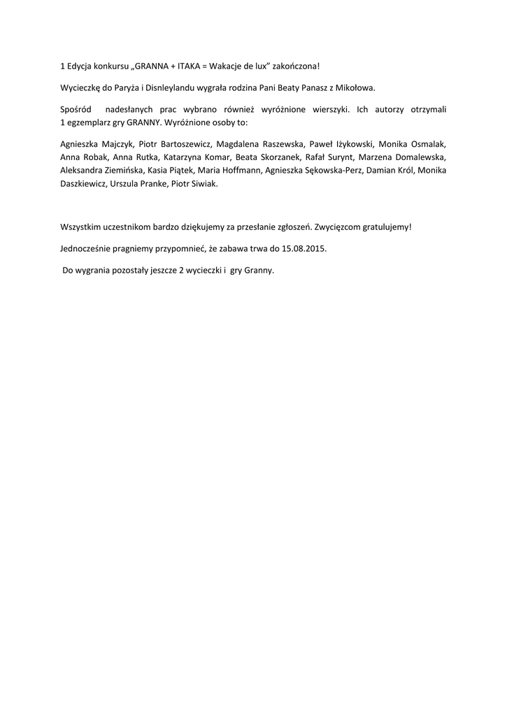 1 Edycja konkursu „GRANNA + ITAKA = Wakacje de lux” zakończona! Wycieczkę do Paryża i Disnleylandu wygrała rodzina Pani Beaty Panasz z Mikołowa. Spośród nadesłanych prac wybrano również wyróżnione wierszyki. Ich autorzy otrzymali 1 egzemplarz gry GRANNY. Wyróżnione osoby to: Agnieszka Majczyk, Piotr Bartoszewicz, Magdalena Raszewska, Paweł Iżykowski, Monika Osmalak, Anna Robak, Anna Rutka, Katarzyna Komar, Beata Skorzanek, Rafał Surynt, Marzena Domalewska, Aleksandra Ziemińska, Kasia Piątek, Maria Hoffmann, Agnieszka Sękowska-Perz, Damian Król, Monika Daszkiewicz, Urszula Pranke, Piotr Siwiak. Wszystkim uczestnikom bardzo dziękujemy za przesłanie zgłoszeń. Zwycięzcom gratulujemy! Jednocześnie pragniemy przypomnieć, że zabawa trwa do 15.08.2015. Do wygrania pozostały jeszcze 2 wycieczki i gry Granny.