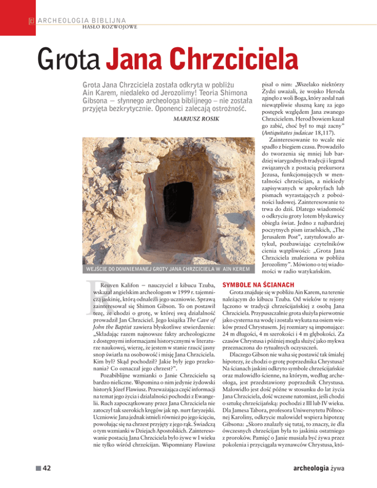 archeologia biblijna hasło rozwojowe Grota Jana Chrzciciela Grota Jana Chrzciciela została odkryta w pobliżu Ain Karem, niedaleko od Jerozolimy! Teoria Shimona Gibsona − słynnego archeologa biblijnego – nie została przyjęta bezkrytycznie. Oponenci zalecają ostrożność. MARIUSZ ROSIK Wejście do domniemanej Groty Jana Chrzciciela w Ain Kerem R Reuven Kalifon − nauczyciel z kibucu Tzuba, wskazał angielskim archeologom w 1999 r. tajemniczą jaskinię, którą odnaleźli jego uczniowie. Sprawą zainteresował się Shimon Gibson. To on postawił tezę, że chodzi o grotę, w której swą działalność prowadził Jan Chrzciciel. Jego książka The Cave of John the Baptist zawiera błyskotliwe stwierdzenie: „Składając razem najnowsze fakty archeologiczne z dostępnymi informacjami historycznymi w literaturze naukowej, wierzę, że jestem w stanie rzucić jasny snop światła na osobowość i misję Jana Chrzciciela. Kim był? Skąd pochodził? Jakie były jego przekonania? Co oznaczał jego chrzest?”. Pozabiblijne wzmianki o Janie Chrzcicielu są bardzo nieliczne. Wspomina o nim jedynie żydowski historyk Józef Flawiusz. Przeważająca część informacji na temat jego życia i działalności pochodzi z Ewangelii. Ruch zapoczątkowany przez Jana Chrzciciela nie zatoczył tak szerokich kręgów jak np. nurt faryzejski. Uczniowie Jana jednak istnieli również po jego ścięciu, powołując się na chrzest przyjęty z jego rąk. Świadczą o tym wzmianki w Dziejach Apostolskich. Zainteresowanie postacią Jana Chrzciciela było żywe w I wieku nie tylko wśród chrześcijan. Wspomniany Flawiusz 42 pisał o nim: „Wszelako niektórzy Żydzi uważali, że wojsko Heroda zginęło z woli Boga, który zesłał nań niewątpliwie słuszną karę za jego postępek względem Jana zwanego Chrzcicielem. Herod bowiem kazał go zabić, choć był to mąż zacny” (Antiquitates judaicae 18,117). Zainteresowanie to wcale nie spadło z biegiem czasu. Prowadziło do tworzenia się mniej lub bardziej wiarygodnych tradycji i legend związanych z postacią prekursora Jezusa, funkcjonujących w mentalności chrześcijan, a niekiedy zapisywanych w apokryfach lub pismach wyrastających z pobożności ludowej. Zainteresowanie to trwa do dziś. Dlatego wiadomość o odkryciu groty lotem błyskawicy obiegła świat. Jedno z najbardziej poczytnych pism izraelskich, „The Jerusalem Post”, zatytułowało artykuł, pozbawiając czytelników cienia wątpliwości: „Grota Jana Chrzciciela znaleziona w pobliżu Jerozolimy”. Mówiono o tej wiadomości w radio watykańskim. Symbole na ścianach Grota znajduje się w pobliżu Ain Karem, na terenie należącym do kibucu Tzuba. Od wieków te rejony łączono w tradycji chrześcijańskiej z osobą Jana Chrzciciela. Przypuszczalnie grota służyła pierwotnie jako cysterna na wodę i została wykuta na osiem wieków przed Chrystusem. Jej rozmiary są imponujące: 24 m długości, 4 m szerokości i 4 m głębokości. Za czasów Chrystusa i później mogła służyć jako mykwa przeznaczona do rytualnych oczyszczeń. Dlaczego Gibson nie waha się postawić tak śmiałej hipotezy, że chodzi o grotę poprzednika Chrystusa? Na ścianach jaskini odkryto symbole chrześcijańskie oraz malowidło ścienne, na którym, według archeologa, jest przedstawiony poprzednik Chrystusa. Malowidło jest dość późne w stosunku do lat życia Jana Chrzciciela, dość wczesne natomiast, jeśli chodzi o sztukę chrześcijańską: pochodzi z III lub IV wieku. Dla Jamesa Tabora, profesora Uniwersytetu Północnej Karoliny, odkrycie malowideł wspiera hipotezę Gibsona: „Skoro znalazły się tutaj, to znaczy, że dla ówczesnych chrześcijan była to jaskinia ostatniego z proroków. Pamięć o Janie musiała być żywa przez pokolenia i przyciągała wyznawców Chrystusa, któ- archeologia żywa archeologia biblijna rzy począwszy od IV wieku zaczęli pielgrzymować do miejsc opisywanych w Biblii”. Uczony dodaje jednak, że wielka szkoda, iż nie znaleziono na ścianach żadnych inskrypcji; te stanowiłyby najlepszy argument za lub przeciw hipotezie. Namaszczenie przy chrzcie? W dół groty prowadzi 28 schodów. U ich nasady znajduje się nisza przypominająca kształtem ludzką stopę. W tym miejscu – sądzi odkrywca – stawał kandydat do chrztu, by przyjąć namaszczenie olejem. Gibson twierdzi, że w grocie dokonywano tak zwanego rytu namaszczenia, który miał przygotowywać do przyjęcia chrztu z rąk Jana. Wyjaśnia go następująco: „Uczeń, po wyjściu z rytualnej kąpieli, stawiał prawą stopę w zagłębieniu, gdzie była ona polewana olejkiem. Uświęcało to jego kroki na nowej drodze życia”. Jego tezę ma potwierdzać znaleziony obok wejścia do groty kamień z wydrążonym rowkiem, służącym ponoć do odprowadzenia ściekającego olejku. W grocie znaleziono także dziesiątki tysięcy fragmentów ceramiki datowanej na I stulecie po Chrystusie. To – zdaniem Gibsona – kolejny argument, że mamy do czynienia z grotą wykorzystywaną za czasów Jana Chrzciciela. Nie ma jednak dowodów na istnienie praktyki namaszczenia przy chrzcie Janowym. Ewangelie nic o niej nie wspominają. Namaszczenie na kartach Biblii nie wiąże się ze chrztem. Czytelnik Starego Testamentu napotka na jego stronach przynajmniej dwie zasadnicze funkcje namaszczenia: pierwsza wskazuje na praktykę medyczną, druga oznacza czynność prawno-rytualną, mającą znaczenie symboliczne i wywołującą istotne skutki w życiu społeczności Izraelitów. W tym drugim przypadku namaszczenie bywa często rozumiane jako konsekracja osoby, czyli jej upoważnienie do wykonywania określonych zadań przewidzianych przez Prawo. Stary Testament zna namaszczenie królewskie, kapłańskie i prorockie. Namaszczenie na króla stanowiło w starożytnym Izraelu część rytuału intronizacji. Podobne zwyczaje panowały wśród innych narodów Bliskiego Wschodu. Starożytna literatura przedchrze