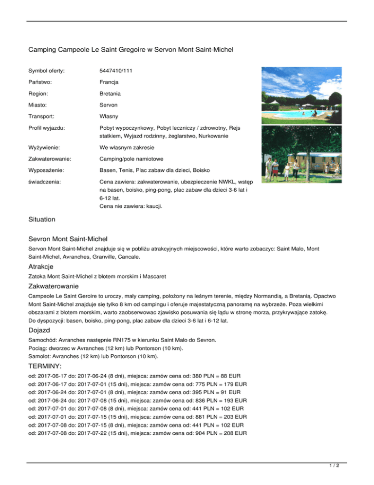 Camping Campeole Le Saint Gregoire w Servon Mont Saint-Michel Symbol oferty: 5447410/111 Państwo: Francja Region: Bretania Miasto: Servon Transport: Własny Profil wyjazdu: Pobyt wypoczynkowy, Pobyt leczniczy / zdrowotny, Rejs Wyżywienie: We własnym zakresie Zakwaterowanie: Camping/pole namiotowe Wyposażenie: Basen, Tenis, Plac zabaw dla dzieci, Boisko świadczenia: Cena zawiera: zakwaterowanie, ubezpieczenie NWKL, wstęp statkiem, Wyjazd rodzinny, żeglarstwo, Nurkowanie na basen, boisko, ping-pong, plac zabaw dla dzieci 3-6 lat i 6-12 lat. Cena nie zawiera: kaucji. Situation Sevron Mont Saint-Michel Servon Mont Saint-Michel znajduje się w pobliżu atrakcyjnych miejscowości, które warto zobaczyc: Saint Malo, Mont Saint-Michel, Avranches, Granville, Cancale. Atrakcje Zatoka Mont Saint-Michel z błotem morskim i Mascaret Zakwaterowanie Campeole Le Saint Geroire to uroczy, mały camping, położony na leśnym terenie, między Normandią, a Bretanią. Opactwo Mont Saint-Michel znajduje się tylko 8 km od campingu i oferuje majestatyczną panoramę na wybrzeże. Poza wielkimi obszarami z błotem morskim, warto zaobserwowac zjawisko posuwania się lądu w stronę morza, przykrywające zatokę. Do dyspozycji: basen, boisko, ping-pong, plac zabaw dla dzieci 3-6 lat i 6-12 lat. Dojazd Samochód: Avranches następnie RN175 w kierunku Saint Malo do Sevron. Pociąg: dworzec w Avranches (12 km) lub Pontorson (10 km). Samolot: Avranches (12 km) lub Pontorson (10 km). TERMINY: od: 2017-06-17 do: 2017-06-24 (8 dni), miejsca: zamów cena od: 380 PLN = 88 EUR od: 2017-06-17 do: 2017-07-01 (15 dni), miejsca: zamów cena od: 775 PLN = 179 EUR od: 2017-06-24 do: 2017-07-01 (8 dni), miejsca: zamów cena od: 395 PLN = 91 EUR od: 2017-06-24 do: 2017-07-08 (15 dni), miejsca: zamów cena od: 836 PLN = 193 EUR od: 2017-07-01 do: 2017-07-08 (8 dni), miejsca: zamów cena od: 441 PLN = 102 EUR od: 2017-07-01 do: 2017-07-15 (15 dni), miejsca: zamów cena od: 881 PLN = 203 EUR od: 2017-07-08 do: 2017-07-15 (8 dni), miejsca: zamów cena od: 441 PLN = 102 EUR od: 2017-07-08 do: 2017-07-22 (15 dni), miejsca: zamów cena od: 904 PLN = 208 EUR 1/2 od: 2017-07-15 do: 2017-07-22 (8 dni), miejsca: zamów cena od: 463 PLN = 107 EUR od: 2017-07-15 do: 2017-07-29 (15 dni), miejsca: zamów cena od: 942 PLN = 217 EUR od: 2017-07-22 do: 2017-07-29 (8 dni), miejsca: zamów cena od: 479 PLN = 110 EUR od: 2017-07-22 do: 2017-08-05 (15 dni), miejsca: zamów cena od: 957 PLN = 220 EUR od: 2017-07-29 do: 2017-08-05 (8 dni), miejsca: zamów cena od: 479 PLN = 110 EUR od: 2017-07-29 do: 2017-08-12 (15 dni), miejsca: zamów cena od: 874 PLN = 201 EUR od: 2017-08-05 do: 2017-08-12 (8 dni), miejsca: zamów cena od: 395 PLN = 91 EUR od: 2017-08-05 do: 2017-08-19 (15 dni), miejsca: zamów cena od: 684 PLN = 158 EUR od: 2017-08-12 do: 2017-08-19 (8 dni), miejsca: zamów cena od: 289 PLN = 67 EUR CENNIK: Długość pobytu: 8 dni 8 dni 15 dni 8 dni 15 dni 8 dni 15 dni 15 dni 8 dni 15 dni 8 dni Grupa cenowa: F A A D D C C E E B B 560 1120 1162 581 1064 532 378 756 826 413 672 336 378 756 826 413 672 336 469 938 1008 504 854 427 Pobyt w obiekcie (do wyboru) domek typu Mobil-Home 4-5-osobowy standardowo dla osób: 5 minimalnie: 4 371 490 980 567 1134 domek typu Super Bengali 5-osobowy standardowo dla osób: 5 238 322 644 399 798 (*) domek typu bungalotel 4-osobowy standardowo dla osób: 4 238 322 644 399 798 domek typu Pagan 5-osobowy standardowo dla osób: 5 280 378 756 490 980 Ubezpieczenie (do wyboru) (*) ubezpieczenie NWKLSKI 7 Ubezpieczenie (opcjonalne) 7 ubezpieczenie od kosztów rezygnacji 2.4 % 2.4 % 14 7 14 7 14 14 7 14 7 2.4 % 2.4 % 2.4 % 2.4 % 2.4 % 2.4 % 2.4 % 2.4 % 2.4 % Waluta: EUR Aktualne ceny z systemu S.A.R.T. (-) - cena usługi, podatku kalkulowana przy osobie lub gratis (*) - kwota wliczona w cenę standardową 2/2