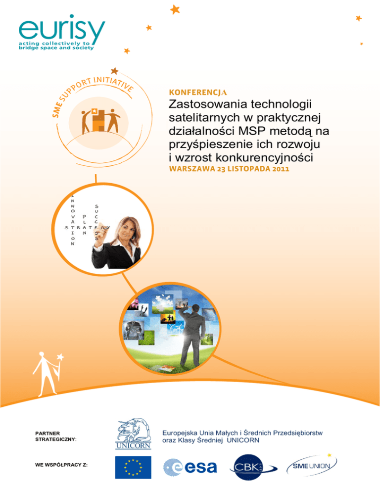 KONFERENCJA Zastosowania technologii satelitarnych w praktycznej działalności MSP metodą na przyśpieszenie ich rozwoju i wzrost konkurencyjności WARSZAWA 23 LISTOPADA 2011 PARTNER STRATEGICZNY: WE WSPÓŁPRACY Z: Europejska Unia Małych i Średnich Przedsiębiorstw oraz Klasy Średniej UNICORN CELE KONFERENCJI Konferencja ma na celu zachęcenie MSP do stosowania osiągnięć technologii satelitarnych poprzez przedstawienie wynikających z tego korzyści ekonomicznych, w szczególności zaś: poinformowanie przedsiębiorców o możliwościach wykorzystania w biznesie osiągnięć satelitarnych wskazanie możliwości wsparcia i funduszy dla MSP dostarczenie politykom i przedstawicielom administracji centralnej wiedzy o rodzaju wsparcia, jakiego potrzebują te MSP, które decydują się na zastosowanie aplikacji satelitarnych PROGRAM KONFERENCJI 09:00 Otwarcie i przemówienia powitalne Jacek Kozłowski, Wojewoda Mazowiecki Jerzy Samborski, Prezes Unicorn Colin Hicks, Prezes Eurisy Marek Banaszkiewicz, Dyrektor Centrum Badań Kosmicznych Polskiej Akademii Nauk 09:20 Przemówienia główne Przewodniczący obrad: Colin Hicks, Prezes Eurisy oraz Jerzy Samborski, Prezes Unicorn Sztandarowe europejskie programy kosmiczne: Jak GMES (Globalny Monitoring Ochrony Środowiska) i Galileo przyczynią się do pobudzenia europejskiej gospodarki? Karlheinz Kreuzberg, Szef Gabinetu Dyrektora Generalnego Europejskiej Agencji Kosmicznej 10:00 Sesja 1 – Wymiana doświadczeń europejskich MSP z zastosowania aplikacji satelitarnych Wystąpią przedstawiciele MSP reprezentujący takie sektory jak: transport i logistyka (zarządzanie flotą, monitorowanie stanu przewożonych towarów, ładunki niebezpieczne, itd.), rolnictwo (GPS, EO - Exterior Orientation, kierowanie maszynami, monitoring zbiorów, mapowanie pól, itd.), leśnictwo (monitoring i zarządzanie flotą/logistyka), budownictwo (projektowanie placów budowy w 3D, kierowanie maszynami, itd.). Powiedzą jak zdobyć przewagę konkurencyjną, uprościć procesy pracy, wprowadzić na rynek nowe produkty i usługi dzięki wykorzystaniu technologii satelitarnych. 11:00 Przerwa na kawę 11:30 Sesja 2 – Wartość dodana wynikająca z zastosowania technologii satelitarnych w biznesie Przewodniczący obrad: Marek Banaszkiewicz, Dyrektor Centrum Badań Kosmicznych Polskiej Akademii Nauk Potencjał zastosowań aplikacji satelitarnych w sektorach innych niż kosmiczny Przedstawiciele dostawców usług satelitarnych Rozwój praktycznych zastosowań aplikacji satelitarnych w transporcie w oparciu o potrzeby użytkownika Przedstawiciel Europejskiej Agencji Kosmicznej, Programu Zintegrowanych Aplikacji (Integrated Applications Programme) Jakie korzyści mogą odnieść MSP jako końcowi odbiorcy, z usług satelitarnych programu GMES (Global Monitoring for Environment and Security czyli Globalnego Monitoringu na rzecz Środowiska i Bezpieczeństwa)? Przedstawiciel Komisji Europejskiej, Dyrekcja Generalna ds. Przedsiębiorstw i Przemysłu – biuro GMES* Rozwój zastosowań apikacji satelitarnych Galileo i EGNOS (European Geostationary Navigation Overlay Service czyli Europejskie Geostacjonarne Usługi Nawigacyjne). Studium przypadku w rolnictwie, transporcie i logistyce Przedstawiciel GNSS (Global Navigation Satellite System) na Europę* 12:30 Lunch 13:30 Sesja 3 – Europejskie MSP dzielą się opisami udanych przedsięwzięć zastosowania satelitarnych technologii w wytwarzaniu nowych produktów i usług Wystąpią przedstawiciele MSP reprezentujący takie sektory jak: energia (zdalny monitoring elektrowni słonecznej/wiatrowej/wodnej, ocena potencjału energii słonecznej/wiatru, itd.), turystyka (możliwość korzystania z szerokopasmowej transmisji danych za pomocą łącza satelitarnego przez leżący na uboczu hotel czy przedsiębiorstwo), ubezpieczenia/prawo (uwierzytelnianie dokumentów oraz monitoring), geodezja (przy użyciu GPS) i marketing (np. globalne lokalizowanie odpowiedzi w ankietach analityki biznesowej). 14:45 Sesja 4 – Wsparcie MSP gotowych do korzystania z innowacyjnych aplikacji satelitarnych: istniejące mechanizmy wspomagające Zwiększanie zdolności zarządzania innowacjami dla MSP Eva Diedrichs, Imp3ove Project Operacyjne wsparcie dla MSP w Polsce Andrzej Arendarski, Prezes Krajowej Izby Gospodarczej, Wiceprezydent EuroChambres Aktywizowanie przedsiębiorczości i konkurencyjności Bożena Lublińska-Kasprzak, Prezes Polskiej Agencji Rozwoju Przedsiębiorczości 15:30 Przerwa na kawę 16:00 Sesja 5 – Okrągły stół: Co jeszcze należy uczynić dla ułatwienia MSP dostępu do aplikacji satelitarnych? Uczestnicy: Przedstawiciele MSP, przedstawiciele instytucji kreujących i zarządzających programami Unii Europejskiej i dostawcy usług satelitarnych. 16:45 Sesja 6 – Podsumowanie i rekomendacje Jerzy Samborski, Prezes Unicorn Colin Hicks, Prezes Eurisy ZAŁOŻENIA Małe i średnie przedsiębiorstwa (MSP) stanowią większość w sektorach europejskiego transportu, handlu detalicznego, budownictwa, rolnictwa, przemysłu czy usług doradztwa, i zapewniają pracę dwóm trzecim ogółu zatrudnionych. Odgrywają kluczową rolę w europejskiej gospodarce i w realizacji strategii Europa 2020, szczególnie w okresie kryzysu finansowo-ekonomicznego. Zastosowanie najnowszych technologii satelitarnych może wesprzeć MSP działające w wymienionych wyżej sektorach poprzez usprawnienie ich funkcjonowania, poprawienie relacji z klientami i dostawcami, oraz zaoszczędzenie czasu, pieniędzy i włożonego wysiłku. Zastosowanie satelitarnych aplikacji może stać się innowacyjnym narzędziem dla MSP, w administracji i w procesie decyzyjnym, poprzez możliwość podniesienia jakości dotychczas oferowanego produktu lub usługi lub wprowadzenia nowych, poszerzenia rynków zbytu i znacznego zwiększenia stopy zysku. Jednak decyzja o wyborze konkretnych rozwiązań i wprowadzenie ich do praktycznego zastosowania wymaga czasu i dostępu do źr