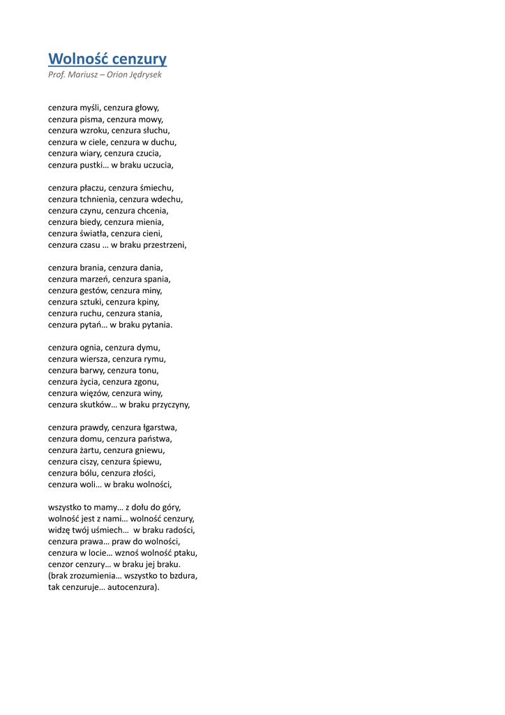 Wolność cenzury Prof. Mariusz – Orion Jędrysek cenzura myśli, cenzura głowy, cenzura pisma, cenzura mowy, cenzura wzroku, cenzura słuchu, cenzura w ciele, cenzura w duchu, cenzura wiary, cenzura czucia, cenzura pustki… w braku uczucia, cenzura płaczu, cenzura śmiechu, cenzura tchnienia, cenzura wdechu, cenzura czynu, cenzura chcenia, cenzura biedy, cenzura mienia, cenzura światła, cenzura cieni, cenzura czasu … w braku przestrzeni, cenzura brania, cenzura dania, cenzura marzeń, cenzura spania, cenzura gestów, cenzura miny, cenzura sztuki, cenzura kpiny, cenzura ruchu, cenzura stania, cenzura pytań… w braku pytania. cenzura ognia, cenzura dymu, cenzura wiersza, cenzura rymu, cenzura barwy, cenzura tonu, cenzura życia, cenzura zgonu, cenzura więzów, cenzura winy, cenzura skutków… w braku przyczyny, cenzura prawdy, cenzura łgarstwa, cenzura domu, cenzura państwa, cenzura żartu, cenzura gniewu, cenzura ciszy, cenzura śpiewu, cenzura bólu, cenzura złości, cenzura woli… w braku wolności, wszystko to mamy… z dołu do góry, wolność jest z nami… wolność cenzury, widzę twój uśmiech… w braku radości, cenzura prawa… praw do wolności, cenzura w locie… wznoś wolność ptaku, cenzor cenzury… w braku jej braku. (brak zrozumienia… wszystko to bzdura, tak cenzuruje… autocenzura).