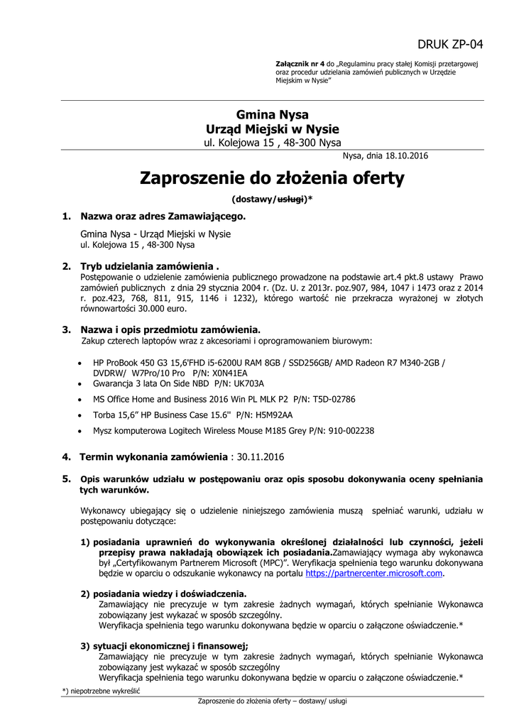 DRUK ZP-04 Załącznik nr 4 do „Regulaminu pracy stałej Komisji przetargowej oraz procedur udzielania zamówień publicznych w Urzędzie Miejskim w Nysie” Gmina Nysa Urząd Miejski w Nysie ul. Kolejowa 15 , 48-300 Nysa Nysa, dnia 18.10.2016 Zaproszenie do złożenia oferty (dostawy/usługi)* 1. Nazwa oraz adres Zamawiającego. Gmina Nysa - Urząd Miejski w Nysie ul. Kolejowa 15 , 48-300 Nysa 2. Tryb udzielania zamówienia . Postępowanie o udzielenie zamówienia publicznego prowadzone na podstawie art.4 pkt.8 ustawy Prawo zamówień publicznych z dnia 29 stycznia 2004 r. (Dz. U. z 2013r. poz.907, 984, 1047 i 1473 oraz z 2014 r. poz.423, 768, 811, 915, 1146 i 1232), którego wartość nie przekracza wyrażonej w złotych równowartości 30.000 euro. 3. Nazwa i opis przedmiotu zamówienia. Zakup czterech laptopów wraz z akcesoriami i oprogramowaniem biurowym: HP ProBook 450 G3 15,6'FHD i5-6200U RAM 8GB / SSD256GB/ AMD Radeon R7 M340-2GB / DVDRW/ W7Pro/10 Pro P/N: X0N41EA Gwarancja 3 lata On Side NBD P/N: UK703A Torba 15,6” HP Business Case 15.6'' P/N: H5M92AA MS Office Home and Business 2016 Win PL MLK P2 P/N: T5D-02786 Mysz komputerowa Logitech Wireless Mouse M185 Grey P/N: 910-002238 4. Termin wykonania zamówienia : 30.11.2016 5. Opis warunków udziału w postępowaniu oraz opis sposobu dokonywania oceny spełniania tych warunków. Wykonawcy ubiegający się o udzielenie niniejszego zamówienia muszą postępowaniu dotyczące: spełniać warunki, udziału w 1) posiadania uprawnień do wykonywania określonej działalności lub czynności, jeżeli przepisy prawa nakładają obowiązek ich posiadania.Zamawiający wymaga aby wykonawca był „Certyfikowanym Partnerem Microsoft (MPC)”. Weryfikacja spełnienia tego warunku dokonywana będzie w oparciu o odszukanie wykonawcy na portalu https://partnercenter.microsoft.com. 2) posiadania wiedzy i doświadczenia. Zamawiający nie precyzuje w tym zakresie żadnych wymagań, których spełnianie Wykonawca zobowiązany jest wykazać w sposób szczególny. Weryfikacja spełnienia tego warunku dokonywana będzie w oparciu o załączone oświadczenie.* 3) sytuacji ekonomicznej i finansowej; Zamawiający nie precyzuje w tym zakresie żadnych wymagań, których spełnianie Wykonawca zobowiązany jest wykazać w sposób szczególny Weryfikacja spełnienia tego warunku dokonywana będzie w oparciu o załączone oświadczenie.* *) niepotrzebne wykreślić Zaproszenie do złożenia oferty – dostawy/ usługi Ocena spełnienia warunków udziału w postępowaniu będzie przeprowadzona w oparciu o przedłożone przez wykonawców dokumenty i oświadczenia, wg formuły „spełnia – nie spełnia”. 6. Wykaz oświadczeń lub dokumentów, jakie mają dostarczyć wykonawcy w celu potwierdzenia spełnienia warunków udziału w postępowaniu. W celu potwierdzenia spełniania warunków udziału w postępowaniu, o których mowa w pkt.5 Wykonawca zobowiązany jest złożyć następujące oświadczenia i dokumenty: 1) aktualny odpis z właściwego rejestru, lub z centralnej ewidencji i informacji o działalności gospodarczej, jeżeli odrębne przepisy wymagają wpisu do rejestru lub ewidencji, wystawiony nie wcześniej niż 6 miesięcy przed upływem terminu składania ofert, oświadczenie o spełnieniu warunków udziału w postępowaniu określonych w zaproszeniu 7. Termin związania ofertą. Wykonawca pozostaje związany złożoną ofertą przez 30 dni. Bieg terminu związania ofertą rozpoczyna się wraz z upływem terminu składania ofert. 8. Opis sposobu przygotowywania oferty. 1. Wymagania podstawowe. 1) Każdy Wykonawca może złożyć tylko jedną ofertę i zaproponować tylko jedną cenę. 2) Oferta musi obejmować całość zamówienia. Zamawiający nie dopuszcza możliwości składania ofert częściowych i wariantowych . 9. Miejsce oraz termin składania i otwarcia ofert. 1. Miejsce oraz termin składania ofert - Urząd Miejski Nysa ul. Kolejowa 15; sekretariat Burmistrza Nysy pok. nr 102 ( I piętro) - do dnia 26.10.2016r. do godziny 12:00 Ofertę należy złożyć w nieprzezroczystej, zabezpieczonej przed otwarciem kopercie (paczce). Kopertę (paczkę) należy opisać następująco: Nazwa i adres Wykonawcy Gmina Nysa Urząd Miejski w Nysie ul. Kolejowa 15, 48-300 Nysa „Oferta w trybie zaproszenia do złożenia oferty na dostawę Laptopów” Nie otwierać przed dniem: 26.10.2016 r. godzina 12:00 2. Miejsce oraz termin otwarcia ofert - Urząd Miejski w Nysie ul. Kolejowa 15 w pokoju nr 230 ( II piętro) w dniu 26.10.2016r. o godzinie 12:10 10. Opis kryteriów, którymi zamawiający będzie się kierował przy wyborze oferty Oferty zostaną ocenione przez Zamawiającego w oparciu o następujące kryteria i ich znaczenie: Lp. 1 Kryterium Cena ( C ) Znaczenie procentowe kryterium 100% Maksymalna ilość punktów jakie może otrzymać oferta za dane kryterium 100 W przypadku kryterium "Cena" oferta otrzyma zaokrągloną do dwóch miejsc po przecinku ilość punktów wynikającą z działania: gdzie: Pi(C) *) niepotrzebne wykreślić Pi (C) = C min • Max (C) Ci ilość punktów jakie otrzyma oferta "i" za kryterium "Cena"; Zaproszenie do złożenia oferty – dostawy/ usługi Cmin Ci Max (C) najniższa cena spośród wszystkich ważnych i nieodrzuconych ofert; cena oferty "i"; maksymalna ilość punktów jakie może otrzymać oferta za kryterium "Cena". 11. Sposób porozumiewania się z Wykonawcami 1. 2. 3. W niniejszym postępowaniu oświadczenia, wnioski, zawiadomienia oraz informacje Zamawiający i Wykonawcy przekazują pisemnie lub drogą elektroniczną. Osobą upoważnioną przez Zamawiającego do kontaktowania się z Wykonawcami jest Łukasz Sroka, email: [email protected] fax. +48 774332705 Wykonawca może zwrócić się do Zamawiającego o wyjaśnienie treści zaproszenia 12. Informację o udzieleniu zamówienia: Po wyborze najkorzystniejszej oferty Zamawiający udzieli Wykonawcy zamówienia w formie pisemnej. ……………………