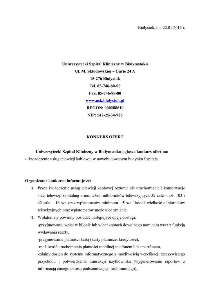 Białystok, dn. 22.01.2015 r. Uniwersytecki Szpital Kliniczny w Białymstoku Ul. M. Skłodowskiej – Curie 24 A 15-276 Białystok Tel. 85-746-80-00 Fax. 85-746-88-80 www.usk.bialystok.pl REGON: 000288610 NIP: 542-25-34-985 KONKURS OFERT Uniwersytecki Szpital Kliniczny w Białymstoku ogłasza konkurs ofert na: - świadczenie usług telewizji kablowej w nowobudowanym budynku Szpitala. Organizator konkursu informuje że: 1. Przez świadczenie usług telewizji kablowej rozumie się uruchomienie i konserwację sieci telewizji szpitalnej z montażem odbiorników telewizyjnych 32 cale – szt. 103 i 42 cale – 16 szt. oraz wpłatomatów minimum - 5 szt. Ilości i wielkość odbiorników telewizyjnych oraz wpłatomatów może ulec zmianie. 2. Wpłatomaty powinny posiadać następujące opcje obsługi: -przyjmowanie wpłat w bilonie lub w banknotach dowolnego nominału wraz z funkcją wydawania reszty, -przyjmowanie płatności kartą (karty płatnicze, kredytowe), -możliwość uruchomienia płatności mobilnej telefonem lub smartfonem, -zdalny dostęp do systemu informatycznego z możliwością weryfikacji rzeczywistego przychodu i potwierdzenia transakcji użytkownika (wygenerowanie raportów z informacją danego okresu podsumowując ilość transakcji), -monitorowanie umożliwiające dokładne przeanalizowanie reklamacji, -w zależności od potrzeb- możliwość umieszczenia dodatkowych informacji na ekranie bankomatu lub na telewizorach np. aktualne dyżury lekarzy czy i formacje o samym szpitalu 3. Organizator wymaga aby czas dostępu do programów telewizyjnych kształtował się w przedziale minimum od 1 godziny do 72 godzin. 4. Organizator wymaga uruchomienia i konserwacji sygnału telewizyjnego w pokojach personelu. 5. Organizator wymaga przekazu minimum 24 programów telewizyjnych. 6. Propozycja czynszu powinna zawierać procentową opłatę od kwoty netto wpłat za wykupiony dostęp do programów telewizyjnych. 7. Na wniosek zainteresowanych istnieje możliwość przeprowadzenia wizji lokalnej. 8. Organizator wymaga aby operator miał uregulowany stosunek ze stowarzyszeniami odnośnie praw autorskich. Warunki uczestnictwa w konkursie: 1. Zaświadczenie o niezaleganiu z zapłatą należności wobec ZUS i US. Oświadczenie oferenta o nieprowadzeniu wobec Oferenta postępowania egzekucyjnego, upadłościowego, układowego, oświadczenia przez oferenta, że nie została ogłoszona jego upadłość lub likwidacja. Zaświadczenia z ZUS i US winno być wystawione nie wcześniej niż 3 miesiące przed terminem składania ofert. 2. Zaświadczenie ( kopię poświadczoną za zgodność z oryginałem ) o wpisie do rejestru przedsiębiorców telekomunikacyjnych w Urzędzie Komunikacji Elektronicznej. 3. Wpis do Krajowego Rejestru Sądowego bądź do Ewidencji Działalności Gospodarczej 4. Uzgodnienie sposobu montażu odbiorników telewizyjnych i wpłatomatów z wykonawcą inwestycji (BUDIMEX). Umowa zostanie zawarta od 1.02.2015 r. z możliwością przesunięcia terminu od momentu przekazania nowobudowanych budynków przez Uniwersytet Medyczny w Białymstoku po zaakceptowaniu treści umowy przez organ tworzący Uniwersytet Medyczny w Białymstoku na okres pięciu lat z możliwością dalszego jej przedłużenia – dotyczy zapisu do umowy. Podmioty zainteresowane zapraszamy do składania ofert w budynku administracji Uniwersyteckiego Szpitala Klinicznego w Białymstoku - Domek Szwedzki w Białymstoku przy ul. M. Skłodowskiej - Curie 24A 15-276 Białystok tj. Kancelaria do dnia 30.01.2015r. godz. 10. Rozstrzygnięcie konkursu nastąpi tego samego dnia o godz. 11. Oferty należy składać w kopertach, które powinny zawierać wszystkie dane oferenta i spełniać wszystkie warunki przedstawione w ogłoszeniu. Na kopercie musi widnieć napis o treści „Konkurs – telewizja kablowa” Oferty, które nie będą spełniać wymogów, o których mowa w ogłoszeniu – zostaną odrzucone. Uniwersytecki Szpital Kliniczny w Białymstoku zastrzega możliwość unieważnienia postępowania konkursowego na każdym etapie bez podania przyczyn. Osoba do kontaktu: Piotr Kołos tel. 693-301-887 lub 85-746-88-47