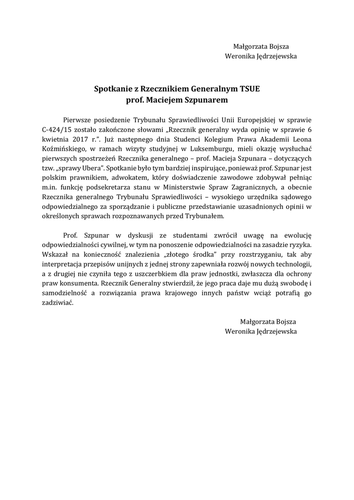 Małgorzata Bojsza Weronika Jędrzejewska Spotkanie z Rzecznikiem Generalnym TSUE prof. Maciejem Szpunarem Pierwsze posiedzenie Trybunału Sprawiedliwości Unii Europejskiej w sprawie C-424/15 zostało zakończone słowami „Rzecznik generalny wyda opinię w sprawie 6 kwietnia 2017 r.”. Już następnego dnia Studenci Kolegium Prawa Akademii Leona Koźmińskiego, w ramach wizyty studyjnej w Luksemburgu, mieli okazję wysłuchać pierwszych spostrzeżeń Rzecznika generalnego – prof. Macieja Szpunara – dotyczących tzw. „sprawy Ubera”. Spotkanie było tym bardziej inspirujące, ponieważ prof. Szpunar jest polskim prawnikiem, adwokatem, który doświadczenie zawodowe zdobywał pełniąc m.in. funkcję podsekretarza stanu w Ministerstwie Spraw Zagranicznych, a obecnie Rzecznika generalnego Trybunału Sprawiedliwości – wysokiego urzędnika sądowego odpowiedzialnego za sporządzanie i publiczne przedstawianie uzasadnionych opinii w określonych sprawach rozpoznawanych przed Trybunałem. Prof. Szpunar w dyskusji ze studentami zwrócił uwagę na ewolucję odpowiedzialności cywilnej, w tym na ponoszenie odpowiedzialności na zasadzie ryzyka. Wskazał na konieczność znalezienia „złotego środka” przy rozstrzyganiu, tak aby interpretacja przepisów unijnych z jednej strony zapewniała rozwój nowych technologii, a z drugiej nie czyniła tego z uszczerbkiem dla praw jednostki, zwłaszcza dla ochrony praw konsumenta. Rzecznik Generalny stwierdził, że jego praca daje mu dużą swobodę i samodzielność a rozwiązania prawa krajowego innych państw wciąż potrafią go zadziwiać. Małgorzata Bojsza Weronika Jędrzejewska