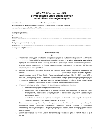 UMOWA nr ……………./20… o świadczenie usług edukacyjnych na studiach niestacjonarnych zawarta w dniu ………………………. we Wrocławiu, pomiędzy: POLITECHNIKĄ WROCŁAWSKĄ, Wybrzeże Wyspiańskiego 27, 50-370 Wrocław reprezentowaną przez Dziekana Wydziału …………………………………………..............................................……, ………………………………………………………………………………………………...............................................… zwaną dalej Uczelnią; a Panią/Panem ……………………………………………………………………………..………......................................... zam. …………………………………………………………………………………………………....................................... legitymującym/-cą się: (seria, nr) ……………………………………………………………............................................ PESEL: ……………………………………………………………………………………………….................................... zwaną/-ym dalej Studentem Przedmiot umowy §1 1. Przedmiotem umowy jest świadczenie usług edukacyjnych na studiach niestacjonarnych na Wydziale ……………… Politechniki Wrocławskiej oraz warunki odpłatności za te usługi edukacyjne na studiach wyższych prowadzonych przez Uczelnię jako studia: pierwszego stopnia licencjackie/inżynierskie*, drugiego stopnia magisterskie* w formie niestacjonarnej, obejmujących ….. punktów ECTS, oraz wzajemne prawa i obowiązki Stron. 2. Uczelnia zobowiązuje się wobec Studenta do realizacji planu studiów i programu kształcenia na kierunku ………………………………….. ……………………… (jeśli w języku obcym – to podać w jakim) zgodnie z ustawą z dnia 27 lipca 2005 r. Prawo o szkolnictwie wyższym (Dz. U. z 2012 r. poz. 572, z późn. zm.), zwaną dalej Ustawą i przepisami wykonawczymi oraz po spełnieniu wymagań wynikających z programu kształcenia do wydania dyplomu potwierdzającego uzyskanie tytułu zawodowego …………….., zgodnie z Regulaminem studiów wyższych w Politechnice Wrocławskiej. 3. W ramach świadczenia usług edukacyjnych Uczelnia zapewnia Studentowi m.in. : prowadzenie zajęć przez wyspecjalizowaną kadrę; prowadzenie zajęć programowych w pomieszczeniach przeznaczonych do realizacji zajęć dydaktycznych, pracowniach specjalistycznych i laboratoriach językowych wyposażonych w odpowiedni sprzęt; korzystanie z biblioteki z czytelnią i dostępem do internetu oraz bezpłatne korzystanie z internetu w wyznaczonych do tego miejscach w Uczelni. 4. Student zobowiązuje się do postępowania zgodnie z treścią ślubowania oraz do przestrzegania postanowień Statutu Politechniki Wrocławskiej, Regulaminu studiów wyższych w Politechnice Wrocławskiej oraz innych zarządzeń i decyzji wydanych przez władze Uczelni obowiązujących w trakcie trwania studiów. 5. Student zobowiązuje się wobec Uczelni do terminowego uiszczania opłat, o których mowa w § 2 umowy. 1 Opłaty na studiach niestacjonarnych §2 1. Uczelnia pobiera a Student zobowiązuje się wnosić następujące opłaty na studiach niestacjonarnych: a) opłatę za studia niestacjonarne, b) opłatę za powtarzanie zajęć z powodu niezadowalających wyników w nauce, c) opłatę za zajęcia dydaktyczne (kursy/grupy kursów) wynikające z różnic programowych (w przypadku zmiany kierunku studiów, uczelni, lub wydziału albo zmiany systemu studiów, po wznowieniu studiów itp.), w wysokości równej opłacie za powtarzanie kursu z powodu niezadowalających wyników w nauce. 2. Wysokość pobieranej przez Uczelnię opłaty za studia niestacjonarne i opłaty za powtarzanie kursów z powodu niezadowalających wyników w nauce ustala co roku Rektor Politechniki Wrocławskiej, z tym że wysokości tych opłat nie mogą przekraczać kosztów ponoszonych w Uczelni w zakresie niezbędnym do uruchomienia i prowadzenia tych studiów, z uwzględnieniem kosztów przygotowania i wdrażania strategii rozwoju Uczelni, w szczególności rozwoju kadr naukowych i infrastruktury dydaktycznonaukowej, w tym amortyzacji i remontów (art. 99 ust. 2 ustawy Prawo o szkolnictwie wyższym). 3. Wysokość opłaty za studia niestacjonarne i za powtarzanie zajęć z powodu niezadowalających wyników w nauce nie ulega zmianie w trakcie roku akademickiego. 4. Wysokość opłaty za studia niestacjonarne, ustalonej na rok akademicki …….. wynosi: za semestr zimowy - ………………………… zł, za semestr letni - ……………………….. zł. 5. Opłata semestralna za studia niestacjonarne w wysokości jak za semestr letni obowiązywać będzie w kolejnych latach akademickich, o ile nie zostanie ustalona, w trybie określonym w ust. 2, nowa jej wysokość, która obowiązywać będzie Strony bez konieczności sporządzania aneksu do umowy. 6. Jeśli w kolejnym roku studiów wysokość opłaty, o której mowa w ust. 1 lit. a) i w ust. 4, ustalonej przez Rektora Politechniki Wrocławskiej, wzrośnie o 10% lub więcej w stosunku do roku poprzedniego, to opłata ta za aktualny rok studiów wyniesie 110 % opłaty za rok poprzedni. 7. W przypadku, gdy dni płatności wypadają w dni wolne od pracy (soboty, niedziele, święta) terminy płatności przesuwa się na pierwszy dzień roboczy przypadający po ustalonym dniu płatności. 8. Opłata za powtarzanie w roku akademickim …… kursów na studiach niestacjonarnych zaocznych z powodu niezadowalających wyników w nauce jest jednakowa za każdą kolejną realizację (powtórkę) kursu i wynosi a) za powtarzanie kursu „projekt inżynierski”, „praca dyplomowa inżynierska/licencjacka”, itp. (na studiach I stopnia) rozumianego jako dzieło 600,00 zł b) za powtarzanie kursu „praca dyplomowa magisterska” (na studiach II stopn