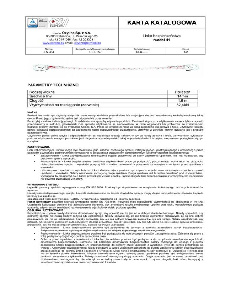 KARTA KATALOGOWA Importer Oxyline Sp. z o.o. 95-200 Pabianice, ul. Piłsudskiego 23 tel.: 42 2151068 fax: 42 2032031 www.oxyline.eu email: [email protected] Linka bezpieczeństwa model 41 Norma: Jednostka certyfikująca i kontrolująca: Nr katalogowy: Strona EN 354 CE 0159 CLX…… 1/2 PARAMETRY TECHNICZNE: Rodzaj włókna Średnica liny Długość Wytrzymałość na rozciąganie (zerwanie) Poliester 14mm 1,5 m 32,4kN WAŻNE Produkt ten może być używany wyłącznie przez osoby właściwie przeszkolone lub znajdujące się pod bezpośrednią kontrolą wzrokową takiej osoby. Przed jego użyciem niezbędne jest odpowiednie przeszkolenie. Przeczytaj uważnie instrukcję obsługi. Przedstawia ona sposoby używania produktu. Producent dopuszcza użytkowanie sprzętu tylko w sposób przedstawiony w instrukcji, jakiekolwiek inne sposoby użytkowania są niedozwolone: W razie wątpliwości lub problemów ze zrozumieniem instrukcji prosimy zwrócić się do Productos Climax, S.A, Prace na wysokości niosą ze sobą zagrożenie dla zdrowia i życia. Użytkownik sprzętu ponosi całkowitą odpowiedzialność za zapewnienie sobie odpowiedniego przeszkolenia, zarówno w zakresie technik działania jak i środków bezpieczeństwa. Użytkownik ponosi pełne ryzyko i odpowiedzialność za wszelkiego rodzaju szkody, w tym za utratę zdrowia i życia, we wszelkich sytuacjach podczas użytkowania naszych produktów, jeśli nie jest on w stanie ponieść takiej odpowiedzialności lub ryzyka, nie powinien posługiwać się tym sprzętem. ZASTOSOWANIA Linki zabezpieczające Climax mogą być stosowane jako składnik osobistego sprzętu zatrzymującego, podtrzymującego i chroniącego przed upadkiem z wysokości pod warunkiem użytkowania w połączeniu z urządzeniem samohamownym lub amortyzatorem bezpieczeństwa. Zatrzymywanie - Linka zabezpieczająca uniemożliwia dojście pracownika do strefy zagrożenia upadkiem. Nie ma możliwości, aby pracownik upadł z wysokości. Podtrzymywanie - Linka bezpieczeństwa umożliwia użytkownikowi pracę „w podparciu", pozostawiając wolne ręce. W przypadku niebezpieczeństwa upadku z wysokości powyżej 0,5 m można zastosować w połączeniu ze sprzętem chroniącym przed upadkiem z wysokości. ochrona przed upadkiem z wysokości - Linka zabezpieczająca powinna być używana w połączeniu ze sprzętem chroniącym przed upadkiem z wysokości. Należy oszacować wymaganą drogę spadania. Droga spadania jest to wolna przestrzeń pod użytkownikiem, wymagana, by nie uderzył on o żadną przeszkodę w razie upadku. Łączna długość linki zabezpieczającej z amortyzatorem i łącznikami nie powinna przekraczać 2 metrów. WYMAGANIA SYSTEMU Łączniki powinny spełniać wymagania normy EN 362:2004. Powinny być dopasowane do urządzenia kotwiczącego lub innych składników systemu. Nie używać niedopasowanego sprzętu. Łączniki niedopasowane do innych składników sprzętu mogą ulegać przypadkowemu otwarciu. Łączniki powinny być zgodne ze sprzętem pod względem wielkości, kształtu i wytrzymałości, niezależnie od kierunku spadania. Punkt kotwiczący powinien spełniać wymagania normy EN 795:1986. Powinien mieć odpowiednią wytrzymałość na obciążenia (> 10 kN). Urządzenie kotwiczące powinno być zainstalowane starannie, aby zmniejszyć ryzyko swobodnego upadku oraz ruchu wahadłowego podczas spadania, a tym samym zmniejszyć ryzyko uderzenia o jakikolwiek obiekt podczas upadku. OBSŁUGA I UŻYTKOWANIE Przed każdym użyciem należy dokładnie skontrolować sprzęt, aby upewnić się, że jest on w dobrym stanie technicznym. Należy sprawdzić, czy elementy sprzętu nie noszą śladów zużycia lub uszkodzenia. Należy upewnić się, że nie brakuje elementów metalowych, że są one dobrze zamocowane, że nie są odkształcone. Należy sprawdzić, czy nie ma ostrych krawędzi, zadziorów, rys ani korozji. Należy skontrolować, czy zatrzaski lub karabinki z zamkiem automatycznym działają prawidłowo. Należy sprawdzić, czy lina lub taśma nie nosi śladów zużycia, przecięcia, przypalenia, czy nie ma postrzępionych krawędzi, pęknięć lub innych uszkodzeń. Zatrzymywanie - Linka bezpieczeństwa powinna być podłączona do jednego z punktów zaczepienia szelek bezpieczeństwa. Połączenie to powinno zapobiegać dojściu użytkownika do miejsca zagrożonego upadkiem z wysokości. Podtrzymywanie - Linka bezpieczeństwa powinna być podłączona do obu bocznych punktów zaczepienia pasa. Zabrania się pracy z linką podłączoną do jednego punktu zaczepienia pasa. Ochrona przed upadkiem z wysokości - Linka bezpieczeństwa powinna być podłączona do urządzenia samohamownego lub do amortyzatora bezpieczeństwa. Zatrzaśnik lub karabinek amortyzatora bezpieczeństwa należy podłączyć do jednego z punktów zaczepienia szelek bezpieczeństwa (A) przeznaczonego do ochrony przed upadkiem z wysokości (tylko do punktu przedniego lub tylnego), Amortyzator bezpieczeństwa należy podłączyć w części z pakietem absorbera do punktu zaczepienia szelek bezpieczeństwa przeznaczonego do ochrony przed upadkiem z wysokości. Drugi koniec amortyzatora należy podłączyć do urządzenia kotwiczącego lub do łącznika punktu kotwiczenia. Miejsce zakotwiczenia sytemu ochrony przed upadkiem powinno być umiejscowione ponad punktem zaczepienia użytkownika. Należy oszacować wymaganą drogę spadania, Droga spadania jest to wolna przestrzeń pod użytkownikiem, wymagana, by nie uderzył on o żadną przeszkodę w razie upadku. Łączna długość linki zabezpieczającej z amortyzatorem i łącznikami nie powinna przekraczać 2 metrów. Importer Oxyline Sp. z o.o. 95-200 Pabianice, ul. Piłsudskiego 23 tel.: 42 2151068 fax: 42 2032031 www.oxyline.eu email: [email protected] Linka bezpieczeństwa model 41 Norma: Jednostka certyfikująca i kontrolująca: Nr katalogowy: Strona EN 354 CE 0159 CLX…… 2/2 OKRES UŻYTKOWANIA Teoretycznie okres uż