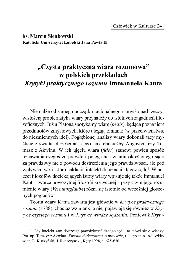 Człowiek w Kulturze 24 ks. Marcin Sieńkowski Katolicki Uniwersytet Lubelski Jana Pawła II „Czysta praktyczna wiara rozumowa” w polskich przekładach Krytyki praktycznego rozumu Immanuela Kanta Niemalże od samego początku racjonalnego namysłu nad rzeczywistością problematyka wiary przynależy do istotnych zagadnień filozoficznych. Już u Platona spotykamy wiarę (pistis), będącą poznaniem przedmiotów zmysłowych, które ulegają zmianie (w przeciwieństwie do niezmiennych idei). Pogłębionej analizy wiary dokonali tacy myśliciele świata chrześcijańskiego, jak chociażby Augustyn czy Tomasz z Akwinu. W ich ujęciu wiara (fides) stanowi pewien sposób uznawania czegoś za prawdę i polega na uznaniu określonego sądu za prawdziwy nie z powodu dostrzeżenia jego prawdziwości, ale pod wpływem woli, która nakłania intelekt do uznania tegoż sądu1. W poczet filozofów dociekających istoty wiary wpisuje się także Immanuel Kant – twórca nowożytnej filozofii krytycznej – przy czym jego rozumienie wiary (Vernunftglaube) różni się istotnie od wcześniej głoszonych poglądów. Teoria wiary Kanta zawarta jest głównie w Krytyce praktycznego rozumu (1788), chociaż wzmianki o niej pojawiają się również w Krytyce czystego rozumu i w Krytyce władzy sądzenia. Ponieważ Kryty Gdy intelekt sam dostrzega prawdziwość danego sądu, to mówi się o wiedzy. Por. np. Tomasz z Akwinu, Kwestie dyskutowane o prawdzie, t. 1, przeł. A. Aduszkiewicz, L. Kuczyński, J. Ruszczyński, Kęty 1998, s. 625-630. 1 264 ks. Marcin Sieńkowski ka praktycznego rozumu dotyczy moralności, można się spodziewać, że problem wiary zostanie ukazany w łączności z ludzkim postępowaniem moralnym. Celem tego postępowania jest dobro najwyższe ukonstytuowane przez moralność i proporcjonalną do niej szczęśliwość. Dlatego też dobro najwyższe – przedmiot rozumu praktycznego – stanowi kontekst analizowania problemu wiary. Na jej określenie Kant wprowadza zupełnie nowe złożone wyrażenie: „czysta praktyczna wiara rozumowa”2. Takie określenie wiary domaga się głębszej analizy, ponieważ na pierwszy rzut oka nie jest ono łatwe do zrozumienia. W dodatku jest to określenie filozoficzne, stanowiące element całego systemu Kanta. Pierwotnie zostało ono sformułowane w języku niemieckim, ale z uwagi na znaczenie Kanta w filozofii w ogóle jest ono, wraz z całym dziełem, tłumaczone na szereg języków, w tym również na język polski. Zazwyczaj adepci filozofii zapoznają się z filozofią królewieckiego myśliciela poprzez przekłady jego dzieł na ich rodzime języki, a dopiero później, nieliczni, sięgają do oryginału. Wiadomo też, że filozofia Kanta nie należy do najłatwiejszych. Poziom jej trudności dodatkowo wzrasta z racji stosowanego przez autora Krytyki zawiłego języka niemieckiego, co w konsekwencji utrudnia tłumaczom oddanie sensu twierdzeń zawartych w jego pismach. W sumie bardzo wiele zależy od tego, jak tłumaczenie ma się do oryginału i do systemu filozoficznego, ale ową relację można ustalić tylko wówczas, gdy posiada się dystans zarówno do systemu, jak i do oryginału i tłumaczenia. Zachowując taki dystans, spróbujemy 2 Skonstruowane przez Kanta wyrażenie „ein reiner prakticher Vernunftglaube” w przekładzie na język angielski brzmi: „a faith of pure practical reason”; zob. I. Kant, The Critique of Practical Reason, w: tenże, The Critique of Pure Reason. The Critique of Practical Reason and Other Ethical Treatises. The Critique of Judgement, przeł. T. Kingsmill Abbott, William Benton Publisher, Chicago–London–Toronto 1952, s. 354. W wolnym tłumaczeniu tego określenia z angielskiego na polski otrzymujemy: wiara czystego praktycznego rozumu. Skoro Kant obok czystego rozumu teoretycznego wyróżnia czysty rozum praktyczny, to nie dziwi określenie „wiara czystego praktycznego rozumu”. Natomiast tłumaczenie niemieckiego wyrażenia na język polski jako „czysta praktyczna wiara rozumowa” wiarę czyni czystą i praktyczną, a nie rozum. „Czysta praktyczna wiara rozumowa” w polskich przekładach 265 zatem zanalizować krótki fragment Krytyki praktycznego rozumu, poświęcony wierze. Napotykamy w nim na szereg trudności natury filozoficznej oraz językowej. Do najważniejszych przeszkód językowych w rozumieniu koncepcji wiary w polskich tłumaczeniach należy zaliczyć: brak dookreśleń niektórych wyrazów, częste zastępowanie rzeczowników zaimkami, niepoprawny szyk wyrazów w zdaniu oraz zbyt długie zdania. Te translatorskie uchybienia sprawiają, że czytelnik jest zmuszony do wielokrotnego przyswajania sobie tekstu tłumaczenia, a nawet do posiłkowania się oryginałem, a to wymaga znajomości języka niemieckiego. Należy zatem przyjrzeć się polskim przekładom interesującego nas fragmentu Krytyki pod kątem ogólnie przyjętych kryteriów przekładu, aby przekonać się, czy ich autorzy stosują je w swoich tłumaczeniach. W pierwszej kolejności zostaną scharakteryzowane polskie przekłady Krytyki, potem zostaną omówione kryteria przekładu, następnie zostaną wskazane konkretne trudności związane z odbiorem polskich tłumaczeń oraz sposoby ich przezwyciężenia. W wyniku tych analiz zostanie przedstawiona dydaktyczna propozycja odrębnego tłumaczenia fragmentu Krytyki, która uwzględnia istotne postulaty poprawnego przekładu i która stanowi pomoc w lepszym zrozumieniu poglądów Kanta na temat „czystej praktycznej wiary rozumowej”. Przekłady Krytyki praktycznego rozumu na język polski Polscy czytelnicy mają dziś dostęp do trzech przekładów Krytyki praktycznego rozumu. Dwa z nich powstały w 1911 roku, a następny blisko 60 lat później – w 1970 roku. Autorami pierwszych tłumaczeń są Feliks Kierski i Benedykt Bornstein3. Trzeciego przekładu 3 Bornstein przygotował swój przekład na podstawie Krytyki praktycznego rozumu zredagowanej w 1906 roku p