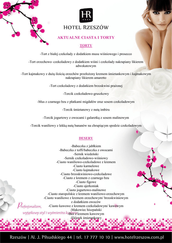 AKTUALNE CIASTA I TORTY TORTY -Tort z białej czekolady z dodatkiem musu wiśniowego i prosecco -Tort orzechowo–czekoladowy z dodatkiem wiśni i czekolady nakrapiany likierem adwokatowym -Tort kajmakowy z dużą ilością orzechów przełożony kremem śmietankowym i kajmakowym nakrapiany likierem amaretto -Tort czekoladowy z dodatkiem brzoskwini prażonej -Torcik czekoladowo-gruszkowy -Mus z czarnego bzu z płatkami migdałów oraz sosem czekoladowym -Torcik śmietanowy z nutą imbiru -Torcik jogurtowy z owocami i galaretką z sosem malinowym -Torcik waniliowy z lekką nutą bananów na chrupiącym spodzie czekoladowym DESERY -Babeczka z jabłkiem -Babeczka z toffi/babeczka z owocami -Sernik wiedeński -Sernik czekoladowo-wiśniowy -Ciasto waniliowo-czekoladowe z kremem -Ciasto karmelowe -Ciasto kajmakowe -Ciasto brzoskwiniowo-czekoladowe -Ciasto z kremem z czarnego bzu -Ciasto figowe -Ciasto ajerkoniak -Ciasto jogurtowo-malinowe -Ciasto staropolskie z kremem waniliowo-orzechowym -Ciasto waniliowe z kremem orzechowym/ brzoskwiniowym z dodatkiem owoców -Ciasto kawowe z kremem czekoladowym/ kawowym -Makowiec hiszpański -Bez z kremem kawowym -Eklerek śmietankowy - Rolady owocowe -Brulle z owocami -Muffiny z nadzieniami -Tarta z sezonowymi owocami Ciasteczka bufet wesela: Krajanka, kokosanki, kocie oczka. Bufety słodkie: - czekoladowo miętowa panna cotta, - baci di dama (ciasteczka czekoladowe), - tarta z białą czekoladą i malinami, - krem z białej czekolady z musem brzoskwiniowym, - ciasto węgierskie, - klasyczne Brownie czekoladowe, - tarta czekoladowa z figami, - galaretka ze świeżej pomarańczy i grejpfruta, - mini eklerki, - ciasto kawowe, -sernik limonkowy (sernik na zimno), - krem tiramisu