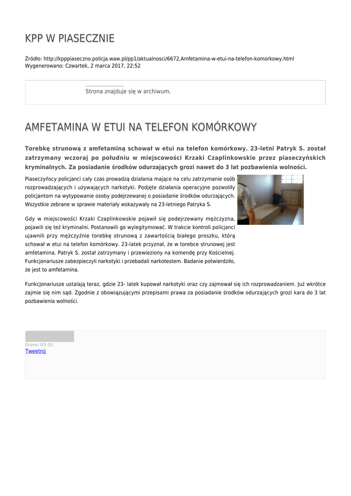 KPP W PIASECZNIE Źródło: http://kpppiaseczno.policja.waw.pl/pp1/aktualnosci/6672,Amfetamina-w-etui-na-telefon-komorkowy.html Wygenerowano: Czwartek, 2 marca 2017, 22:52 Strona znajduje się w archiwum. AMFETAMINA W ETUI NA TELEFON KOMÓRKOWY Torebkę strunową z amfetaminą schował w etui na telefon komórkowy. 23-letni Patryk S. został zatrzymany wczoraj po południu w miejscowości Krzaki Czaplinkowskie przez piaseczyńskich kryminalnych. Za posiadanie środków odurzających grozi nawet do 3 lat pozbawienia wolności. Piaseczyńscy policjanci cały czas prowadzą działania mające na celu zatrzymanie osób rozprowadzających i używających narkotyki. Podjęte działania operacyjne pozwoliły policjantom na wytypowanie osoby podejrzewanej o posiadanie środków odurzających. Wszystkie zebrane w sprawie materiały wskazywały na 23-letniego Patryka S. Gdy w miejscowości Krzaki Czaplinkowskie pojawił się podejrzewany mężczyzna, pojawili się też kryminalni. Postanowili go wylegitymować. W trakcie kontroli policjanci ujawnili przy mężczyźnie torebkę strunową z zawartością białego proszku, którą schował w etui na telefon komórkowy. 23-latek przyznał, że w torebce strunowej jest amfetamina. Patryk S. został zatrzymany i przewieziony na komendę przy Kościelnej. Funkcjonariusze zabezpieczyli narkotyki i przebadali narkotestem. Badanie potwierdziło, że jest to amfetamina. Funkcjonariusze ustalają teraz, gdzie 23- latek kupował narkotyki oraz czy zajmował się ich rozprowadzaniem. Już wkrótce zajmie się nim sąd. Zgodnie z obowiązującymi przepisami prawa za posiadanie środków odurzających grozi kara do 3 lat pozbawienia wolności. Ocena: 0/5 (0) Tweetnij