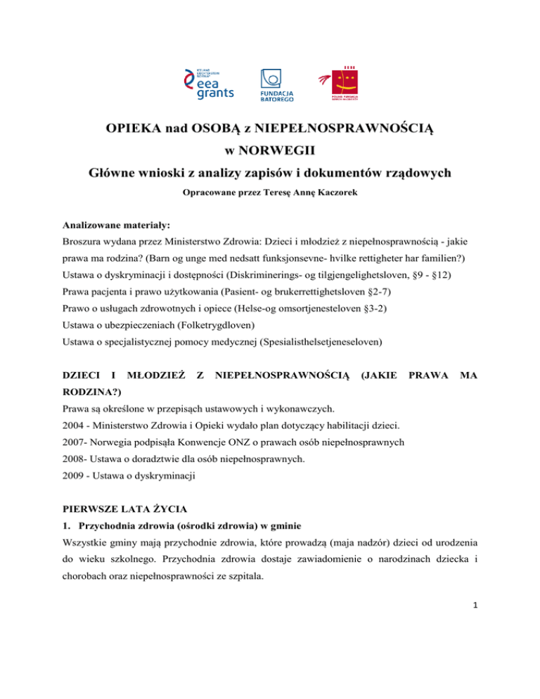 OPIEKA nad OSOBĄ z NIEPEŁNOSPRAWNOŚCIĄ w NORWEGII Główne wnioski z analizy zapisów i dokumentów rządowych Opracowane przez Teresę Annę Kaczorek Analizowane materiały: Broszura wydana przez Ministerstwo Zdrowia: Dzieci i młodzież z niepełnosprawnością - jakie prawa ma rodzina? (Barn og unge med nedsatt funksjonsevne- hvilke rettigheter har familien?) Ustawa o dyskryminacji i dostępności (Diskriminerings- og tilgjengelighetsloven, §9 - §12) Prawa pacjenta i prawo użytkowania (Pasient- og brukerrettighetsloven §2-7) Prawo o usługach zdrowotnych i opiece (Helse-og omsortjenesteloven §3-2) Ustawa o ubezpieczeniach (Folketrygdloven) Ustawa o specjalistycznej pomocy medycznej (Spesialisthelsetjeneseloven) DZIECI I MŁODZIEŻ Z NIEPEŁNOSPRAWNOŚCIĄ (JAKIE PRAWA MA RODZINA?) Prawa są określone w przepisąch ustawowych i wykonawczych. 2004 - Ministerstwo Zdrowia i Opieki wydało plan dotyczący habilitacji dzieci. 2007- Norwegia podpisąła Konwencje ONZ o prawach osób niepełnosprawnych 2008- Ustawa o doradztwie dla osób niepełnosprawnych. 2009 - Ustawa o dyskryminacji PIERWSZE LATA ŻYCIA 1. Przychodnia zdrowia (ośrodki zdrowia) w gminie Wszystkie gminy mają przychodnie zdrowia, które prowadzą (maja nadzór) dzieci od urodzenia do wieku szkolnego. Przychodnia zdrowia dostaje zawiadomienie o narodzinach dziecka i chorobach oraz niepełnosprawności ze szpitala. 1 2. Szpital. Matka ma urlop macierzyński po narodzinach dziecka( z pełnym wynagrodzeniem). Ojciec nie ma prawa do wynagrodzenia od pracodawcy, ale może dostać zasiłek opiekuńczy z ubezpieczenia społecznego. Rodzice otrzymują potrzebne doradztwo i pomoc od pracownika socjalnego w szpitalu. Dziecko poniżej 18 roku życia ma prawo do obecności matki/ ojca podczas pobytu w szpitalu. Co najmniej jeden z rodziców powinien otrzymać możliwość zakwaterowania na czas pobytu w szpitalu. Rodzice dostają zwrot pieniędzy za wyżywienie, transport i nocleg. Pobyt, leczenie i leki są bezpłatne i dotyczą zarówno państwowych jaki i prywatnych szpitali (które maja umowę z regionalna instytucja zdrowia). 3. Prawo do informacji Dziecko ma prawo do informacji o chorobie, ale bierze się tutaj pod uwagę wiek, dojrzałość i inne czynniki np. kulturowe, pochodzenie... Jeśli pacjent jest poniżej 16 roku życia zarówno pacjent jak i rodzice otrzymują informacje o chorobie. Ale pacjent pomiędzy 12 i 16 rokiem życia może się nie zgodzić na udzielenie informacji o jego chorobie rodzicom. 4. Zgoda rodziców dotycząca opieki medycznej. Rodzice maja prawo do wyrażenia zgody na opiekę medyczna dla dziecka do 16 roku życia. Od 12 roku życia dziecko ma prawo do wypowiadania się na temat wszystkich pytań dotyczących swojego zdrowia. Młodzież miedzy 16 a 18 rokiem życia jest uprawniona do wyrażania zgody jeśli chodzi o opiekę zdrowotną. Ale zgoda może być umorzona , jeśli niepełnosprawność utrudnia zrozumienie co ta zgoda oznacza. Jeśli dziecko nie zgadza się na pomoc medyczna , personel medyczny musi zdecydować co jest najlepsze dla pacjenta. 5. Rehabilitacja 2 Po wyjściu dziecka ze szpitala ośrodek zdrowia (gminny) przejmuje odpowiedzialność leczenia i stworzenia odpowiednich warunków do życia dla całej rodziny. Gmina ma odpowiedzialność za rehabilitacje. NAV (ADMINISTRACJA PRACY I OPIEKI SPOLECZNEJ) OFERUJE RODZINOM POMOC W POSTACI: Zasiłek pielęgnacyjny, przysługuje opiekunom dzieci do 12 roku życia dziecka, jeśli dziecko choruje na choroby przewlekle oraz do 18 roku dla dzieci z niepełnosprawnością. Oboje rodzice (opiekunowie) mogą dostać ten zasiłek jeśli dziecko przebywa w szpitalu albo innej instytucji leczniczej. Ta osoba, która opiekuje się dzieckiem niepełnosprawnym , które jest chore na chorobę która zagraża życiu lub jest chorobą bardzo poważną ,ma prawo do zasiłku pielęgnacyjnego mimo, że dziecko skończyło 18 lat. Ten zasiłek może być podzielony pomiędzy obydwoje rodziców , jedno z rodziców dostaje pieniądze przez pierwsze 2 tygodnie, następnie dwa drugi z rodziców. Stawka zasiłku jest równa wynagrodzeniu z pracy. Przysługuje tez dodatek urlopowy. Świadczenia opiekuńcze gdy dziecko jest chore Przysługują rodzicom, gdy dziecko jest chore. Przysługuje na dzieci do 12 roku życia i do 18 roku, gdy dziecko jest chore na chorobę chroniczna albo dziecko jest niepełnosprawne. Pieniądze wypłacane są do 10 dni (rok kalendarzowy) przez pracodawcę, po tym czasie przez ubezpieczalnie. Rodzicom dzieci niepełnosprawnych przysługuje 40 dni (po 20 na każdego z rodziców). Rodzice mogą dostać do 3 dni kalendarzowych za jednym razem. Świadczenia podstawowe (Grunnstønad) Są wypłacane przez ubezpieczalnie raz w miesiącu, i od tych świadczeń nie jest podatek odprowadzany. Są one dodatkiem do innych świadczeń. Jest ten zasiłek przyznawany dla 3 rodziców dzieci, które są chore co najmniej 2 lata. Stawka świadczenia jest różna. Ten zasiłek można dostać : jako pomoc pienieżną na sprzęt techniczny transport, np. samochód pies dla niewidzących telefon protezy na żywność, gdy dieta jest kosztowna na ubrania, buty, pościel Zasiłek roczny (hjelpestønad) . Jest rekompensatą za szczególną opiekę / dogląd dziecka podczas choroby, urazu, albo wrodzonej niepełnosprawności. Obejmuje chorobę trwająca co najmniej 2 lata. Nie ma ograniczenia wiekowego do tego zasiłku. Może go dostać więcej niż jedno dziecko w rodzinie. Warunkiem otrzymania tego zasiłku jest konieczność zatrudnienia osoby prywatnej do opieki, tzn. rodziców, innych członków rodziny albo sąsiadów. NAV - OFERTA DLA RODZIN Powiększona kwota zasiłku rocznego. Mogą się starać o niego osoby dla dzieci poniżej 18 roku życia, które potrzebują bardziej wymagającej opieki, czy bardziej skomplikowanego treningu lub częstszego doglądu spowodowanego choroba. W tym przypadku potrzebna jest bardziej szczegółowa dokumentacja, k