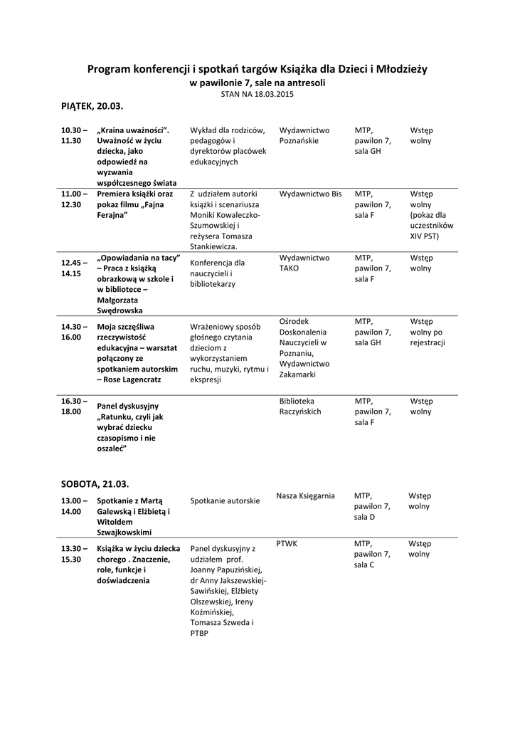 Program konferencji i spotkań targów Książka dla Dzieci i Młodzieży w pawilonie 7, sale na antresoli STAN NA 18.03.2015 PIĄTEK, 20.03. 10.30 – 11.30 11.00 – 12.30 12.45 – 14.15 14.30 – 16.00 16.30 – 18.00 „Kraina uważności”. Uważność w życiu dziecka, jako odpowiedź na wyzwania współczesnego świata Premiera książki oraz pokaz filmu „Fajna Ferajna” „Opowiadania na tacy” – Praca z książką obrazkową w szkole i w bibliotece – Małgorzata Swędrowska Moja szczęśliwa rzeczywistość edukacyjna – warsztat połączony ze spotkaniem autorskim – Rose Lagencratz Wykład dla rodziców, pedagogów i dyrektorów placówek edukacyjnych Wydawnictwo Poznańskie MTP, pawilon 7, sala GH Wstęp wolny Z udziałem autorki książki i scenariusza Moniki KowaleczkoSzumowskiej i reżysera Tomasza Stankiewicza. Wydawnictwo Bis MTP, pawilon 7, sala F Wstęp wolny (pokaz dla uczestników XIV PST) Wydawnictwo TAKO MTP, pawilon 7, sala F Wstęp wolny Ośrodek Doskonalenia Nauczycieli w Poznaniu, Wydawnictwo Zakamarki MTP, pawilon 7, sala GH Wstęp wolny po rejestracji Biblioteka Raczyńskich MTP, pawilon 7, sala F Wstęp wolny Nasza Księgarnia MTP, pawilon 7, sala D Wstęp wolny PTWK MTP, pawilon 7, sala C Wstęp wolny Konferencja dla nauczycieli i bibliotekarzy Wrażeniowy sposób głośnego czytania dzieciom z wykorzystaniem ruchu, muzyki, rytmu i ekspresji Panel dyskusyjny „Ratunku, czyli jak wybrać dziecku czasopismo i nie oszaleć” SOBOTA, 21.03. 13.00 – 14.00 Spotkanie z Martą Galewską i Elżbietą i Witoldem Szwajkowskimi Spotkanie autorskie 13.30 – 15.30 Książka w życiu dziecka chorego . Znaczenie, role, funkcje i doświadczenia Panel dyskusyjny z udziałem prof. Joanny Papuzińskiej, dr Anny JakszewskiejSawińskiej, Elżbiety Olszewskiej, Ireny Koźmińskiej, Tomasza Szweda i PTBP 16.00 – 18.00 "Czy to prawda, że poeta lubi deszcz..." – Emilia Waśniowska. Program poświęcony Emilii Waśniowskiej w 10. rocznicę śmierci. Wykład inaugurujący prof. Joanna Papuzińska Skład Kulturalny, Wydawnictwo Mila Stowarzyszenie Łejery, , PTWK MTP, pawilon 7, sala G Wstęp wolny ZAiKS MTP, pawilon 7, sala B Wstęp wolny ZAiKS MTP, pawilon 7, sala B Wstęp wolny Media Rodzina, PTWK MTP, pawilon 7, sala D Wstęp wolny NIEDZIELA 22.03. 10.30 – 11.30 ABC prawa autorskiego – czyli miniprzewodnik jak korzystać z twórczości innych Warsztaty dla młodzieży szkolnej od 14 lat 11:3012:30 I ty jesteś twórcą Podstawowe pojęcia prawa autorskiego. Warsztaty dla dzieci (9-13 lat) 12:00 – 13:00 Sztuka przekładu Spotkanie z autorami przekładów: prof. Elizą PieciulKarmińską (prowadzenie) oraz Bogusławą Sochańską
