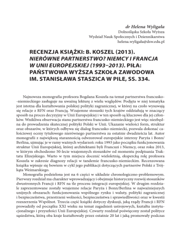 dr Helena Wyligała Dolnośląska Szkoła Wyższa Wydział Nauk Społecznych i Dziennikarstwa helena.wyligał[email protected] RECENZJA KSIĄŻKI: B. KOSZEL (2013). NIERÓWNE PARTNERSTWO? NIEMCY I FRANCJA W UNII EUROPEJSKIEJ (1993–2013). PIŁA: PAŃSTWOWA WYŻSZA SZKOŁA ZAWODOWA IM. STANISŁAWA STASZICA W PILE, SS. 334. Najnowsza monografia profesora Bogdana Koszela na temat partnerstwa francusko-niemieckiego zasługuje na uważną lekturę z wielu względów. Podjęta w niej tematyka jest istotna dla kształtowania polskiej polityki zagranicznej, w której na czoło wysuwają się relacje z RFN oraz Francją. Wzajemne stosunki tych krajów oddziałują w znaczący sposób na proces decyzyjny w Unii Europejskiej i w ten sposób są kluczowe dla jej członków. Wnikliwa obserwacja stanu partnerstwa francusko-niemieckiego jest więc niezbędna do prowadzenia skutecznej polityki Polski w Unii. Ukazanie wielości form, struktur oraz obszarów, w których odbywa się dialog francusko-niemiecki, pozwala dokonać całościowej oceny tytułowego nierównego partnerstwa za ostatnie dwadzieścia lat. Autor monografii z największą starannością odwzorował europejskie interesy Paryża i Bonn/ Berlina, ujmując je w ramy ważnych wydarzeń: roku 1993 jako początku funkcjonowania struktur Unii Europejskiej, której architektami byli Francuzi i Niemcy, oraz roku 2013, w którym obchodzono 50-lecie wzajemnych stosunków od momentu podpisania Traktatu Elizejskiego. Warto w tym miejscu docenić wieloletnią, ekspercką rolę profesora Koszela w zakresie diagnozy relacji w tandemie francusko-niemieckim. Recenzowana książka wpisuje się bowiem w cykl jego publikacji dotyczących partnerów Polski z Trójkąta Weimarskiego. Monografia podzielona jest na 6 części w układzie chronologiczno-problemowym. Pierwszy rozdział ma charakter wprowadzający i obejmuje historyczny rozwój stosunków dwustronnych Francji i RFN na tle procesu integracji europejskiej. W drugim rozdziale zaprezentowane zostały wzajemne relacje Paryża i Bonn/Berlina w najważniejszych unijnych obszarach: funkcjonowania wspólnego rynku i waluty, polityki zagranicznej i bezpieczeństwa, przestrzeni wolności, bezpieczeństwa i sprawiedliwości oraz w kwestii rozszerzenia Wspólnot. Trzecia część książki dotyczy dyskusji, jaką rządy Francji i RFN prowadziły od początku XXI wieku na temat zagadnień ustrojowych, kształtu instytucjonalnego i przyszłości Unii Europejskiej. Czwarty rozdział poświęcony został polityce sąsiedztwa, którą oba kraje kształtowały przez ostatnie 20 lat i jaką promowały podczas 206 Rocznik Bezpieczeństwa Międzynarodowego 2015, vol. 9, nr 1 swoich prezydencji w Unii Europejskiej. Znajdujemy w nim ważne, aczkolwiek rzadko podejmowane w polskiej literaturze naukowej, kwestie stosunku Francji i RFN do członkostwa Turcji i Chorwacji w UE. Piąty rozdział ma bardzo nowatorski charakter, autor podjął się bowiem oceny znaczenia przywództwa politycznego w obu krajach i zarazem jego wpływu na wzajemne relacje międzypaństwowe. Działanie to wpisuje się w najnowsze trendy badawcze w ramach stosunków międzynarodowych. Ostatni rozdział książki poświęcony jest kwestii przezwyciężania kryzysu finansowego UE i konsolidacji strefy euro, a w problematyce tej szczególnie ogniskują się polityczne różnice w relacjach Paryża i Berlina. Jakkolwiek zrozumiałe są intencje autora, dotyczące umieszczenia pierwszego rozdziału i stosunku Francji do kwestii zjednoczenia Niemiec jako historycznego tła na początku książki, to tematyka ta w Polsce doczekała się już wielu analiz. Książka mogłaby bardziej precyzyjnie oddawać tytułowe zagadnienie i jego ramy czasowe, gdyby rozpoczynała się od uwarunkowań i implikacji wejścia w życie Traktatu z Maastricht. Materiał książki wykracza poza obchody 50-lecia Traktatu Elizejskiego w styczniu 2013 r. W tym kontekście rozdział piąty o blaskach i cieniach kooperacji bilateralnej mógłby stać się klamrą zamykającą książkę, zwłaszcza z powodu nawiązania do roli przywódców w kształtowaniu wzajemnych relacji i analizy stosowania wymownych określeń np. Merkozy czy Merkollande. Nawiązanie do wyborów do Bundestagu z jesieni 2013 r. mogłoby być naturalną puentą publikacji. Rozwikłanie tytułowego problemu dotyczącego nierównego partnerstwa jest wyzwaniem dla badacza stosunków międzynarodowych. Profesor B. Koszel ukazał w swojej książce wiele momentów politycznej nierównowagi między Paryżem a Berlinem. Paradoksalnie z tej nierównowagi bierze się siła tandemu, kryjąca się w konieczności uzgadniania rozbieżnych stanowisk, umiejętności prowadzenia dialogu mimo różnic i konsultacji w wielu obszarach i na różnych szczeblach. Przewrotnie ujmując – mimo iż antagonizm nieuchronnie wywołuje napięcia, to wykazana w książce aktywność dyplomatyczna obu krajów pozwala utrzymać partnerstwo w dobrej kondycji. Po lekturze książki nachodzi refleksja, iż powiązania polityczne, gospodarcze, społeczne, naukowe są tak głębokie, że mogą stanowić wzór, punkt odniesienia dla procesu pogłębiania integracji europejskiej. Stąd też profesor Koszel nie boi się wskazać na fenomen francusko-niemieckich relacji, na niepodważalną polityczną dominację w UE, dla której nie bardzo można znaleźć alternatywę. Dlatego ciekawe byłyby wnikliwe badania poświęcone prześledzeniu rzeczywistego wpływu obu krajów na poszczególne obszary aktywności Unii Europejskiej, określające zbieżność efektów polityk unijnych z ustaleniami czy też interesami francusko-niemieckimi, a także pomiar wpływu tandemu na inne państwa i struktury unijne. Autor zaznaczył we Wstępie, iż jego celem jest poszukiwanie obszarów przywództwa francusko-niemieckiego w UE – takie z pewnością da się zauważyć w drugim rozdziale książki, w którym mowa jest o wdrażaniu postanowień Traktatu z Maastric