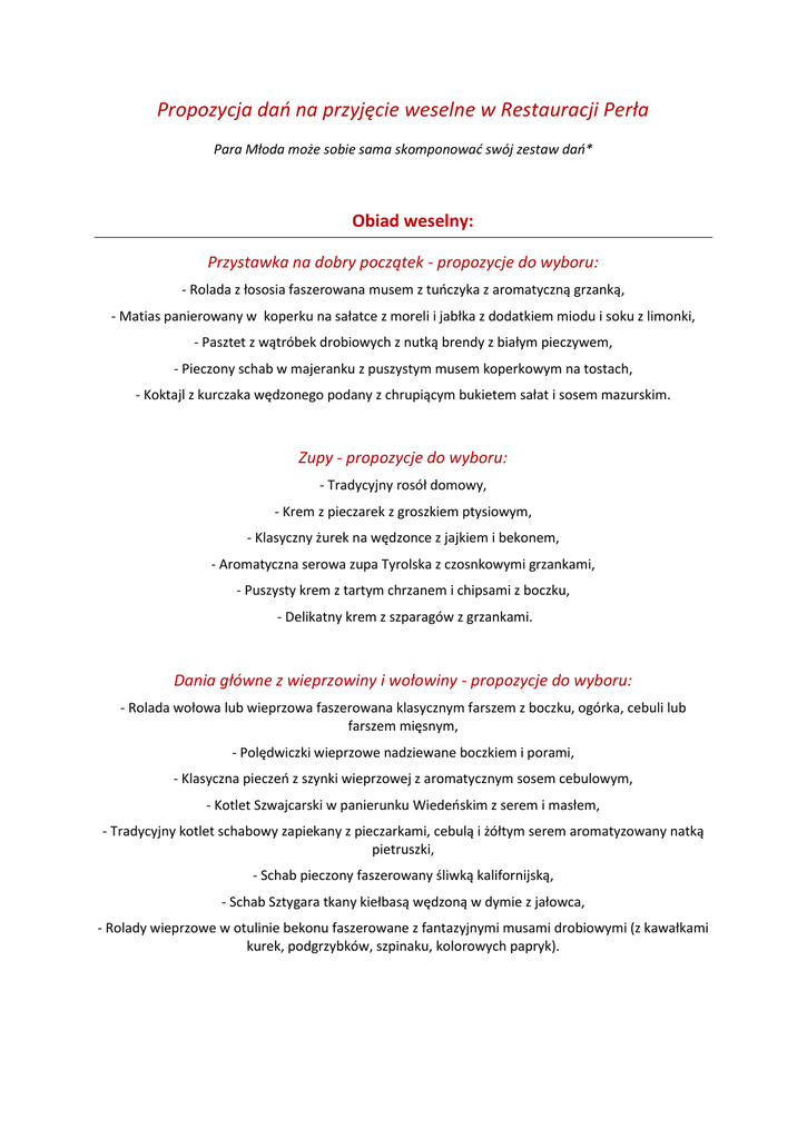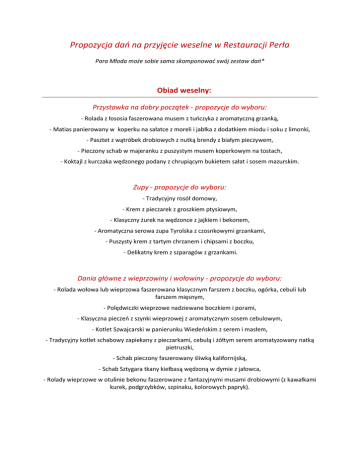 Propozycja dao na przyjęcie weselne w Restauracji Perła Para Młoda może sobie sama skomponowad swój zestaw dao* Obiad weselny: Przystawka na dobry początek - propozycje do wyboru: - Rolada z łososia faszerowana musem z tuoczyka z aromatyczną grzanką, - Matias panierowany w koperku na sałatce z moreli i jabłka z dodatkiem miodu i soku z limonki, - Pasztet z wątróbek drobiowych z nutką brendy z białym pieczywem, - Pieczony schab w majeranku z puszystym musem koperkowym na tostach, - Koktajl z kurczaka wędzonego podany z chrupiącym bukietem sałat i sosem mazurskim. Zupy - propozycje do wyboru: - Tradycyjny rosół domowy, - Krem z pieczarek z groszkiem ptysiowym, - Klasyczny żurek na wędzonce z jajkiem i bekonem, - Aromatyczna serowa zupa Tyrolska z czosnkowymi grzankami, - Puszysty krem z tartym chrzanem i chipsami z boczku, - Delikatny krem z szparagów z grzankami. Dania główne z wieprzowiny i wołowiny - propozycje do wyboru: - Rolada wołowa lub wieprzowa faszerowana klasycznym farszem z boczku, ogórka, cebuli lub farszem mięsnym, - Polędwiczki wieprzowe nadziewane boczkiem i porami, - Klasyczna pieczeo z szynki wieprzowej z aromatycznym sosem cebulowym, - Kotlet Szwajcarski w panierunku Wiedeoskim z serem i masłem, - Tradycyjny kotlet schabowy zapiekany z pieczarkami, cebulą i żółtym serem aromatyzowany natką pietruszki, - Schab pieczony faszerowany śliwką kalifornijską, - Schab Sztygara tkany kiełbasą wędzoną w dymie z jałowca, - Rolady wieprzowe w otulinie bekonu faszerowane z fantazyjnymi musami drobiowymi (z kawałkami kurek, podgrzybków, szpinaku, kolorowych papryk). Dania główne z drobiu - propozycje do wyboru: - Rolada drobiowa z fantazyjnym musem, faszerowana, - Klasyczny kotlet devolay z wiejskim masłem, - Pieczeo z piersi indyczej w plastrach wiejskiego bekonu - Filet indyka faszerowany liśdmi szpinaku i młodą marchewką, - Pieczone udko z kurczaka aromatyzowane czosnkiem i papryką, - Udko z kurczaka po Francusku pieczone, faszerowane cielęciną z dodatkiem bekonu, zielonego groszku i natki pietruszki, - Klasycznie pieczone udko z czarnej kaczki glazurowane w miodzie, - Kaczka po Sztrasburdzku z majerankiem, - Piersi kacze pieczone z jabłkami i kawałkami pomaraocz. Stosowne dodatki - do wyboru: - Klasyczne kluski śląskie, - Kluski tarte, - Ziemniaki młode glazurowane masłem i koperkiem, - Ziemniaki pieczone, - Kapusta czerwona na ciepło z kawałkami prażonego bekonu i cebuli, - Młoda fasolka szparagowa z gorącą emulsją z małą i cebuli, - Młoda kapusta z koperkiem i kawałkami boczku, - Młode buraczki duszone w śmietanie z kmnikiem, - Brukselka duszona w wiejskiej śmietanie, - Duszona kapusta kiszona z grzybami z polskich lasów. Sałatki - do wyboru: - Mix sałat z ziarnami zbóż z klasycznym winegrette, - Sałatka z kapusty białej, - Sałatka z kapusty czerwonej z rodzynkami, - Sałatka z młodej marchewki z jabłkiem, - Sałatka z młodych buraczków i chrzanem, - Sałatka z selera i orzechów włoskich, - Sałatka z pory z dodatkiem jabłek i sosu majonezowego. Sosy - do wyboru: - Sos śmietankowy, - Aromatyczny sos borowikowy, - Sos cebulowy. Słodki finał: - Torty i ciasta z Naszej cukierni, Wykonane na podstawie domowych receptur o różnych smakach i aromatach. Desery – do wyboru: - Puchar lodowy z owocami sezonowymi i puszystą bitą śmietaną, - Parafait z bitej śmietany z kawałkami chałwy i czekolady, - Krem Sułtaoski, - Delikatny mus cytrynowy lub czekoladowym, - Brzoskwinie Melba z lodami, czapą bitej śmietany i sosem z likieru contru, - Śliwki kalifornijskie aromatyzowane grzanym winem z gałką lodów waniliowych i bitą śmietaną, - Petera owoców sezonowych. Napoje gorące: - Kawa, herbata, Napoje zimne (wg. zużycia): - Woda, Soki, Fanta, Sprait, Coca – Cola. Zakąski w formie zimnej płyty lub Bufetu Szwedzkiego - Półmisek Wędlin Polskich (szynka wieprzowa, konserwowa, kiełbasa krakowska, salami), - Półmisek Wyrobów Swojskich (galantyna z kurczaka, mięsa pieczone z różnymi farszami), - Mini galaretki z kurczaka, ozorków wieprzowych, z szynki, - Paleta jaj o różnych smakach (w sosie tatarskim, faszerowane musami), - Filety z matiasa w kilku odsłonach (w śmietanie, w oleju, po węgiersku), - Smażone kawałki dorsza na białych warzywach, - Klasyczny befsztyk Tatarski, - Sałatki (Akropolis, Hawajska, Włoska, Caprese, Orientalna z kawałkami krabów), - Pikle (papryka konserwowa, ogórek konserwowy, oliwki), - Patery warzyw sezonowych, - Pieczywo, - Stosowne sosy i dodatki. Do zimnej płyty serwujemy barszcz z krokietem. Dania gorące przed oczepinami - Pieczona w ziołach pieczeo z karczku, - Smażony filet z kurczaka z pieczarkami z patelni, - Klasyczny kotlet schabowy z masłem czosnkowym, - Eskalopki drobiowe lub wieprzowe smażone po parysku z sosem Dijon, - Szaszłych wieprzowy lub drobiowy z kawałkami kolorowych papryk, boczku i cebuli, - Golonka gotowana lub pieczona na sposób Bawarski, - Smażone w maśle pietruszkowym pstrągi z kawałkami prażonych migdałów, - Filet z łososia norweskiego z pieca lub gotowany na parze z sosem koperkowym, - Dorsz panierowany w ziarnach słonecznika z sosem chrzanowo koperkowym. Dodatki – do wyboru: - Smażone dufiny, - Złociste frytki, - Ziemnaki pieczone, - Puszyste piure z ziemniaków z masłem, śmietaną i gałką muszkatołową, - Sałatki, - Warzywa gotowane, - Sosy zimne. Dania gorące po północy – do wybor, serwowane w kociołkach: - Klasyczny Węgierski bogracz, - Kociołek Góralski (kawałki pieczonej wieprzowiny z warzywami i kapustą kiszoną), - Flaki po Staropolsku. Kolacja w poprawiny w okresie letnim - Szynka pieczona lub prosiak z kapustą zasmażaną i pieczonymi ziemniakami i zimnymi sosami. Wszystkie dania podawane są na półmiskach. Szczegółowy jadłospis uzgadniany jest na 7 dni przed uroczystością. Przedstawione menu jest wzorcowe i może ulec zmianie w zależności od gustów i