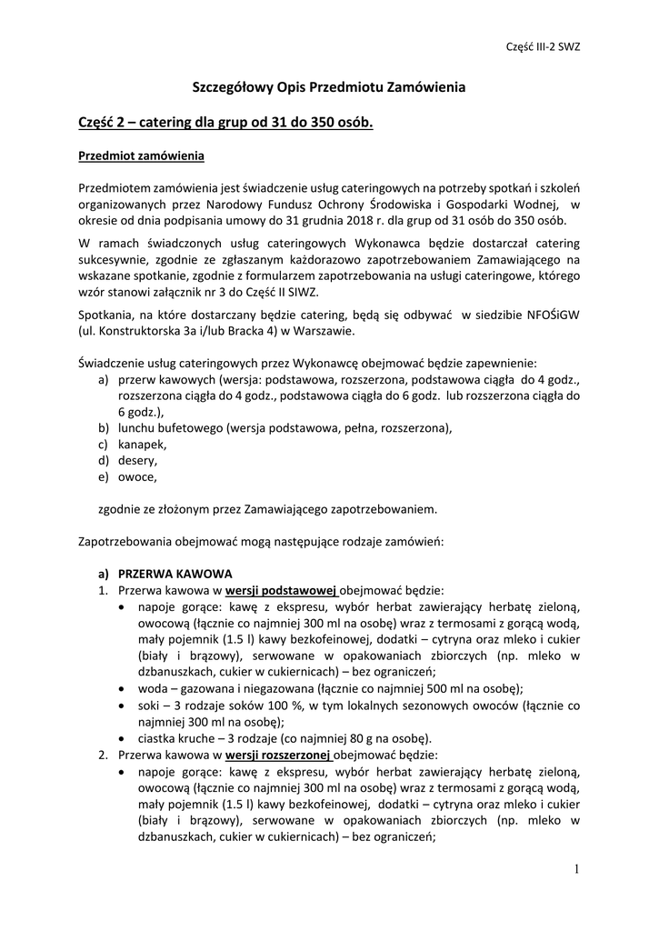 Część III-2 SWZ Szczegółowy Opis Przedmiotu Zamówienia Część 2 – catering dla grup od 31 do 350 osób. Przedmiot zamówienia Przedmiotem zamówienia jest świadczenie usług cateringowych na potrzeby spotkań i szkoleń organizowanych przez Narodowy Fundusz Ochrony Środowiska i Gospodarki Wodnej, w okresie od dnia podpisania umowy do 31 grudnia 2018 r. dla grup od 31 osób do 350 osób. W ramach świadczonych usług cateringowych Wykonawca będzie dostarczał catering sukcesywnie, zgodnie ze zgłaszanym każdorazowo zapotrzebowaniem Zamawiającego na wskazane spotkanie, zgodnie z formularzem zapotrzebowania na usługi cateringowe, którego wzór stanowi załącznik nr 3 do Część II SIWZ. Spotkania, na które dostarczany będzie catering, będą się odbywać w siedzibie NFOŚiGW (ul. Konstruktorska 3a i/lub Bracka 4) w Warszawie. Świadczenie usług cateringowych przez Wykonawcę obejmować będzie zapewnienie: a) przerw kawowych (wersja: podstawowa, rozszerzona, podstawowa ciągła do 4 godz., rozszerzona ciągła do 4 godz., podstawowa ciągła do 6 godz. lub rozszerzona ciągła do 6 godz.), b) lunchu bufetowego (wersja podstawowa, pełna, rozszerzona), c) kanapek, d) desery, e) owoce, zgodnie ze złożonym przez Zamawiającego zapotrzebowaniem. Zapotrzebowania obejmować mogą następujące rodzaje zamówień: a) PRZERWA KAWOWA 1. Przerwa kawowa w wersji podstawowej obejmować będzie: napoje gorące: kawę z ekspresu, wybór herbat zawierający herbatę zieloną, owocową (łącznie co najmniej 300 ml na osobę) wraz z termosami z gorącą wodą, mały pojemnik (1.5 l) kawy bezkofeinowej, dodatki – cytryna oraz mleko i cukier (biały i brązowy), serwowane w opakowaniach zbiorczych (np. mleko w dzbanuszkach, cukier w cukiernicach) – bez ograniczeń; woda – gazowana i niegazowana (łącznie co najmniej 500 ml na osobę); soki – 3 rodzaje soków 100 %, w tym lokalnych sezonowych owoców (łącznie co najmniej 300 ml na osobę); ciastka kruche – 3 rodzaje (co najmniej 80 g na osobę). 2. Przerwa kawowa w wersji rozszerzonej obejmować będzie: napoje gorące: kawę z ekspresu, wybór herbat zawierający herbatę zieloną, owocową (łącznie co najmniej 300 ml na osobę) wraz z termosami z gorącą wodą, mały pojemnik (1.5 l) kawy bezkofeinowej, dodatki – cytryna oraz mleko i cukier (biały i brązowy), serwowane w opakowaniach zbiorczych (np. mleko w dzbanuszkach, cukier w cukiernicach) – bez ograniczeń; 1 3. 4. 5. 6. woda – gazowana i niegazowana (łącznie co najmniej 500 ml na osobę); soki – 3 rodzaje soków 100 %, w tym lokalnych sezonowych owoców (łącznie co najmniej 300 ml na osobę); ciastka kruche – 3 rodzaje (co najmniej 80 g na osobę); świeże owoce, w tym lokalne sezonowe (co najmniej 150 g na osobę). Przerwa kawowa ciągła w wersji podstawowej (do 4 godzin) obejmować będzie: napoje gorące: kawę z ekspresu, wybór herbat zawierający herbatę zieloną, owocową (łącznie co najmniej 500 ml na osobę) wraz z termosami z gorącą wodą, mały pojemnik (2.0 l) kawy bezkofeinowej, dodatki – cytryna oraz mleko i cukier (biały i brązowy), serwowane w opakowaniach zbiorczych (np. mleko w dzbanuszkach, cukier w cukiernicach) – bez ograniczeń; woda – gazowana i niegazowana (łącznie co najmniej 700 ml na osobę); soki – 3 rodzaje soków 100 %, w tym lokalnych sezonowych owoców (łącznie co najmniej 450 ml na osobę); ciastka kruche – 3 rodzaje (co najmniej 150 g na osobę). Przerwa kawowa ciągła w wersji rozszerzonej (do 4 godzin) obejmować będzie: napoje gorące: kawę z ekspresu, wybór herbat zawierający herbatę zieloną, owocową (łącznie co najmniej 500 ml na osobę) wraz z termosami z gorącą wodą, mały pojemnik (2.0 l) kawy bezkofeinowej, dodatki – cytryna oraz mleko i cukier (biały i brązowy), serwowane w opakowaniach zbiorczych (np. mleko w dzbanuszkach, cukier w cukiernicach) – bez ograniczeń; woda – gazowana i niegazowana (łącznie co najmniej 700 ml na osobę); soki – 3 rodzaje soków 100 %, w tym lokalnych sezonowych owoców (łącznie co najmniej 450 ml na osobę); ciastka kruche – 3 rodzaje (co najmniej 150 g na osobę); świeże owoce, w tym lokalne sezonowe (co najmniej 250 g na osobę). Przerwa kawowa ciągła w wersji podstawowej (do 6 godzin) obejmować będzie: napoje gorące: kawę z ekspresu, wybór herbat zawierający herbatę zieloną (łącznie co najmniej 650 ml na osobę) wraz z termosami z gorącą wodą, mały pojemnik (2.5 l) kawy bezkofeinowej, dodatki – cytryna oraz mleko i cukier (biały i brązowy), serwowane w opakowaniach zbiorczych (np. mleko w dzbanuszkach, cukier w cukiernicach) – bez ograniczeń; woda – gazowana i niegazowana (łącznie co najmniej 850 ml na osobę); soki – 3 rodzaje soków 100 %, w tym lokalnych sezonowych owoców (łącznie co najmniej 600 ml na osobę); ciastka kruche – 3 rodzaje (co najmniej 250 g na osobę). Przerwa kawowa ciągła w wersji rozszerzonej (do 6 godzin) obejmować będzie: napoje gorące: kawę z ekspresu, wybór herbat zawierający herbatę zieloną, owocową (łącznie co najmniej 650 ml na osobę) wraz z termosami z gorącą wodą, mały pojemnik (2.5 l) kawy bezkofeinowej, dodatki – cytryna oraz mleko i cukier (biały i brązowy), serwowane w opakowaniach zbiorczych (np. mleko w dzbanuszkach, cukier w cukiernicach) – bez ograniczeń; woda – gazowana i niegazowana (łącznie co najmniej 850 ml na osobę); soki – 3 rodzaje soków 100 %, w tym lokalnych sezonowych owoców (łącznie co najmniej 600 ml na osobę); ciastka kruche – 3 rodzaje (co najmniej 250 g na osobę); świeże owoce, w tym lokalne sezonowe (co najmniej 350 g na osobę). b) LUNCH BUFETOWY 2 1. Lunch bufetowy w wersji podstawowej składać się będzie z: woda gazowana i niegazowana (łącznie co najmniej 500 ml na osobę), soki – 3 rodzaje soków 100%, w tym lokalnych sezonowych owoców (łącznie co najmniej 300 ml na osobę)