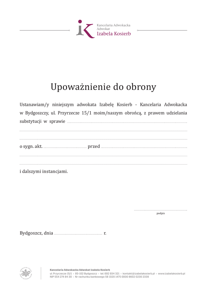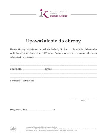Upoważnienie do obrony Ustanawiam/y niniejszym adwokata Izabelę Kosierb - Kancelaria Adwokacka w Bydgoszczy, ul. Przyrzecze 15/1 moim/naszym obrońcą, z prawem udzielania substytucji w sprawie .......................................................................................................................... ........................................................................................................................................................................ ........................................................................................................................................................................ o sygn. akt. . . . . . . . . . . . . . . . . . . . . . . . . . . . . . . . . . . . . . . . . . . . . przed . . . . . . . . . . . . . . . . . . . . . . . . . . . . . . . . . . . . . . . . . . . . . . . . . . . . . . . . . . . . . . . . . . . . . . . . . . . . . . . . . . . . . . . . ........................................................................................................................................................................ ........................................................................................................................................................................ i dalszymi instancjami. ...................................................... podpis Bydgoszcz, dnia . . . . . . . . . . . . . . . . . . . . . . . . . . . . . . . . . . . . . . . . . . . . . . . . . r. Kancelaria Adwokacka Adwokat Izabela Kosierb ul. Przyrzecze 15/1 • 85-102 Bydgoszcz • tel. 692 934 321 • [email protected] • www.izabelakosierb.pl NIP 554 274 84 30 • Nr rachunku bankowego 58 1020 1475 0000 8602 0230 2339