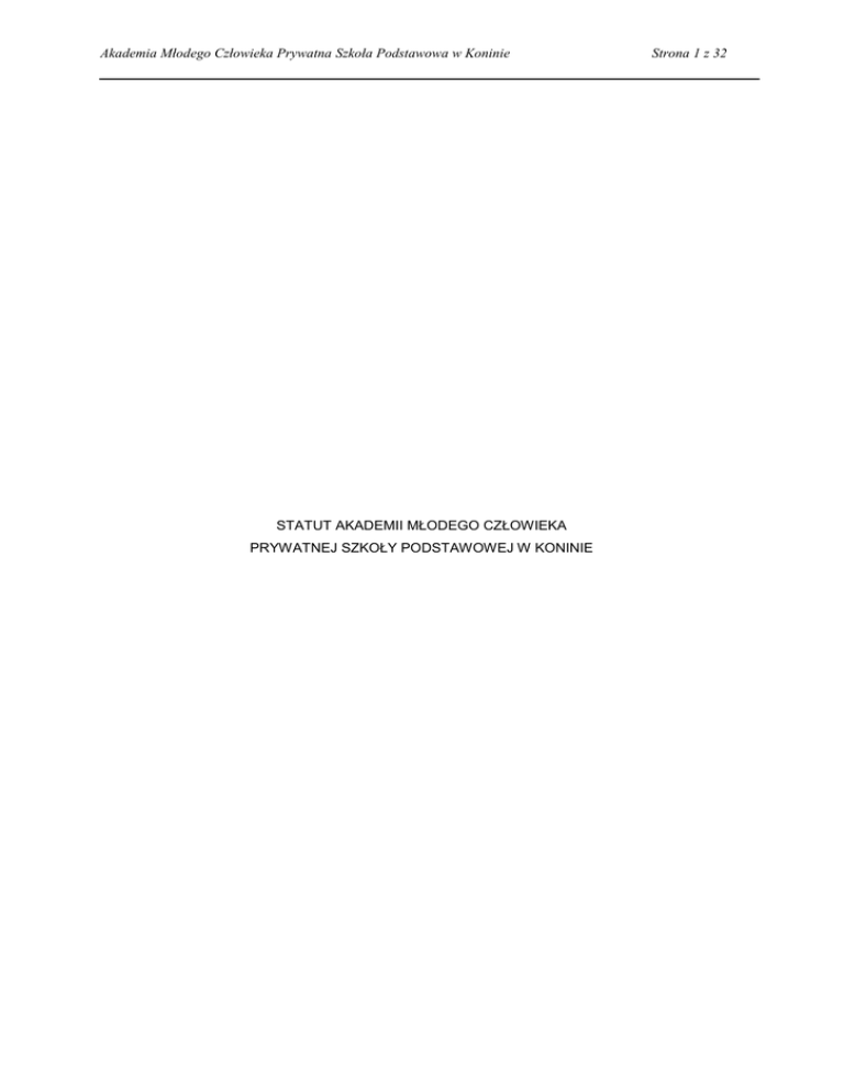 Akademia Młodego Człowieka Prywatna Szkoła Podstawowa w Koninie STATUT AKADEMII MŁODEGO CZŁOWIEKA PRYWATNEJ SZKOŁY PODSTAWOWEJ W KONINIE Strona 1 z 32 Akademia Młodego Człowieka Prywatna Szkoła Podstawowa w Koninie Spis treści Rozdział 1. Postanowienia ogólne Rozdział 2. Cele i zadania szkoły Rozdział 3. Organy szkoły Rozdział 4. Organizacja pracy szkoły Rozdział 5. Zasady oceniania w szkole Rozdział 6. Nauczyciele i inni pracownicy szkoły Rozdział 7. Uczniowie szkoły Rozdział 8. Zasady rekrutacji Rozdział 9. Zasady skreślenia z listy uczniów Rozdział 10. Sposób uzyskiwania środków finansowych Rozdział 11. Postanowienia końcowe Strona 2 z 32 Akademia Młodego Człowieka Prywatna Szkoła Podstawowa w Koninie Strona 3 z 32 Rozdział 1. Postanowienia ogólne §1 1. Akademia Młodego Człowieka Prywatna Szkoła Podstawowa w Koninie, zwana dalej „szkołą”, posiada uprawnia szkoły publicznej. 2. Organem prowadzącym szkołę jest Zbigniew Dulewicz, zamieszkały 62-510 Konin, ul Solskiego 2/21 3. Organ prowadzący może być jednocześnie dyrektorem szkoły. 4. Szkoła jest wpisana do ewidencji szkół niepublicznych w Koninie pod numerem WO.4430.36.2014 5. Nadzór pedagogiczny nad szkołą sprawuje Wielkopolski Kurator Oświaty w Poznaniu – Delegatura w Koninie. 6. Szkoła jest zlokalizowana pod adresem: 62-510 Konin, ul. Poznańska 84a. 7. Szkoła posługuje się pieczęcią: Akademia Młodego Człowieka Prywatna Szkoła Podstawowa ul. Poznańska 84a 62-510 Konin 8. Szkoła posługuje się numerem NIP 6651011723 oraz numerem REGON 302838525 9. Szkoła jest sześcioletnią szkołą podstawową, w swojej strukturze obejmuje klasy I–VI. 10. Akademia Młodego Człowieka Prywatna Szkoła Podstawowa działa na podstawie ustawy o systemie oświaty z dnia 7 września 1991 r. oraz niniejszego Statutu. §2 1. Organizacja szkoły obejmuje dwa cykle edukacyjne: 1) pierwszy cykl edukacyjny obejmujący klasy I–III – edukacja wczesnoszkolna, 2) drugi cykl edukacyjny obejmujący klasy IV–VI. 2. Okres kształcenia w szkole wynosi 6 lat i kończy się sprawdzianem. 3. Ukończenie szkoły uprawnia do dalszego kształcenia w gimnazjum. 4. Podstawową jednostką organizacyjną szkoły jest oddział. Rozdział 2. Cele i zadania szkoły §3 1. Celem działania szkoły jest wszechstronny rozwój uczniów, a w szczególności: 1) motywowanie uczniów do nabywania i rozwijania umiejętności czytania i pisania, wykonywania elementarnych działań arytmetycznych, posługiwania się prostymi narzędziami i kształtowania nawyków społecznego współżycia, 2) umacnianie wiary we własne siły i możliwości osiągania sukcesów oraz dążenia do osiągania celów, 3) rozwijanie wrażliwości moralnej, otwartości na poglądy i potrzeby innych ludzi, Akademia Młodego Człowieka Prywatna Szkoła Podstawowa w Koninie Strona 4 z 32 4) wzmacnianie poczucia tożsamości kulturowej, etnicznej i narodowej ucznia, 5) rozwijanie umiejętności poznawania siebie oraz otoczenia rodzinnego, społecznego, kulturowego i przyrodniczego, znajdowania swojego miejsca w społeczeństwie, przyjmowania odpowiedzialności za siebie i innych, 6) wyposażenie uczniów w wiedzę i umiejętności stosownie do ich rozwoju i zdolności, 7) zachęcanie uczniów do samokształcenia i rozwijania zdolności twórczego myślenia, 8) ułatwianie uczestnictwa w kulturze, sztuce, kulturze fizycznej i sporcie, 9) kształtowanie racjonalnego podejścia do problemów życiowych i umiejętności ich rozwiązywania. 2. Zadaniem szkoły jest zapewnienie opieki i wspomagania rozwoju uczniów w przyjaznym, bezpiecznym i zdrowym środowisku, a w szczególności: 1) budowanie poczucia więzi z rodziną, 2) uwzględnienie indywidualnych potrzeb ucznia, troska o zapewnienie równych szans, 3) stwarzanie warunków do rozwijania samodzielności, obowiązkowości, podejmowania odpowiedzialności za siebie i najbliższe otoczenie, 4) stwarzanie warunków do rozwoju wyobraźni, fantazji oraz ekspresji słowa, 5) inspirowanie aktywności badawczej oraz wyrażania myśli i przeżyć, 6) zapewnienie warunków do harmonijnego rozwoju fizycznego i psychicznego oraz zachowań prozdrowotnych, 7) stworzenie uczniom warunków do nabywania oraz utrwalania wiedzy i umiejętności stosownie do ich możliwości psychofizycznych, 8) kształtowanie postawy dociekliwości i refleksyjności, 9) zapewnienie możliwości korzystania z technologii informatycznej i komunikacyjnej, 10) poszerzanie wiedzy i umiejętności związanych ze zdrowymi stylami życia i profilaktyką zaburzeń, 11) rozwijanie poczucia odpowiedzialności i miłości do ojczyzny, 12) realizowanie podstawy programowej kształcenia ogólnego dla sześcioletnich szkół podstawowych, 13) przestrzeganie zasady oceniania, klasyfikowania i promowania uczniów, przeprowadzanie egzaminów i sprawdzianów, 14) udzielanie uczniom pomocy pedagogicznej i psychologicznej, 15) realizowania zadań wychowawczych zawartych w szkolnym programie wychowawczym, 16) współdziałanie z rodziną i wspomaganie w jej wychowaniu, 17) udzielanie opieki i pomocy uczniom, którym z przyczyn rozwojowych, rodzinnych lub losowych potrzebna jest pomoc i wsparcie, 18) sprawowanie opieki nad uczniami odpowiednio do ich potrzeb oraz możliwości szkoły z uwzględnieniem obowiązujących przepisów z zakresu bezpieczeństwa i higieny, 19) upowszechnianie wśród uczniów wiedzy o bezpieczeństwie oraz kształtowanie właściwych postaw wobec zagrożeń i sytuacji nadzwyczajnych, Akademia Młodego Człowieka Prywatna Szkoła Podstawowa w Koninie Strona 5 z 32 20) zapewnienie prawidłowej opieki nad uczniami w trakcie organizowanych imprez poza terenem szkoły zgodnie z odrębnymi przepisami oraz wewnątrzszkolnym regulaminem planowania i organizacji wycieczek szkolnych. 3. W celu zapewnienia uczniom bezpieczeństwa, ochrony przed przemocą, uzależnieniami, demoralizacją oraz innymi przejawami patologii spo