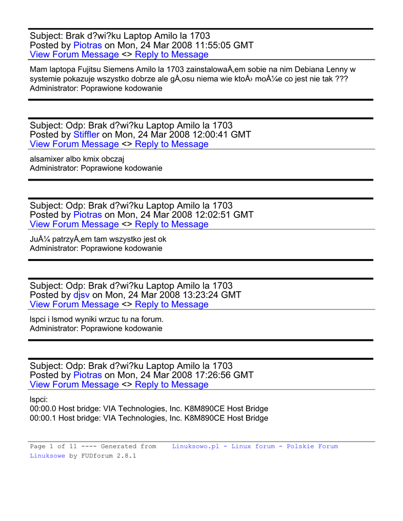 Subject: Brak d?wi?ku Laptop Amilo la 1703 Posted by Piotras on Mon, 24 Mar 2008 11:55:05 GMT View Forum Message <> Reply to Message Mam laptopa Fujitsu Siemens Amilo la 1703 zainstalowałem sobie na nim Debiana Lenny w systemie pokazuje wszystko dobrze ale głosu niema wie ktoś może co jest nie tak ??? Administrator: Poprawione kodowanie Subject: Odp: Brak d?wi?ku Laptop Amilo la 1703 Posted by Stiffler on Mon, 24 Mar 2008 12:00:41 GMT View Forum Message <> Reply to Message alsamixer albo kmix obczaj Administrator: Poprawione kodowanie Subject: Odp: Brak d?wi?ku Laptop Amilo la 1703 Posted by Piotras on Mon, 24 Mar 2008 12:02:51 GMT View Forum Message <> Reply to Message Już patrzyłem tam wszystko jest ok Administrator: Poprawione kodowanie Subject: Odp: Brak d?wi?ku Laptop Amilo la 1703 Posted by djsv on Mon, 24 Mar 2008 13:23:24 GMT View Forum Message <> Reply to Message lspci i lsmod wyniki wrzuc tu na forum. Administrator: Poprawione kodowanie Subject: Odp: Brak d?wi?ku Laptop Amilo la 1703 Posted by Piotras on Mon, 24 Mar 2008 17:26:56 GMT View Forum Message <> Reply to Message lspci: 00:00.0 Host bridge: VIA Technologies, Inc. K8M890CE Host Bridge 00:00.1 Host bridge: VIA Technologies, Inc. K8M890CE Host Bridge Page 1 of 11 ---- Generated from Linuksowe by FUDforum 2.8.1 Linuksowo.pl - Linux forum - Polskie Forum 00:00.2 Host bridge: VIA Technologies, Inc. K8M890CE Host Bridge 00:00.3 Host bridge: VIA Technologies, Inc. K8M890CE Host Bridge 00:00.4 Host bridge: VIA Technologies, Inc. K8M890CE Host Bridge 00:00.5 PIC: VIA Technologies, Inc. K8M890CE I/O APIC Interrupt Controller 00:00.7 Host bridge: VIA Technologies, Inc. K8M890CE Host Bridge 00:01.0 PCI bridge: VIA Technologies, Inc. VT8237 PCI bridge [K8T800/K8T890 South] 00:02.0 PCI bridge: VIA Technologies, Inc. K8T890 PCI to PCI Bridge Controller 00:03.0 PCI bridge: VIA Technologies, Inc. K8T890 PCI to PCI Bridge Controller 00:0f.0 IDE interface: VIA Technologies, Inc. VT8237A SATA 2-Port Controller (rev 80) 00:0f.1 IDE interface: VIA Technologies, Inc. VT82C586A/B/VT82C686/A/B/VT823x/A/C PIPC Bus Master IDE (rev 07) 00:10.0 USB Controller: VIA Technologies, Inc. VT82xxxxx UHCI USB 1.1 Controller (rev a0) 00:10.1 USB Controller: VIA Technologies, Inc. VT82xxxxx UHCI USB 1.1 Controller (rev a0) 00:10.2 USB Controller: VIA Technologies, Inc. VT82xxxxx UHCI USB 1.1 Controller (rev a0) 00:10.3 USB Controller: VIA Technologies, Inc. VT82xxxxx UHCI USB 1.1 Controller (rev a0) 00:10.4 USB Controller: VIA Technologies, Inc. USB 2.0 (rev 86) 00:11.0 ISA bridge: VIA Technologies, Inc. VT8237A PCI to ISA Bridge 00:11.7 Host bridge: VIA Technologies, Inc. VT8251 Ultra VLINK Controller 00:12.0 Ethernet controller: VIA Technologies, Inc. VT6102 [Rhine-II] (rev 7c) 00:13.0 PCI bridge: VIA Technologies, Inc. VT8237A Host Bridge 00:13.1 PCI bridge: VIA Technologies, Inc. VT8237A PCI to PCI Bridge 00:18.0 Host bridge: Advanced Micro Devices [AMD] K8 [Athlon64/Opteron] HyperTransport Technology Configuration 00:18.1 Host bridge: Advanced Micro Devices [AMD] K8 [Athlon64/Opteron] Address Map 00:18.2 Host bridge: Advanced Micro Devices [AMD] K8 [Athlon64/Opteron] DRAM Controller 00:18.3 Host bridge: Advanced Micro Devices [AMD] K8 [Athlon64/Opteron] Miscellaneous Control 01:00.0 VGA compatible controller: VIA Technologies, Inc. K8M890 [Chrome9] Integrated Video (rev 01) 04:01.0 Audio device: VIA Technologies, Inc. VIA High Definition Audio Controller (rev 10) lsmod: Module Size Used by xt_limit 2880 8 xt_tcpudp 3392 10 ipt_LOG 6272 8 ipt_MASQUERADE 3904 0 ipt_TOS 2496 0 ipt_REJECT 4736 1 nf_conntrack_irc 7320 0 nf_conntrack_ftp 9984 0 xt_state 2752 6 Page 2 of 11 ---- Generated from Linuksowe by FUDforum 2.8.1 Linuksowo.pl - Linux forum - Polskie Forum ppp_deflate 6080 0 zlib_deflate 18264 1 ppp_deflate bsd_comp 5824 0 speedtch 16548 0 firmware_class 9984 1 speedtch usbatm 19008 2 speedtch rfcomm 37016 0 l2cap 23232 5 rfcomm bluetooth 50148 4 rfcomm,l2cap button 8208 0 ac 5508 0 battery 10308 0 powernow_k8 14976 0 cpufreq_ondemand 8652 1 cpufreq_stats 5440 0 freq_table 4832 3 powernow_k8,cpufreq_ondemand,cpufreq_stats cpufreq_userspace 4448 0 cpufreq_conservative 7176 0 cpufreq_powersave 2112 0 iptable_nat 7556 0 nf_nat 18348 2 ipt_MASQUERADE,iptable_nat nf_conntrack_ipv4 18124 8 iptable_nat nf_conntrack 61000 7 ipt_MASQUERADE,nf_conntrack_irc,nf_conntrack_ftp,xt_state,iptable_nat,nf_nat,nf_conntrack_ip v4 nfnetlink 6168 3 nf_nat,nf_conntrack_ipv4,nf_conntrack iptable_mangle 3136 0 iptable_filter 3264 1 ip_tables 12708 3 iptable_nat,iptable_mangle,iptable_filter x_tables 14660 9 xt_limit,xt_tcpudp,ipt_LOG,ipt_MASQUERADE,ipt_TOS,ipt_REJECT,xt_state,iptable_nat,ip_table s pppoatm 5952 1 ipv6 239460 16 ppp_generic 26580 7 ppp_deflate,bsd_comp,pppoatm slhc 6464 1 ppp_generic dm_snapshot 17252 0 dm_mirror 21376 0 dm_mod 52672 2 dm_snapshot,dm_mirror loop 17412 0 joydev 9920 0 tsdev 8320 0 Page 3 of 11 ---- Generated from Linuksowe by FUDforum 2.8.1 Linuksowo.pl - Linux forum - Polskie Forum snd_hda_intel 239832 1 snd_pcm_oss 39904 0 snd_mixer_oss 15872 1 snd_pcm_oss snd_pcm 72772 2 snd_hda_intel,snd_pcm_oss snd_timer 21380 1 snd_pcm snd 48804 7 snd_hda_intel,snd_pcm_oss,snd_mixer_oss,snd_pcm,snd_timer pcspkr 3392 0 rtc 13144 0 soundcore 7840 1 snd snd_page_alloc 10376 2 snd_hda_intel,snd_pcm psmouse 36432 0 serio_raw 7044 0 i2c_viapro 8788 0 k8temp 5824 0 i2c_core 24000 1 i2c_viapro shpchp 31380 0 pci_hotplug 29568 1 shpchp amd64_agp 12420 0 via_agp 10304 1 agpgart 32200 2 amd64_agp,via_agp evdev 9664 6 ext3 122696 2 jbd 55848 1 ext3 mbcache 8580 1 ext3 ide_cd 36896 0 cdrom 33184 1 ide_cd sd_mod 27584 4 via_rhine 24136 0 mii 5696 1 via_rhine ehci_hcd 31116 0 uhci_hcd 23376 0 usbcore 126024 5 speedtch,usbatm,ehci_hcd,uhci_hcd via82cxxx 8964 0 [permanent] sata_via 11780 3 ata_generic 7876 0 libata 117168 2 sata_via,ata_generic scsi_mod 137356 2 sd_mod,libata generic 5124 0 [permanent] ide_core 114372 3 ide_cd,via82cxxx,generic thermal 13768 0 process