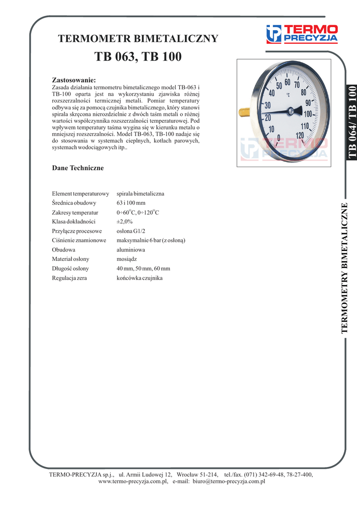 TERMOMETR BIMETALICZNY TB 063, TB 100 Zasada dzia³ania termometru bimetalicznego model TB-063 i TB-100 oparta jest na wykorzystaniu zjawiska ró¿nej rozszerzalnoœci termicznej metali. Pomiar temperatury odbywa siê za pomoc¹ czujnika bimetalicznego, który stanowi spirala skrêcona nierozdzielnie z dwóch taœm metali o ró¿nej wartoœci wspó³czynnika rozszerzalnoœci temperaturowej. Pod wp³ywem temperatury taœma wygina siê w kierunku metalu o mniejszej rozszerzalnoœci. Model TB-063, TB-100 nadaje siê do stosowania w systemach cieplnych, kot³ach parowych, systemach wodoci¹gowych itp.. TB 064/ TB 100 Zastosowanie: Element temperaturowy spirala bimetaliczna Œrednica obudowy 63 i 100 mm Zakresy temperatur 0÷60OC, 0÷120OC Klasa dok³adnoœci ±2,0% Przy³¹cze procesowe os³ona G1/2 Ciœnienie znamionowe maksymalnie 6 bar (z os³on¹) Obudowa aluminiowa Materia³ os³ony mosi¹dz D³ugoœæ os³ony 40 mm, 50 mm, 60 mm Regulacja zera koñcówka czujnika TERMO-PRECYZJA sp.j., ul. Armii Ludowej 12, Wroc³aw 51-214, tel./fax. (071) 342-69-48, 78-27-400, www.termo-precyzja.com.pl, e-mail: [email protected] TERMOMETRY BIMETALICZNE Dane Techniczne