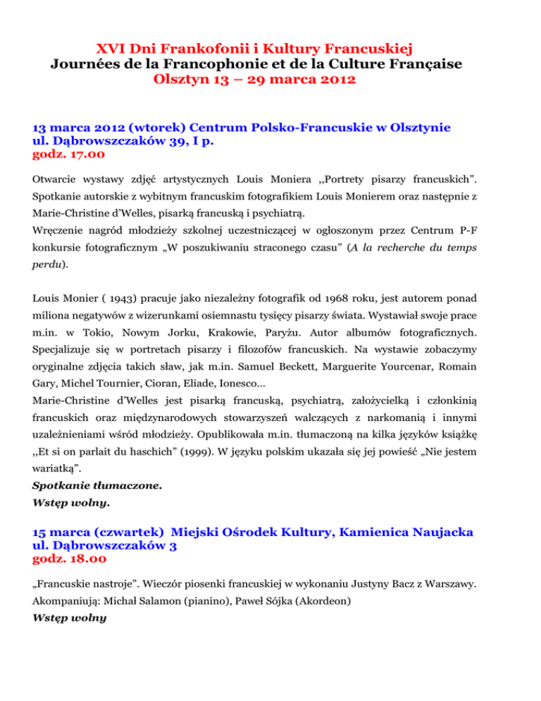 XVI Dni Frankofonii i Kultury Francuskiej Journées de la Francophonie et de la Culture Française Olsztyn 13 – 29 marca 2012 13 marca 2012 (wtorek) Centrum Polsko-Francuskie w Olsztynie ul. Dąbrowszczaków 39, I p. godz. 17.00 Otwarcie wystawy zdjęć artystycznych Louis Moniera ,,Portrety pisarzy francuskich”. Spotkanie autorskie z wybitnym francuskim fotografikiem Louis Monierem oraz następnie z Marie-Christine d’Welles, pisarką francuską i psychiatrą. Wręczenie nagród młodzieży szkolnej uczestniczącej w ogłoszonym przez Centrum P-F konkursie fotograficznym „W poszukiwaniu straconego czasu” (A la recherche du temps perdu). Louis Monier ( 1943) pracuje jako niezależny fotografik od 1968 roku, jest autorem ponad miliona negatywów z wizerunkami osiemnastu tysięcy pisarzy świata. Wystawiał swoje prace m.in. w Tokio, Nowym Jorku, Krakowie, Paryżu. Autor albumów fotograficznych. Specjalizuje się w portretach pisarzy i filozofów francuskich. Na wystawie zobaczymy oryginalne zdjęcia takich sław, jak m.in. Samuel Beckett, Marguerite Yourcenar, Romain Gary, Michel Tournier, Cioran, Eliade, Ionesco… Marie-Christine d’Welles jest pisarką francuską, psychiatrą, założycielką i członkinią francuskich oraz międzynarodowych stowarzyszeń walczących z narkomanią i innymi uzależnieniami wśród młodzieży. Opublikowała m.in. tłumaczoną na kilka języków książkę ,,Et si on parlait du haschich” (1999). W języku polskim ukazała się jej powieść „Nie jestem wariatką”. Spotkanie tłumaczone. Wstęp wolny. 15 marca (czwartek) Miejski Ośrodek Kultury, Kamienica Naujacka ul. Dąbrowszczaków 3 godz. 18.00 „Francuskie nastroje”. Wieczór piosenki francuskiej w wykonaniu Justyny Bacz z Warszawy. Akompaniują: Michał Salamon (pianino), Paweł Sójka (Akordeon) Wstęp wolny 21 marca (środa) Miejski Ośrodek Kultury, Kamienica Naujacka ul. Dąbrowszczaków 3 godz. 18.00 Koncert piosenek Edith Piaf w wykonaniu Joanny Oleś, laureatki I nagrody Złoty Tukan na 32. Przeglądzie Piosenki Aktorskiej w 2011 roku we Wrocławiu. Wstęp wolny 23 marca (piątek) pub ,,Piwiarnia” w Olsztynie, ul. Żołnierska 14a/1 godz. 20.00 Karaoke franco-polonais. Karaoke polsko-francuskie. Wstęp wolny 28 marca (środa) Centrum Polsko-Francuskie w Olsztynie godz. 18.00 Prelekcja wybitnego pisarza Krzysztofa Rutkowskiego „Rutkowski w Paryżu”. Spotkanie autorskie, którego podstawą do rozmowy o Paryżu i Francji jest książka autora ,,Wokulski w Paryżu” (Gdańsk 2010, wyd. słowo/obraz/terytoria), a także inne książki zaproszonego autora poświęcone literaturze francuskiej, polsko-francuskim kontaktom i wpływom kulturowo-literackim. Krzysztof Rutkowski, pisarz, tłumacz literatury francuskiej oraz publikacji naukowych, profesor w Instytucie Badań Interdyscyplinarnych „Artes Liberales” Uniwersytetu Warszawskiego, laureat nagrody Fundacji im. Kościelskich, wiele lat spędził we Francji, autor licznych książek, w tym wysoko cenionych przez krytykę i czytelników ,,Paryskich pasaży” . Wstęp wolny. 29 marca (czwartek) Centrum Polsko-Francuskie w Olsztynie godz. 18.00 Prelekcja multimedialna muzykologa, pianistki i klawesynistki Krystyny Pasquier z Paryża (rodem z Olsztyna): ,,Nadia Boulanger, jej szkoła i krąg polskich kompozytorów XX w.”. Kolejne spotkanie z cyklu „Muzyka francusko-polska”. Nadia Boulanger należała do grona najwybitniejszych pedagogów w dziedzinie muzyki XX wieku nie tylko we Francji, ale i na całym świecie. Wstęp wolny