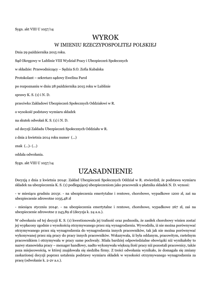 Sygn. akt VIII U 1057/14 WYROK W IMIENIU RZECZYPOSPOLITEJ POLSKIEJ Dnia 29 października 2015 roku. Sąd Okręgowy w Lublinie VIII Wydział Pracy i Ubezpieczeń Społecznych w składzie: Przewodniczący – Sędzia S.O. Zofia Kubalska Protokolant – sekretarz sądowy Ewelina Parol po rozpoznaniu w dniu 28 października 2015 roku w Lublinie sprawy K. S. (1) i N. D. przeciwko Zakładowi Ubezpieczeń Społecznych Oddziałowi w R. o wysokość podstawy wymiaru składek na skutek odwołań K. S. (1) i N. D. od decyzji Zakładu Ubezpieczeń Społecznych Oddziału w R. z dnia 2 kwietnia 2014 roku numer (...) znak (...)- (...) oddala odwołania. Sygn. akt VIII U 1057/14 UZASADNIENIE Decyzją z dnia 2 kwietnia 2014r. Zakład Ubezpieczeń Społecznych Oddział w R. stwierdził, że podstawa wymiaru składek na ubezpieczenia K. S. (1) podlegającej ubezpieczeniom jako pracownik u płatnika składek N. D. wynosi: - w miesiącu grudniu 2013r. - na ubezpieczenia emertytalne i rentowe, chorobowe, wypadkowe 1200 zł, zaś na ubezpieczenie zdrowotne 1035,48 zł - miesiącu styczniu 2014r. - na ubezpieczenia emertytalne i rentowe, chorobowe, wypadkowe 267 zł, zaś na ubezpieczenie zdrowotne 2 243,89 zł (decyzja k. 24 a.u.). W odwołaniu od tej decyzji K. S. (1) kwestionowała jej trafność oraz podnosiła, że zasiłek chorobowy winien zostać jej wypłacony zgodnie z wysokością otrzymywanego przez nią wynagrodzenia. Wywodziła, iż nie można porównywać otrzymywanego przez nią wynagrodzenia do wynagrodzenia innych pracowników, tak jak nie można porównywać wykonywanej przez nią pracy do pracy innych pracowników. Wskazywała, iż była oddanym, pracowitym, rzetelnym pracownikiem i otrzymywała w pracy same pochwały. Miała bardziej odpowiedzialne obowiązki niż wynikałoby to nazwy stanowiska pracy – menager handlowy, nadto wykonywała większą ilość pracy niż pozostali pracownicy, także poza miejscowością, w której znajdowała się siedziba firmy. Z treści odwołania wynikało, że domagała się zmiany zaskarżonej decyzji poprzez ustalenia podstawy wymiaru składek w wysokości otrzymywanego wynagrodzenia za pracę (odwołanie k. 2-2v a.s.). W odpowiedzi na odwołanie organ rentowy domagał się jego oddalenia i podnosił, że decyzja pracodawcy K. S. (1) w przedmiocie wysokości wynagrodzenia wnioskodawczyni nie znajduje uzasadnienia ekonomicznego i w ocenie organu rentowego została podjęta wyłącznie w celu uzyskania przez skarżącą wyższych świadczeń z ubezpieczeń (odpowiedź na odwołanie k. 3-6 a.s.). Odwołanie od wskazanej decyzji złożyła także N. D.. W jego treści wskazała, że nie zgadza się z decyzją, gdyż w jej ocenie zasiłek chorobowy powinien być naliczony zgodnie z wysokością wynagrodzenia, które stanowiło podstawę do naliczania składek. Składki na ubezpieczenia K. S. (1) były odprowadzane od momentu zatrudnienia jej na stanowisku menagera handlowego. Dodatkowo, N. D. podniosła, iż K. S. (1) pełniła bardziej odpowiedzialną funkcję niż pozostali pracownicy. Zakres wykonywanej pracy był zgodny z umową o pracę a praca wykonywała była bardzo starannie i z należytą dbałością (odwołanie k. 18-18v a.s.). W odpowiedzi na odwołanie N. D. organ rentowy wniósł o jego oddalenie, podnosząc tę samą argumentację jak w stosunku do odwołania K. S. (1) od zaskarżonej decyzji (odpowiedź na odwołanie k. 13-16 a.s.). Postanowieniem z dnia 6 czerwca 2011r. sprawy zostały połączone do wspólnego rozpoznania i rozstrzygnięcia pod sygnaturą VIII U 1057/14 (postanowienie k. 9 a.s.). Sąd Okręgowy ustalił i zważył, co następuje N. D. od dnia 2 grudnia 2013r. rozpoczęła prowadzenie pozarolniczej działalności gospodarczej zarejestrowanej w J., w województwie (...) przy ul. (...) (...). Faktycznie działalność ta jest prowadzona w Ś. w woj. (...) przy (...) L. O.. Działalność obejmuje wykonywanie usług reklamowych, marketingowych, zakładanie stron internetowych oraz prowadzenie sklepu z odzieżą używaną (wydruk z (...) – (...), k. 3 a.u., zeznania N. D. k. 59v-60 a.s., zeznania M. L. k. 101v-102 a.s., zeznania M. S. k. 109v -110v a.s.). Wnioskodawczyni N. D. zatrudnia 3 pracowników. Zatrudniona na stanowisku kasjerki B. G. pracuje w wymiarze 1/6 etatu z wynagrodzeniem miesięcznym w wysokości 1/6 płacy minimalnej. W takim samym wymiarze i za takim samym wynagrodzeniem zatrudniona jest M. S. na stanowisku menadżera handlowego. M. S. została zatrudniona od dnia 20 grudnia 2013r. (zeznania M. L. k. 102 a.s, zeznania M. S. k. 109v-110v as., wyjaśnienia informacyjne N. D. k. 59v-60v a.s., W dniu 2 grudnia 2013r. N. D. zatrudniła również na podstawie umowy o pracę K. S. (1) w wymiarze ¾ etatu, na stanowisku menadżera handlowego. Umowa została zawarta na czas określony do dnia 30 listopada 2015r. Wynagrodzenie zasadnicze zostało ustalone w wysokości 2800 zł brutto. K. S. (2) nie otrzymała zakresu obowiązków na piśmie (zeznania M. L. k. 101v-102 a.s., umowa o pracę – akta osobowe k. 72 a.s., wyjaśnienia informacyjne N. D. k. 59v-60v a.s., zeznania K. S. (1) k. 57v-59v, 110v a.s.). W chwili zawierania umowy K. S. (1) wiedziała, że jest w 3 miesiącu ciąży. Nie informowała o tym fakcie pracodawcy. Wstępne badanie lekarskie K. S. (1) odbyło się w dniu 29 listopada 2013r. i wnioskodawczyni została dopuszczona do pracy. Szkolenie z zakresu bhp odbyło się w dniu 2 grudnia 2013r. K. S. (1) została zgłoszona przez N. D. do ubezpieczeń społecznych jako pracownik od dnia 2 grudnia 2013r. (zeznania K. S. (1) k. 57v-59v, 110v a.s., wyjaśnienia informacyjne N. D. k. 59v-60v a.s., umowa o pracę, karta szkolenia bhp, zaświadczenie lekarskie, druk (...) P (...) akta osobowe k. 72 a.s.). Pracownice N. D. w osobach B. G. i M. S., zatrudnione w wymiarze po 1/6 etatu wykonywały pracę w siedzibie firmy w Ś.. M. S. jako menadżer handlowy zajmowała się wyłącznie ustalaniem cen produktów