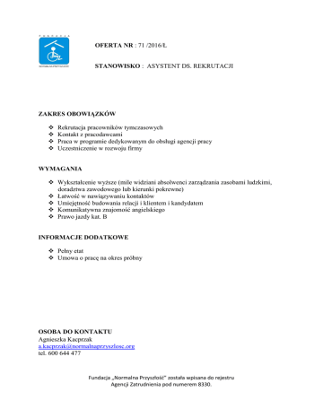 OFERTA NR : 71 /2016/Ł STANOWISKO : ASYSTENT DS. REKRUTACJI ZAKRES OBOWIĄZKÓW Rekrutacja pracowników tymczasowych Kontakt z pracodawcami Praca w programie dedykowanym do obsługi agencji pracy Uczestniczenie w rozwoju firmy WYMAGANIA Wykształcenie wyższe (mile widziani absolwenci zarządzania zasobami ludzkimi, doradztwa zawodowego lub kierunki pokrewne) Łatwość w nawiązywaniu kontaktów Umiejętność budowania relacji i klientem i kandydatem Komunikatywna znajomość angielskiego Prawo jazdy kat. B INFORMACJE DODATKOWE Pełny etat Umowa o pracę na okres próbny OSOBA DO KONTAKTU Agnieszka Kacprzak [email protected] tel. 600 644 477 Fundacja „Normalna Przyszłość” została wpisana do rejestru Agencji Zatrudnienia pod numerem 8330.