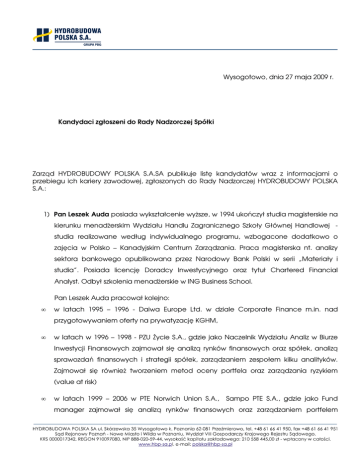 Wysogotowo, dnia 27 maja 2009 r. Kandydaci zgłoszeni do Rady Nadzorczej Spółki Zarząd HYDROBUDOWY POLSKA S.A.SA publikuje listę kandydatów wraz z informacjami o przebiegu ich kariery zawodowej, zgłoszonych do Rady Nadzorczej HYDROBUDOWY POLSKA S.A.: 1) Pan Leszek Auda posiada wykształcenie wyŜsze, w 1994 ukończył studia magisterskie na kierunku menadŜerskim Wydziału Handlu Zagranicznego Szkoły Głównej Handlowej studia realizowane według indywidualnego programu, wzbogacone dodatkowo o zajęcia w Polsko – Kanadyjskim Centrum Zarządzania. Praca magisterska nt. analizy sektora bankowego opublikowana przez Narodowy Bank Polski w serii „Materiały i studia”. Posiada licencję Doradcy Inwestycyjnego oraz tytuł Chartered Financial Analyst. Odbył szkolenia menadŜerskie w ING Business School. Pan Leszek Auda pracował kolejno: • w latach 1995 – 1996 - Daiwa Europe Ltd. w dziale Corporate Finance m.in. nad przygotowywaniem oferty na prywatyzację KGHM, • w latach w 1996 – 1998 - PZU śycie S.A., gdzie jako Naczelnik Wydziału Analiz w Biurze Inwestycji Finansowych zajmował się analizą rynków finansowych oraz spółek, analizą sprawozdań finansowych i strategii spółek, zarządzaniem zespołem kilku analityków. Zajmował się równieŜ tworzeniem metod oceny portfela oraz zarządzania ryzykiem (value at risk) • w latach 1999 – 2006 w PTE Norwich Union S.A., Sampo PTE S.A., gdzie jako Fund manager zajmował się analizą rynków finansowych oraz zarządzaniem portfelem Sampo OFE. Proponował strategię inwestycyjną w tym udział akcji i obligacji w portfelu, duration portfela obligacji, limity dla poszczególnych spółek do akceptacji Komitetu inwestycyjnego. Zarządzał na bieŜąco akcyjną częścią portfela. • w latach 2006 – 2009 - ING Investment Management S.A., jako zarządzający funduszami (VII 2006 – III 2007), Zastępca Dyrektora Inwestycyjnego (IV – VIII 2007) oraz Dyrektor Inwestycyjny, Członek Zarządu – od VIII 2007 do kwietnia 2009r. Pan Leszek Auda początkowo był zatrudniony jako zarządzający funduszami, następnie Zastępcy Dyrektora Inwestycyjnego a następnie Dyrektora Inwestycyjnego i Członka Zarządu. Był teŜ Członkiem Zarządu ING TFI S.A. Zarządzał zespołem 10 specjalistów inwestycyjnych, którzy zarządzali funduszami TFI, portfelami klientów, portfelami ubezpieczeniowymi grupy ING. Był przewodniczącym Komitetu Inwestycyjnego ING IM oraz członkiem ALCO NN (Komitet aktywów i pasywów ubezpieczeniowych). Brał udział w pracach Zarządów ING IM i TFI, początkowo jako ekspert, następnie jako członek Zarządów. Pan Leszek Auda nie jest powiązany ze spółką HYDROBUDOWA POLSKA S.A. ani PBG S.A. 2) Pan Robert Oppenheim posiada wykształcenie wyŜsze, ukończył Wydział prawa oraz Wydział Nauk Ekonomicznych na Uniwersytecie Warszawskim. Obecnie na Wydziale Nauk Ekonomicznych UW, jest wykładowcą na studiach podyplomowych oraz jest autorem publikacji z zakresy restrukturyzacji przedsiębiorstw oraz rynku kapitałowego. Pan Robert Oppeheim pracował kolejno: • w latach 1991-1992 w Warszawski Domu Maklerskim na stanowisku dyrektora, • 1992-1995 w Powszechnym Banku Kredytowym na Stanowski doradcy prezesa oraz Dyrektora w Departamencie Restrukturyzacji • 1995-1999 w International Westfund Holdings na stanowisku wiceprezesa • 1991-2001 w Dromex SA na stanowisku wiceprezesa • 2001-2005 w Strabag Polska na stanowisku wiceprezesa • obecnie w RC Development na stanowisku prezesa (od 2005) oraz od 2006 jest związany z Hydrobudowa 9 SA początkowo jako Członek Zarządu Spółki, a od 2007 jest członkiem Rady Nadzorczej HB9. 2z4 W latach 1991-1993 był prezesem Związku Maklerów Papierów Wartościowych Pan Robert Oppenheim jest członkiem rad nadzorczych spółek z Grupy Kapitałowej PBG – spółki HYDROBUDOWA 9 S.A. oraz APRIVIA S.A. Jest równieŜ akcjonariuszem spółki HYDROBUDOWA POLSKA S.A. 3) Pan Jacek KrzyŜaniak - w latach 1992-1995 student Akademii Rolniczej w Poznaniu, specjalizacja Ekonomika Rolnictwa. Kariera zawodowa: • od roku 1998 dyrektor Fundacji Europa XXI, • od 1998 do 2000 roku związany z WIL Lobbying Sp. z o.o., gdzie początkowo pełnił funkcję członka zarządu oraz dyrektora generalnego, a następnie w roku 1999 - prezesa zarządu. • w 2003 roku rozpoczął pracę jako asystent zarządu w Technologiach Gazowych Piecobiogaz Sp. z o.o. ( obecnie PBG SA); od 2004 roku do chwili obecnej zarządza Działem Relacji Inwestorskich w PBG SA, a dodatkowo w 2007 roku objął funkcję rzecznika prasowego spółki, • przez trzy lata od 1999 roku - członek Rady Nadzorczej Polskiego Funduszu Kapitałowego S.A. • od 2004 do 2006 - Członek Rady Nadzorczej PC Guard S.A.; • w latach 2005-2007 w Radzie Nadzorczej spółki HYDROBUDOWA Włocławek SA, • w Radzie Nadzorczej PBG S.A. zasiada od 2004 roku do chwili obecnej. Zgłoszone osoby posiadają wieloletnie i bogate doświadczenie oraz kwalifikacje do zasiadania w Radzie Nadzorczej Spółki. Pan Robert Oppenheim oraz Pan Jacek KrzyŜaniak zasiadali i nadal zasiadają w organach nadzorczych spółek akcyjnych. Posiadają niezbędne doświadczenie związane z rynkami kapitałowymi oraz funkcjonowaniem spółek publicznych. 3z4 Pan Leszek Auda posiada wieloletnie doświadczenie związane z zarządzaniem funduszami emerytalnymi (Forbes sklasyfikował Kandydata na drugim miejscu wśród zarządzających funduszami emerytalnymi), które posiadały akcje w spółkach publicznych. Spełnia wymogi dla niezaleŜnego członka Rady Nadzorczej Spółki. 4z4