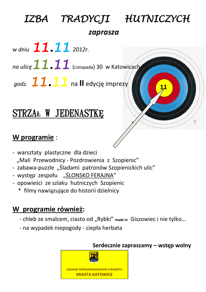 IZBA TRADYCJI HUTNICZYCH zaprasza 11.11 2012r. na ulicę11.11 ( ) 30 w Katowicach godz. 11.11 na II edycję imprezy w dniu Listopada 11 STRZAŁ W JEDENASTKĘ W programie : - warsztaty plastyczne dla dzieci „Mali Przewodnicy - Pozdrowienia z Szopienic” - zabawa-puzzle „Śladami patronów Szopienickich ulic” - występ zespołu „ŚLONSKO FERAJNA” - opowieści ze szlaku hutniczych Szopienic * filmy nawiązujące do historii dzielnicy W programie również: - chleb ze smalcem, ciasto od „Rybki” made in Giszowiec i nie tylko… - na wypadek niepogody - ciepła herbata Serdecznie zapraszamy – wstęp wolny ZADANIE WSPÓŁFINANSOWANE Z BUDŻETU MIASTA KATOWICE