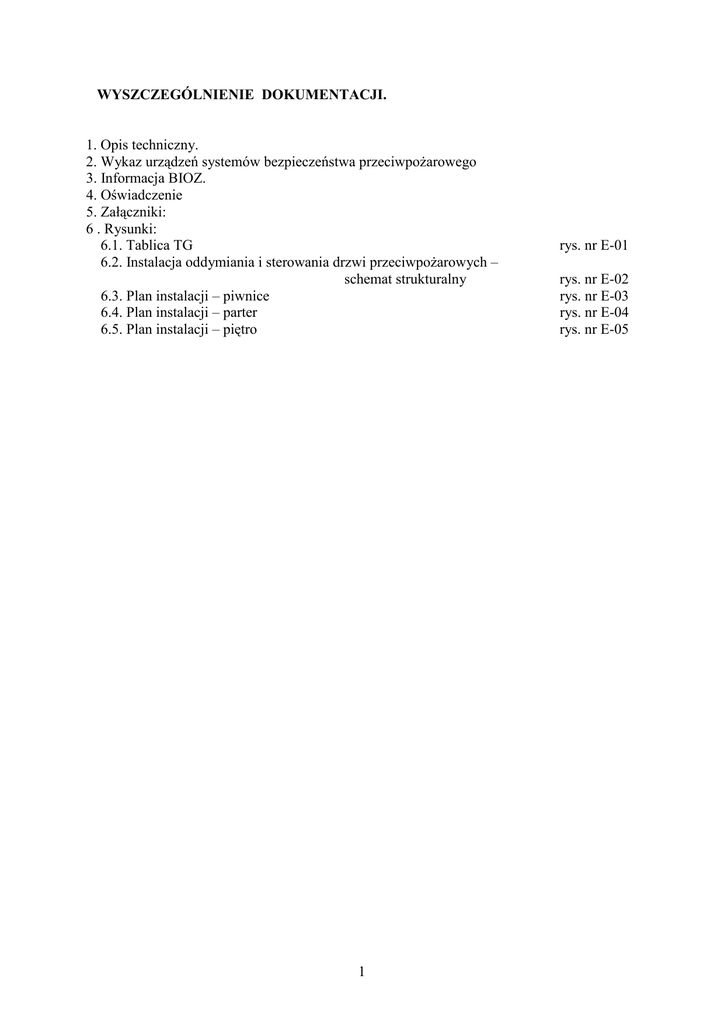 WYSZCZEGÓLNIENIE DOKUMENTACJI. 1. Opis techniczny. 2. Wykaz urządzeń systemów bezpieczeństwa przeciwpoŜarowego 3. Informacja BIOZ. 4. Oświadczenie 5. Załączniki: 6 . Rysunki: 6.1. Tablica TG 6.2. Instalacja oddymiania i sterowania drzwi przeciwpoŜarowych – schemat strukturalny 6.3. Plan instalacji – piwnice 6.4. Plan instalacji – parter 6.5. Plan instalacji – piętro 1 rys. nr E-01 rys. nr E-02 rys. nr E-03 rys. nr E-04 rys. nr E-05 1 Opis techniczny. 1.1. Temat i zakres opracowania. Przedmiotem opracowania jest dokumentacja projektowa zawierająca dostosowanie budynku Przedszkola Publicznego nr 1 w Nowogardzie przy ul. śeromskiego 14 do wymogów Państwowej StraŜy PoŜarnej w zakresie: - rozbudowa tablicy głównej - instalacja oświetlenia awaryjnego bezpieczeństwa i ewakuacyjnego - instalacja oddymiania - instalacja automatyki drzwi przeciwpoŜarowych - przesłanie sygnału alarmowego 1.2. Podstawa opracowania. - zlecenie Inwestora - inwentaryzacja do celów projektowych, - uzgodnienia z UŜytkownikiem, - „Zasady projektowania instalacji sygnalizacji poŜarowej", wydane przez CNBOP, autor opracowania: mgr inŜ. J. Ciszewski, Warszawa 1994 r. - Polska Norma PN – E – 08350 – 14 – „Systemy sygnalizacji poŜarowej. Projektowanie, zakładanie, odbiór, eksploatacja i konserwacja instalacji” – zastąpiona przez Specyfikację Techniczną PKN – CEN / TS 54 –14 : 2006. - Karty katalogowe czujek punktowych oraz przycisków poŜarowych ROP - Karty katalogowe elementów systemu oddymiania firmy „D + H” Mechatronic GmbH (przycisków oddymiania typu RT oraz przycisków przewietrzania typu LT). - Instrukcja obsługi centrali oddymiania typu RZN 4402 / 04 – K firmy „D + H” Mechatronic GmbH. - Instrukcja obsługi: Centrala sterująca automatyką poŜarową bram i drzwi typ: AFG-2 firmy AFG Elektronika Przemysłowa - Polska Norma PN - E N – 1838 – „Zastosowanie oświetlenia. Oświetlenie awaryjne” - obowiązujące normy i przepisy. 1.3. Parametry energetyczne. Pi = 550VA. Po = 550VA. kz = 1. Zaprojektowana moc nie spowoduje przekroczenia istniejącej mocy zagwarantowanej w umowie z ENEA S.A. poniewaŜ projektowane oprawy będą się świeciły przy zaniku oświetlenia podstawowego. 1.4. Rozbudowa tablicy TG. W tablicy TG na parterze, zabudować trzy rozłączniki bezpiecznikowe zasilając je z przed wyłącznika głównego tablicy. Rozłączniki wyposaŜyć we wkładki topikowe Ib=16A. 1.5. Instalacja oświetlenia awaryjnego bezpieczeństwa i oświetlenia ewakuacyjnego. Zgodnie z wymogami StraŜy PoŜarnej naleŜy wykonać oświetlenie awaryjnego bezpieczeństwa i oświetlenia ewakuacyjnego budynku. Oświetlenie naleŜy wykonać zgodnie z normą PN-EN 1838:2005 „Zastosowanie oświetlenia, Oświetlenie awaryjne”. 2 Celem oświetlenia drogi ewakuacyjnej jest umoŜliwienie bezpiecznego wyjścia z miejsc przebywania osób przez stworzenie warunków widzenia umoŜliwiających identyfikację i uŜycie dróg ewakuacyjnych oraz łatwe zlokalizowanie i uŜycie sprzętu poŜarowego i sprzętu bezpieczeństwa. Oprawy winny być umieszczone: - przy kaŜdych ewakuacyjnych drzwiach wyjściowych - „w pobliŜu” schodów, tak aby oświetlić kaŜdy stopień - „w pobliŜu” kaŜdej zmiany poziomu - przy wyjściach ewakuacyjnych i znakach bezpieczeństwa - przy kaŜdej zmianie kierunku i skrzyŜowaniu korytarzy - na zewnątrz i w pobliŜu kaŜdego wyjścia końcowego - „w pobliŜu” kaŜdego punktu pierwszej pomocy - „w pobliŜu” kaŜdego urządzenia przeciwpoŜarowego i przycisku alarmowego Wg normy określenie „w pobliŜu” jest spełnione, gdy w obrębie 2m mierzonych w poziomie natęŜenie oświetlenia na podłodze wynosi, co najmniej 5 lx. Zaprojektowano oświetlenie za pomocą opraw świetlówkowych awaryjnych typ ARIAN E 1x8W nr ref. 23EA2003C wg katalogu firmy AGA LIGHT, tel. 022 721 7272, www.alc.pl świecących przez okres 3 godzin po zaniku napięcia. oraz oprawy kloszowej METEOR 1x18W firmy AGA LIGHT z zamontowanym inwerterem np. wg kat. firmy MAWEL Piaseczno, tel. 022 750 32 37, www.mawel.com.pl świecącej przez okres 2 godzin po zaniku napięcia. Załączenie oświetlenia ewakuacyjnego samoczynnie po zaniku napięcia w rozdzielnicy w czasie t<1 sek. Uzyskane natęŜenie oświetlenia ewakuacyjnego Eśr w zakresie od 1,2 do 2,7 lx, przy czasie świecenia min. 2 godz. Całość instalacji wykonać przewodem YDYŜo 3x2,5 w tynku. Oprawy mocować na ścianie na wysokości 2,5m. Pod kaŜdą z opraw na ścianie umieścić piktogram wskazujący drogę ewakuacji. 1. 6. Instalacja oddymiania 1.6.1. Charakterystyka obiektu. Budynek przedszkola jest budynkiem niskim, zakwalifikowany do kategorii zagroŜenia ludzi ZL II. Drzwi do pomieszczeń na pobyt ludzi na parterze i piętrze budynku oraz drzwi wejściowe do piwnic zostaną zgodnie z opracowaniem wymienione na drzwi o klasie odporności ogniowej EI 30. 1.6.2. Zasilanie centrali oddymiania Od tablicy TG do centrali ułoŜyć w tynku przewód YDYŜo3x2,5. 1.6.3. Zastosowane urządzenia systemu oddymiania 1.6.3.1. Czujka dymu. Jako detektor do ochrony klatki schodowej oraz przestrzeni korytarzy przewiduje się optyczno – temperaturową czujkę dymu (jest to detektor wielosensorowy), która jest równieŜ przydatna do wykrywania dymu powstającego w czasie poŜaru materiałów z grupy TF1, czyli w obszarze zastosowania dotychczas stosowanych czujek jonizacyjnych. Zastosowana czujka, z uwagi na zastosowanie kilku sensorów (zasady działania i wynikającego z tego zakresu widmowego wykrywanych dymów), reaguje juŜ na pierwsze symptomy poŜaru – dym, w szerokim jego zakresie widmowym (cząstki 3 widzialne i niewidzialne). Pozwala to na wykrycie poŜaru w jego najwcześniejszej fazie i umoŜliwia podjęcie akcji gaśniczej za pomocą podręcznych środków gaśniczych – jeszcze przed pełnym rozwojem poŜaru. Czujkę przewiduje się zamontować w na suficie klatki schodowej na piętrze.