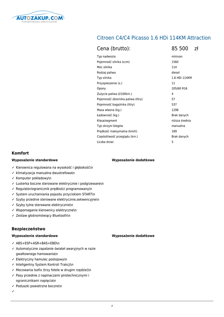 Citroen C4/C4 Picasso 1.6 HDi 114KM Attraction Cena (brutto): 85 500 Typ nadwozia minivan Pojemność silnika (ccm) 1560 Moc silnika 114 Rodzaj paliwa diesel Typ silnika 1.6 HDi 114KM Przyspieszenie (s.) 11 Opony 205/60 R16 Zużycie paliwa (l/100km.) 4 Pojemność zbiornika paliwa (litry) 57 Pojemność bagażnika (litry) 537 Masa własna (kg.) 1298 Ładowność (kg.) Brak danych Klasa/segment niższa średnia Typ skrzyni biegów manualna Prędkość maksymalna (km/h) 189 Częstotliwość przeglądu (km.) Brak danych Liczba drzwi 5 Komfort Wyposażenie standardowe Wyposażenie dodatkowe ✓ Kierownica regulowana na wysokość i głębokość\n ✓ klimatyzacja manualna dwustrefowa\n ✓ Komputer pokładowy\n ✓ Lusterka boczne sterowane elektrycznie i podgrzewane\n ✓ Regulator/ogranicznik prędkości programowany\n ✓ System uruchamiania pojazdu przyciskiem START\n ✓ Szyby przednie sterowane elektrycznie,sekwencyjne\n ✓ Szyby tylne sterowane elektrycznie\n ✓ Wspomaganie kierownicy elektryczne\n ✓ Zestaw głośnomówiący Bluetooth\n Bezpieczeństwo Wyposażenie standardowe Wyposażenie dodatkowe ✓ ABS+ESP+ASR+BAS+EBD\n ✓ Automatyczne zapalanie świateł awaryjnych w razie gwałtownego hamowania\n ✓ Elektryczny hamulec postojowy\n ✓ Inteligentny System Kontroli Trakcji\n ✓ Mocowania Isofix (trzy fotele w drugim rzędzie)\n ✓ Pasy przednie z napinaczami pirotechnicznymi i ogranicznikami napięcia\n ✓ Poduszki powietrzne boczne\n ✓ 1 zł Poduszki powietrzne kurtynowe z przodu i z tyłu\n 2 Dodatki Wyposażenie standardowe Wyposażenie dodatkowe ✓ Centralny zamek z pilotem ✕ Koło zapasowe dojazdowe 350 PLN ✓ Ekran LCD monochromatyczny ✕ Lakier metalizowany lub perłowy lub czarny 2000 PLN ✓ Filtr cząstek stałych (dla HDi) ✕ Reflektory przeciwmgłowe 500 PLN ✓ Koła stalowe 16"z oponami 205/60 R16 i kołpakami LOO\n ✓ Koło kierownicy pokryte skórą\n ✓ Lusterka boczne częściowo lakierowane w kolorze ✓ Poduszka nadwozia\n powietrzna kierowcy i pasażera\n ✓ Radio z 6 głośnikami + gniazdo USB + gniazdo jack\n ✓ Światła do jazdy dziennej LED\n ✓ System Stop&Start\n ✓ Szyba przednia panoramiczna\n ✓ Tablet dotykowy 7"sterujący funkcjami samochodu (klimatyzacja, radio,zestaw głośnomówiący Bluetooth, ✓ Wskaźnik media)\n zmiany biegów (tylko dla skrzyń manualnych)\n ✓ wspomaganie ruszania na wzniesieniu\n ✓ Zderzaki przednie i tylne w kolorze nadwozia\n ✓ Zestaw naprawczy do kół\n Doprecyzowanie oferty Kontakt: Nazwa użytkownika: admin Nazwa firmy: qqq Adres: qqq 12, 41-706 qqq1, NIP: 954 REGON: 1 Telefon: 123, 1 Fax: 1 Email: 1 www: 3