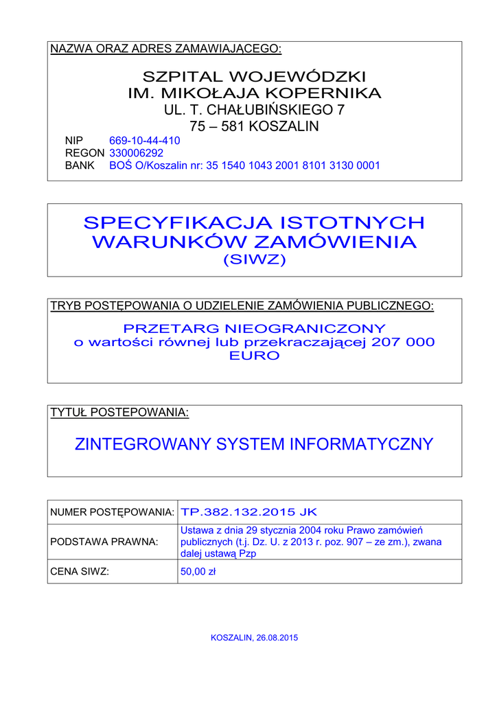 NAZWA ORAZ ADRES ZAMAWIAJĄCEGO: SZPITAL WOJEWÓDZKI IM. MIKOŁAJA KOPERNIKA UL. T. CHAŁUBIŃSKIEGO 7 75 – 581 KOSZALIN NIP 669-10-44-410 REGON 330006292 BANK BOŚ O/Koszalin nr: 35 1540 1043 2001 8101 3130 0001 SPECYFIKACJA ISTOTNYCH WARUNKÓW ZAMÓWIENIA (SIWZ) TRYB POSTĘPOWANIA O UDZIELENIE ZAMÓWIENIA PUBLICZNEGO: PRZETARG NIEOGRANICZONY o wartości równej lub przekraczającej 207 000 EURO TYTUŁ POSTEPOWANIA: ZINTEGROWANY SYSTEM INFORMATYCZNY NUMER POSTĘPOWANIA: TP.382.132.2015 JK PODSTAWA PRAWNA: Ustawa z dnia 29 stycznia 2004 roku Prawo zamówień publicznych (t.j. Dz. U. z 2013 r. poz. 907 – ze zm.), zwana dalej ustawą Pzp CENA SIWZ: 50,00 zł KOSZALIN, 26.08.2015 SIWZ TP.382.132.2015 JK DZIAŁ I. OPIS PRZEDMIOTU ZAMÓWIENIA 1. Przedmiotem zamówienia jest dostawa i wdroŜenie zintegrowanego systemu informatycznego słuŜącego pełnej obsłudze zdarzeń medycznych i administracyjnych oraz dostawie terminali. Inwestycja polegać będzie na wdroŜeniu kompleksowego, zintegrowanego systemu informatycznego (ZSI) słuŜącego zarządzaniu szpitalem zarówno w części medycznej i administracja oraz dostawie i instalacji 100 terminali wraz z monitorami i serwerem terminali. JeŜeli w przedmiocie zamówienia zamawiający wskazuje markę, znak towarowy, producenta dopuszcza się składanie ofert równowaŜnych pod względem parametrów technicznych, uŜytkowych oraz eksploatacyjnych pod warunkiem, Ŝe gwarantują one realizację przedmiotu zamówienia zgodnie z załoŜeniami określonymi w niniejszej specyfikacji. CięŜar udowodnienia równowaŜności spoczywa na wykonawcy. Zamawiający zastrzega sobie prawo do przeprowadzenia przez Wykonawcę prezentacji oferowanego rozwiązania przed wyborem najkorzystniejszej oferty w celu potwierdzenia zgodności oferowanej funkcjonalności systemu z wymaganiami określonymi w dokumentacji przetargowej. JeŜeli Zamawiający skorzysta z uprawnienia do przeprowadzenia prezentacji oferowanego rozwiązania wobec jednego z Wykonawców, pozostali wykonawcy biorący udział w postępowaniu takŜe zobowiązani są do zaprezentowania swoich systemów. Zamawiający nie dopuszcza prezentacji w formie ulotek, filmów czy prezentacji multimedialnej. Warunki dotyczące prezentacji oferowanego oprogramowania: 1) Zamawiający poinformuje Wykonawcę o terminie, w którym będzie przeprowadzana prezentacja z 4 dniowym wyprzedzeniem, 2) Prezentacja odbędzie się w siedzibie Zamawiającego, 3) Wykonawca dostarczy we własnym zakresie sprzęt i oprogramowanie (w tym rzutnik) do przeprowadzenia prezentacji, 4) Czas prezentacji przewidziany jest na 3 godziny od zgłoszenia gotowości Wykonawcy do jej przeprowadzenia. Wykonawca będzie dysponował czasem 1 godziny celem przygotowania się do rozpoczęcia prezentacji z zastrzeŜeniem pkt 5. 5) Jeśli prezentacja nie potwierdzi spełnienia parametrów określonych w dokumentacji przetargowej, Zamawiający odrzuci ofertę na podstawie art. 89 ust. 1 pkt 2) ustawy Prawo zamówień publicznych, 6) Zakres ewentualnej prezentacji obejmować będzie funkcjonalności pochodzące z Załącznika nr 1 do SIWZ i nie będzie przekraczać 5 funkcjonalności z poszczególnych modułów. Ze względu na specyfikę przedmiotu zamówienia zamawiający zastrzega, Ŝe kluczowe części zamówienia, tj. instalacja, parametryzacja, przeniesienie danych oraz szkolenia nie mogą być powierzona podwykonawcom. Przed wszczęciem postępowania o udzielenie zamówienia, w okresie od 04.03.2014 do 27.03.2014 r. przeprowadzony został dialog techniczny pn. „Dostawa i wdroŜenie Zintegrowanego Systemu Informatycznego”. 2. Nazwa i kody dotyczące przedmiotu zamówienia: 1) Kategoria usług 7 - Usługi komputerowe i usługi z nimi związane, 2) Kody CPV: − Usługi informatyczne: konsultacyjne, opracowywania oprogramowania, internetowe i wsparcia. Kod. CPV 72000000-5; − Usługi wdraŜania oprogramowania. Kod. CPV 72263000-6; − Pakiety oprogramowania i systemy informatyczne. Kod. CPV 48000000-8; − Urządzenia komputerowe. Kod. CPV 30200000-1; − Serwery. Kod. CPV48820000-2; − Drukarki i plotery. Kod. CPV 30232100-5. 3. Szczegółowy zakres przedmiotu zamówienia opisujący potrzeby Zamawiającego został zawarty w Załączniku nr 1 do SIWZ. DZIAŁ II. TERMIN WYKONANIA ZAMÓWIENIA Termin wykonania zamówienia - 48 miesięcy od daty podpisania umowy w tym: 1) 12 miesięcy - wdroŜenie zgodnie z ogólnym harmonogramem stanowiącym załącznik nr 7 do SIWZ; 2) 48 miesięcy – gwarancja, serwis i nadzór autorski. Szpital Wojewódzki im. Mikołaja Kopernika ul. Chałubińskiego 7, 75-581 Koszalin 2 SIWZ TP.382.132.2015 JK Wykonawca jest zobowiązany w przeciągu 14 dni od podpisania umowy przedstawić uzgodniony z zamawiającym szczegółowy harmonogram prac i dostaw. DZIAŁ III. CZĘŚCI ZAMÓWIENIA Zamawiający nie dopuszcza składania ofert częściowych. DZIAŁ IV. ZAMÓWIENIA UZUPEŁNIAJĄCE Zamawiający przewiduje udzielenie zamówień uzupełniających w zakresie rozbudowy systemu w przypadku: 1) zmian powszechnie obowiązujących przepisów prawa lub zmian w umowach pomiędzy Zamawiającym a instytucjami nadzorującymi oraz finansującymi Zamawiającego, 2) zmian organizacyjnych Zamawiającego. Wartość zamówień uzupełniających nie moŜe przekroczyć 50% wartości zamówienia podstawowego. DZIAŁ V. OFERTY WARIANTOWE Zamawiający nie dopuszcza składania ofert wariantowych. DZIAŁ VI. WARUNKI UDZIAŁU W POSTĘPOWANIU 1. O udzielenie zamówienia mogą ubiegać się wykonawcy, którzy spełniają następujące warunki udziału w postępowaniu: 1) posiadają uprawnienia do wykonywania określonej działalności lub czynności, jeŜeli przepisy prawa nakładają obowiązek ich posiadania; 2) posiadają wiedzę i doświadczenie do wykonania zamówienia: a) wykonali w okresie ostatnich 3 lat przed upływem terminu składania ofert, a jeŜeli okres prowadzenia działalności jest krótszy – w tym okresie, co najmniej jedno wdroŜ