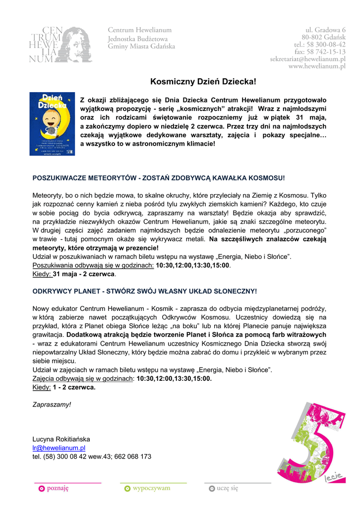 Kosmiczny Dzień Dziecka! Z okazji zbliżającego się Dnia Dziecka Centrum Hewelianum przygotowało wyjątkową propozycję - serię „kosmicznych” atrakcji! Wraz z najmłodszymi oraz ich rodzicami świętowanie rozpoczniemy już w piątek 31 maja, a zakończymy dopiero w niedzielę 2 czerwca. Przez trzy dni na najmłodszych czekają wyjątkowe dedykowane warsztaty, zajęcia i pokazy specjalne… a wszystko to w astronomicznym klimacie! POSZUKIWACZE METEORYTÓW - ZOSTAŃ ZDOBYWCĄ KAWAŁKA KOSMOSU! Meteoryty, bo o nich będzie mowa, to skalne okruchy, które przyleciały na Ziemię z Kosmosu. Tylko jak rozpoznać cenny kamień z nieba pośród tylu zwykłych ziemskich kamieni? Każdego, kto czuje w sobie pociąg do bycia odkrywcą, zapraszamy na warsztaty! Będzie okazja aby sprawdzić, na przykładzie niezwykłych okazów Centrum Hewelianum, jakie są znaki szczególne meteorytu. W drugiej części zajęć zadaniem najmłodszych będzie odnalezienie meteorytu „porzuconego” w trawie - tutaj pomocnym okaże się wykrywacz metali. Na szczęśliwych znalazców czekają meteoryty, które otrzymają w prezencie! Udział w poszukiwaniach w ramach biletu wstępu na wystawę „Energia, Niebo i Słońce”. Poszukiwania odbywają się w godzinach: 10:30,12:00,13:30,15:00. Kiedy: 31 maja - 2 czerwca. ODKRYWCY PLANET - STWÓRZ SWÓJ WŁASNY UKŁAD SŁONECZNY! Nowy edukator Centrum Hewelianum - Kosmik - zaprasza do odbycia międzyplanetarnej podróży, w którą zabierze nawet początkujących Odkrywców Kosmosu. Uczestnicy dowiedzą się na przykład, która z Planet obiega Słońce leżąc „na boku” lub na której Planecie panuje największa grawitacja. Dodatkową atrakcją będzie tworzenie Planet i Słońca za pomocą farb witrażowych - wraz z edukatorami Centrum Hewelianum uczestnicy Kosmicznego Dnia Dziecka stworzą swój niepowtarzalny Układ Słoneczny, który będzie można zabrać do domu i przykleić w wybranym przez siebie miejscu. Udział w zajęciach w ramach biletu wstępu na wystawę „Energia, Niebo i Słońce”. Zajęcia odbywają się w godzinach: 10:30,12:00,13:30,15:00. Kiedy: 1 - 2 czerwca. Zapraszamy! Lucyna Rokitiańska [email protected] tel. (58) 300 08 42 wew.43; 662 068 173