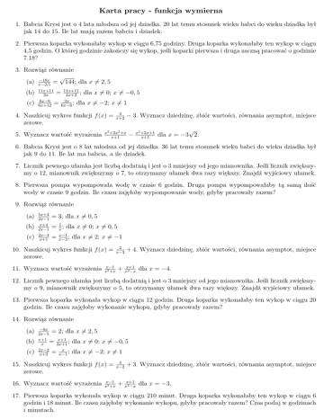 Karta pracy - funkcja wymierna 1. Babcia Krysi jest o 4 lata młodsza od jej dziadka. 20 lat temu stosunek wieku babci do wieku dziadka był jak 14 do 15. Ile lat mają razem babcia i dziadek. 2. Pierwsza koparka wykonałaby wykop w ciągu 6,75 godziny. Druga koparka wykonałaby ten wykop w ciągu 4,5 godzin. O której godzinie zakończy się wykop, jeśli koparki pierwsza i druga zaczną pracować o godzinie 7.18? 3. Rozwiąż równanie √ −18x (a) x−2,5 = 144; dla x 6= 2, 5 (b) (c) 11x+11 = 11x+11 ; dla x 2x 4x+2 6x−6 3x = 6x−6 ; dla x 6= 6x+12 6= 0; x 6= −0, 5 −2; x 6= 1 4. Naszkicuj wykres funkcji f (x) = zerowe. 5. Wyznacz wartość wyrażenia 4 x+2 − 3. Wyznacz dziedzinę, zbiór wartości, równania asymptot, miejsce x3 +2x2 +x x+1 − x2 +2x+1 x+1 √ dla x = −3 2. 6. Babcia Krysi jest o 8 lat młodsza od jej dziadka. 36 lat temu stosunek wieku babci do wieku dziadka był jak 9 do 11. Ile lat ma babcia, a ile dziadek. 7. Licznik pewnego ułamka jest liczbą dodatnią i jest o 3 mniejszy od jego mianownika. Jeśli licznik zwiększymy o 12, mianownik zwiększymy o 7, to otrzymamy ułamek dwa razy większy. Znajdź wyjściowy ułamek. 8. Pierwsza pompa wypompowała wodę w czasie 6 godzin. Druga pompa wypompowałaby tą samą ilość wody w czasie 9 godzin. Ile czasu zajęłoby wypompowanie wody, gdyby pracowały razem? 9. Rozwiąż równanie (a) (b) (c) 5x+4 2x−1 x+4 2x−1 2x−4 x+1 = 3; dla x 6= 0, 5 = x1 ; dla x 6= 0; x 6= 0, 5 = x−1 ; x−2 dla x 6= 2; x 6= −1 10. Naszkicuj wykres funkcji f (x) = zerowe. 11. Wyznacz wartość wyrażenia x−1 x2 +x 2 x−3 + + 4. Wyznacz dziedzinę, zbiór wartości, równania asymptot, miejsce x+1 x2 −x dla x = −4. 12. Licznik pewnego ułamka jest liczbą dodatnią i jest o 3 mniejszy od jego mianownika. Jeśli licznik zwiększymy o 9, mianownik zwiększymy o 5, to otrzymamy ułamek dwa razy większy. Znajdź wyjściowy ułamek. 13. Pierwsza koparka wykonała wykop w ciągu 12 godzin. Druga koparka wykonałaby ten wykop w ciągu 20 godzin. Ile czasu zajęłoby wykonanie wykopu, gdyby pracowały razem? 14. Rozwiąż równanie (a) (b) (c) −6x = 2; dla x 6= 2x−5 x+1 x+1 = 2x+1 ; dla x x 2x−2 x = x−1 ; dla x x+2 2, 5 6= 0; x 6= −0, 5 6= −2; x 6= 1 15. Naszkicuj wykres funkcji f (x) = zerowe. 16. Wyznacz wartość wyrażenia x−1 x2 +x 4 x−2 + + 3. Wyznacz dziedzinę, zbiór wartości, równania asymptot, miejsce x+1 x2 −x dla x = −3. 17. Pierwsza koparka wykonała wykop w ciągu 210 minut. Druga koparka wykonałaby ten wykop w ciągu 6 godzin i 18 minut. Ile czasu zajęłoby wykonanie wykopu, gdyby pracowały razem? Czas podaj w godzinach i minutach. 18. Licznik pewnego ułamka jest równy 6. Jeśli mianownik tego ułamka zwiększymy o 14, a licznik zwiększymy czterokrotnie, to wartość otrzymanego nowego ułamka będzie równa 0, 96. Jaki to ułamek? 19. Rozwiąż równanie 4x−12 4x−8 = 4x+16 . 4x+8 20. Naszkicuj wykres funkcji f (x) = zerowe. ; dla x 6= 2, x 6= −2 −3 2−x + 1. Wyznacz dziedzinę, zbiór wartości, równania asymptot, miejsce 21. Pierwsza pompa wypompowała wodę w czasie 10 godzin. Druga pompa wypompowałaby tą samą ilość wody w czasie 30 godzin. Ile czasu zajęłoby wypompowanie wody, gdyby pracowały razem? Czas podaj w godzinach i minutach. 22. Mianownik pewnego ułamka jest równy 5. Jeśli mianownik tego ułamka zwiększymy trzykrotnie, a licznik zwiększymy o 12, to wartość tego ułamka się nie zmieni. Jaki to ułamek? 23. Rozwiąż równanie 4 x+1 = 6 . 3x−2 ; dla x 6= −1, x 6= 24. Naszkicuj wykres funkcji f (x) = zerowe. 5 x+1 2 3 − 2. Wyznacz dziedzinę, zbiór wartości, równania asymptot, miejsce 25. Pierwsza koparka wykonała wykop w ciągu 32 godzin. Druga koparka wykonałaby ten wykop w ciągu 48 godzin. Ile czasu zajęłoby wykonanie wykopu, gdyby pracowały razem? Czas podaj w godzinach i minutach. 26. Licznik pewnego ułamka jest równy 6. Jeśli mianownik tego ułamka zwiększymy o 5, a licznik zwiększymy dwukrotnie, to wartość tego ułamka się nie zmieni. Jaki to ułamek? 27. Rozwiąż równanie 2x−6 x−2 = 2x+8 . x+2 ; dla x 6= 2, x 6= −2 28. Naszkicuj wykres funkcji f (x) = zerowe. 2 x−2 + 4. Wyznacz dziedzinę, zbiór wartości, równania asymptot, miejsce