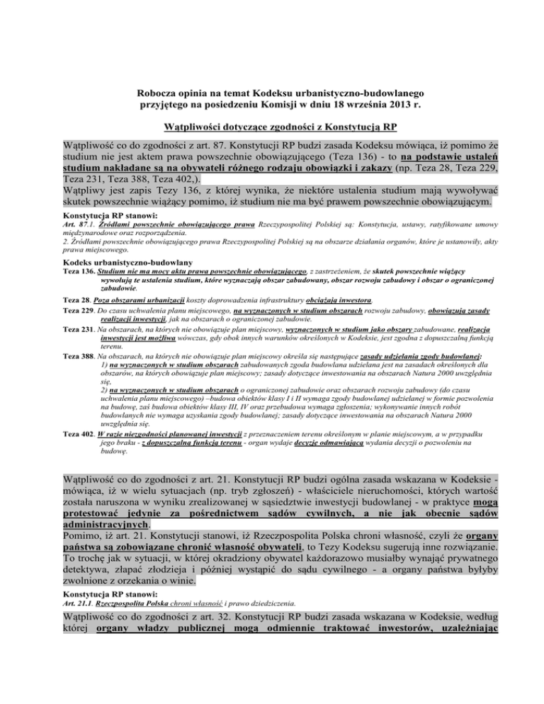 Robocza opinia na temat Kodeksu urbanistyczno-budowlanego przyjętego na posiedzeniu Komisji w dniu 18 września 2013 r. Wątpliwości dotyczące zgodności z Konstytucją RP Wątpliwość co do zgodności z art. 87. Konstytucji RP budzi zasada Kodeksu mówiąca, iż pomimo że studium nie jest aktem prawa powszechnie obowiązującego (Teza 136) - to na podstawie ustaleń studium nakładane są na obywateli różnego rodzaju obowiązki i zakazy (np. Teza 28, Teza 229, Teza 231, Teza 388, Teza 402,). Wątpliwy jest zapis Tezy 136, z której wynika, że niektóre ustalenia studium mają wywoływać skutek powszechnie wiążący pomimo, iż studium nie ma być prawem powszechnie obowiązującym. Konstytucja RP stanowi: Art. 87.1. Źródłami powszechnie obowiązującego prawa Rzeczypospolitej Polskiej są: Konstytucja, ustawy, ratyfikowane umowy międzynarodowe oraz rozporządzenia. 2. Źródłami powszechnie obowiązującego prawa Rzeczypospolitej Polskiej są na obszarze działania organów, które je ustanowiły, akty prawa miejscowego. Kodeks urbanistyczno-budowlany Teza 136. Studium nie ma mocy aktu prawa powszechnie obowiązującego, z zastrzeżeniem, że skutek powszechnie wiążący wywołują te ustalenia studium, które wyznaczają obszar zabudowany, obszar rozwoju zabudowy i obszar o ograniczonej zabudowie. Teza 28. Poza obszarami urbanizacji koszty doprowadzenia infrastruktury obciążają inwestora. Teza 229. Do czasu uchwalenia planu miejscowego, na wyznaczonych w studium obszarach rozwoju zabudowy, obowiązują zasady realizacji inwestycji, jak na obszarach o ograniczonej zabudowie. Teza 231. Na obszarach, na których nie obowiązuje plan miejscowy, wyznaczonych w studium jako obszary zabudowane, realizacja inwestycji jest możliwa wówczas, gdy obok innych warunków określonych w Kodeksie, jest zgodna z dopuszczalną funkcją terenu. Teza 388. Na obszarach, na których nie obowiązuje plan miejscowy określa się następujące zasady udzielania zgody budowlanej: 1) na wyznaczonych w studium obszarach zabudowanych zgoda budowlana udzielana jest na zasadach określonych dla obszarów, na których obowiązuje plan miejscowy; zasady dotyczące inwestowania na obszarach Natura 2000 uwzględnia się, 2) na wyznaczonych w studium obszarach o ograniczonej zabudowie oraz obszarach rozwoju zabudowy (do czasu uchwalenia planu miejscowego) –budowa obiektów klasy I i II wymaga zgody budowlanej udzielanej w formie pozwolenia na budowę, zaś budowa obiektów klasy III, IV oraz przebudowa wymaga zgłoszenia; wykonywanie innych robót budowlanych nie wymaga uzyskania zgody budowlanej; zasady dotyczące inwestowania na obszarach Natura 2000 uwzględnia się. Teza 402. W razie niezgodności planowanej inwestycji z przeznaczeniem terenu określonym w planie miejscowym, a w przypadku jego braku - z dopuszczalną funkcją terenu - organ wydaje decyzję odmawiającą wydania decyzji o pozwoleniu na budowę. Wątpliwość co do zgodności z art. 21. Konstytucji RP budzi ogólna zasada wskazana w Kodeksie mówiąca, iż w wielu sytuacjach (np. tryb zgłoszeń) - właściciele nieruchomości, których wartość została naruszona w wyniku zrealizowanej w sąsiedztwie inwestycji budowlanej - w praktyce mogą protestować jedynie za pośrednictwem sądów cywilnych, a nie jak obecnie sądów administracyjnych. Pomimo, iż art. 21. Konstytucji stanowi, iż Rzeczpospolita Polska chroni własność, czyli że organy państwa są zobowiązane chronić własność obywateli, to Tezy Kodeksu sugerują inne rozwiązanie. To trochę jak w sytuacji, w której okradziony obywatel każdorazowo musiałby wynająć prywatnego detektywa, złapać złodzieja i później wystąpić do sądu cywilnego - a organy państwa byłyby zwolnione z orzekania o winie. Konstytucja RP stanowi: Art. 21.1. Rzeczpospolita Polska chroni własność i prawo dziedziczenia. Wątpliwość co do zgodności z art. 32. Konstytucji RP budzi zasada wskazana w Kodeksie, według której organy władzy publicznej mogą odmiennie traktować inwestorów, uzależniając przydzielane inwestorom uprawnienia od sytuacji materialnej czy zawodowej tych inwestorów lub od niesprecyzowanych kryteriów (np. Teza 175, Teza 261 pkt 3, Teza 316, Teza 494, Teza 684, Teza 685 pkt 4, Teza 686 pkt 3, Konstytucja RP stanowi: • Art. 32.1. Wszyscy są wobec prawa równi. Wszyscy mają prawo do równego traktowania przez władze publiczne. 2. Nikt nie może być dyskryminowany w życiu politycznym, społecznym lub gospodarczym z jakiejkolwiek przyczyny. Kodeks urbanistyczno-budowlany Teza 175. Obowiązek zapewnienia źródeł finansowania uznaje się za spełniony, jeżeli zagwarantowanie finansowania w całości lub części następuje w drodze umowy zawartej między gminą a inwestorem. Za zgodą stron, do umowy mogą znaleźć zastosowanie przepisy niniejszego Kodeksu dotyczące umowy urbanistycznej, w zakresie dopuszczalnych kompensat należności gminy z tytułu opłat i podatków oraz wydatków inwestora z tytułu poniesionych nakładów na realizację infrastruktury technicznej i społecznej. Z Tezy 175 wynikać może, że z niektórymi inwestorami gmina może zechcieć zawrzeć umowę, że źródło finansowania inwestycji celu publicznego zapewni w całości inwestor, a z innymi inwestorami gmina może zechcieć zawrzeć umowę, że źródło finansowania inwestycji celu publicznego zapewni tylko w części inwestor (wg Kodeksu finansowanie dotyczy także lokalnych inwestycji celu publicznego, takich jak droga, inf. tech. czy przedszkole, szkoła itp., które mogą być prywatne) Teza 261. W ramach funkcji rolnej, dopuszczalna jest realizacji inwestycji polegających na: 3) budowie jednego budynku mieszkalnego w zabudowie zagrodowej, jeżeli inwestorem jest osoba: a) posiadająca grunty rolne o powierzchni nie mniejszej niż 40% średniej powierzchni gospodarstwa rolnego w powiecie, z czego co najmniej 10% powierzchni w formie prawa własności albo u