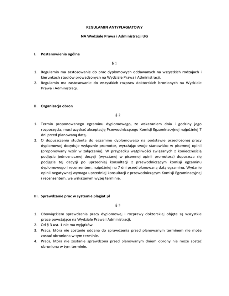 REGULAMIN ANTYPLAGIATOWY NA Wydziale Prawa i Administracji UG I. Postanowienia ogólne § 1 1. Regulamin ma zastosowanie do prac dyplomowych oddawanych na wszystkich rodzajach i kierunkach studiów prowadzonych na Wydziale Prawa i Administracji. 2. Regulamin ma zastosowanie do wszystkich rozpraw doktorskich bronionych na Wydziale Prawa i Administracji. II. Organizacja obron § 2 1. Termin proponowanego egzaminu dyplomowego, ze wskazaniem dnia i godziny jego rozpoczęcia, musi uzyskać akceptację Przewodniczącego Komisji Egzaminacyjnej najpóźniej 7 dni przed planowaną datą. 2. O dopuszczeniu studenta do egzaminu dyplomowego na podstawie przedłożonej pracy dyplomowej decyduje wyłącznie promotor, wyrażając swoje stanowisko w pisemnej opinii (proponowany wzór w załączeniu). W przypadku wątpliwości związanych z koniecznością podjęcia jednoznacznej decyzji (wyrażanej w pisemnej opinii promotora) dopuszcza się podjęcie tej decyzji po uprzedniej konsultacji z przewodniczącym komisji egzaminu dyplomowego i recenzentem, najpóźniej na 7 dni przed planowaną datą egzaminu. Wydanie opinii negatywnej wymaga uprzedniej konsultacji z przewodniczącym Komisji Egzaminacyjnej i recenzentem, we wskazanym wyżej terminie. III. Sprawdzanie prac w systemie plagiat.pl § 3 1. Obowiązkiem sprawdzenia pracy dyplomowej i rozprawy doktorskiej objęte są wszystkie prace powstające na Wydziale Prawa i Administracji. 2. Od § 3 ust. 1 nie ma wyjątków. 3. Praca, która nie zostanie oddana do sprawdzenia przed planowanym terminem nie może zostać obroniona w tym terminie. 4. Praca, która nie zostanie sprawdzona przed planowanym dniem obrony nie może zostać obroniona w tym terminie. § 4 1. Praca dyplomowa w formie elektronicznej przekazywana jest na płycie CD lub DVD do dziekanatu Elektronicznej Obsługi Procesu Dydaktycznego (zwanego dalej EOPD) w godzinach urzędowania, nie później niż na 14 dni przed wyznaczonym terminem obrony. 2. Studenta składającego pracę dyplomową obowiązuje jednocześnie termin złożenia pracy dyplomowej zgodnie z Regulaminem Studiów Rozdział V, § 28 ust. 1. 3. Na płycie musi znajdować się podpis promotora potwierdzająca zgodność pracy w wersji elektronicznej z papierową. 4. Na płycie, o której mowa w § 4 ust. 1, powinna znajdować się: a) Praca dyplomowa w formacie WORD (nr albumu.DOC lub DOCX) lub w formacie OPENOFFICE (nr albumu.ODT). b) Plik opisu pracy w formacie XML, wygenerowany ze strony https://ps.ug.edu.pl/index.web z zakładki Opis pracy dyplomowej (nr albumu.XML) 5. Płyta, o której mowa w § 4 ust. 1, powinna być podpisana pisakiem do tego przeznaczonym w następujący sposób: a) Nazwisko i imię b) Nr albumu c) Kierunek oraz tryb studiów (np.: Prawo jednolite niestacjonarne, Administracja II stopnia stacjonarna) d) Pełne dane promotora e) Podpis promotora f) Rodzaj pracy dyplomowej 6. Praca w formie elektronicznej musi zawierać treść oświadczenia dołączonego do prac dyplomowych wykonywanych w Uniwersytecie Gdańskim zgodnie z zarządzeniem Rektora nr 63/R/06 z dnia 21 grudnia 2006 roku wraz z załącznikiem. 7. Oświadczenie musi znajdować się za stroną tytułową jednak przed spisem treści. 8. Płyty, które nie będą spełniały § 4 ust. 3‐6 nie będą przyjmowane. 9. Po sprawdzeniu poprawności danych na płycie, praca zostaje przyjęta do sprawdzenia w systemie plagiat.pl zaś student wpisuje się do Rejestru prac dyplomowych przyjętych do sprawdzenia w danym roku akademickim. 10. Jeśli osoba inna niż autor pracy przynosi płytę z pracą dyplomową to ta osoba dokonuje wpisu do Rejestru wymienionego w § 4 ust. 9. 11. W pozostałych przypadkach dostarczenia płyty z praca dyplomową wpisu do Rejestru w § 4 ust. 9 dokonuje pracownik EOPD. 12. Do rozpraw doktorskich stosuje się § 4 ust. 1, ust. 4 p‐t a), ust. 5; ust. 8‐11; ust. 9. § 5 1. Po przyjęciu płyty z pracą jej zawartość zostaje przegrana do katalogu NAZWISKO Imię – nr albumu. 2. Plik XML z opisem pracy zostaje wgrany do systemu FAST do zakładki Dyplom. 3. Z pliku Word z pracą dyplomową zostaje stworzony przez osobę uprawnioną z EOPD plik txt w kodowaniu Unicode. 4. Plik txt o nazwie popr. txt zostaje wgrany do systemu plagiat.pl. 5. Do rozpraw doktorskich stosuje się § 4 ust. 3, ust. 4. 6. Po przyjęciu płyty z rozprawą doktorską jej zawartość zostaje przegrana do katalogu ROZPRAWA DOKTORSKA‐NAZWISKO Imię. IV. Przekazywanie sprawdzonych prac promotorom § 6 1. Praca dyplomowa jest wprowadzana do sprawdzenia w systemie plagiat.pl przez osobę/osoby wyznaczone przez Dziekana. 2. Praca dyplomowa sprawdzana jest w systemie plagiat.pl niezwłocznie po jej otrzymaniu. 3. Po otrzymaniu raportu z systemu nagrywana jest druga płyta, na której znajdują się: a) Oryginalna zawartość płyty przyniesiona przez studenta nagrana w katalogu o nazwie NAZWISKO Imię – nr albumu b) Do katalogu wymienionego w § 6 ust. 3 p‐t a) tworzony i dogrywany jest plik tekstowy (txt) w kodowaniu Unicode przez osobę do tego uprawnioną c) Katalog z dodatkami dla promotorów d) Raport z systemu plagiat i. Skrócony – RaportPlagiat‐NAZWISKO Imię‐skrocony.html ii. Pełny – RaportPlagiat‐NAZWISKO Imię.html 4. Płyta opisana i opieczętowana jest w sposób, który nie budzi wątpliwości, że została wystawiona przez osobę uprawnioną do przekazywania raportów. 5. Do nagranej płyty dołączany jest skrócony raport z systemu plagiat.pl w wersji papierowej. 6. Wersja papierowa jest opieczętowana i podpisana przez osobę sporządzającą dany raport. 7. Raport w wersji papierowej wraz z płytą oryginalną studenta i płytą z nagranym raportem trafia do Dziekanatu nie później niż 4 dni od wygenerowania raportu. 8. Dziekanat ma obowiązek przekazać płytę z raportem odpowiedniemu promotorowi lub sekretariatowi katedry nie później niż następnego dnia roboczego po otrzymaniu płyty. 9. Do rozpraw doktorskich stos