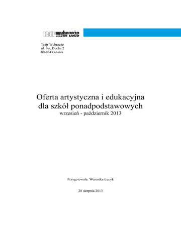 Teatr Wybrzeże ul. Św. Ducha 2 80-834 Gdańsk Oferta artystyczna i edukacyjna dla szkół ponadpodstawowych wrzesień - październik 2013 Przygotowała: Weronika Łucyk 28 sierpnia 2013 Gdańsk, 28 sierpnia 2013 Teatr Wybrzeże ul. Św. Ducha 2 80-834 Gdańsk Szanowni Państwo, Teatr Wybrzeże niebawem rozpoczyna nowy sezon teatralny. W trosce o młodego widza zdecydowaliśmy się poszerzyć naszą dotychczasową ofertę edukacyjną. Proponujemy państwu różnorode warsztaty oraz prelekcje, które mają na celu ułatwienie odbioru spektaklu i przybliżenie materii, jaką jest teatr. Zachęcam do zapoznania się z ofertą, w której znajdą Państwo szczegółowe informacje. Pozdrawiam serdecznie, Weronika Łucyk specjalistka ds. edukacji Teatr Wybrzeże kom. 519 155 950 tel. 58 301 70 27 www.teatrwybrzeze.pl Warsztaty teatralne Oferujemy warsztaty teatralne dobrane tematycznie pod kątem spektakli z repertuaru Teatru Wybrzeże bądź niezależne od spektaklu. Warsztat tematyczny odbywa się przed obejrzeniem przez uczestników spektaklu, ale niekoniecznie w tym samym dniu. Warsztat służy wprowadzeniu widza w tematy podejmowane przez twórców przedstawienia. Tym samym pragniemy poszerzyć perspektywę interpretacyjną i umożliwić publiczności pełniejszy odbiór przedstawienia. Warsztaty są przeznaczone dla osób w każdym wieku i odbywają się w teatrze. Warunkiem uczestnictwa jest okazanie zakupionego biletu na dany tytuł z bieżącego repertuaru teatru. Warsztaty niezalezne od spektaklu przeznaczone są dla osób, które pragną się dodatkowo rozwijać lub nie mogą uczestniczyć w warsztatach tematycznych. Opcja przeznaczona jest dla grup zorganizowanych. Koszt udziału wynosi 5 zł od osoby. Oba warianty zajęć mają charakter warsztatowy. Naszym celem jest praktyczne zapoznanie uczestników z językiem teatru poprzez użycie formy dramy, pracy z tekstem czy rekwizytem, a także ćwiczeń ruchowych. Czas trwania warsztatów wynosi ok. 90 minut Termin warsztatów każdorazowo dostosowywany jest do potrzeb grupy. Jednorazowo w warsztacie może wziąć udział do 30 osób. Prelekcje teatralne Niekiedy teatr współczesny stawia przed widzem bardzo trudne zadanie, gdyż operuje językiem dla niego niezrozumiałym. Celem prelekcji jest wyposażenie odbiorców w narzędzia do percepcji współczesnego teatru. Prelekcje mają w przystępny sposób zapoznać słuchaczy z gatunkami dramatycznymi i teatralnymi oraz przygotować widza na odbiór różnorodnych konwencji i estetyk, z którymi może się spotkać w teatrze. Oferta przeznaczona dla grup zorganizowanych. Bezpłatne prelekcje prowadzone są na zamówienie w szkołach i placówkach dydaktycznych. Warsztaty krytyki teatralnej Zajęcia dedykowane są wszystkim miłośnikom teatru zainteresowanym rozmową o teatrze, a także tym, którzy chcą odkryć teatr na nowo i wzbogacić swoje umiejętności badawcze. Celem warsztatów jest poszerzenie zdolności analitycznych uczestników poprzez rozwijanie sposobu patrzenia na teatr i precyzyjne formułowanie własnych wniosków. Uczestnicy warsztatów trakcie zajęć badają poszczególne elementy spektaklu (np. scenografia, dramaturgia, gra aktorska), a przede wszystkim zdobędą praktyczną umiejętność pisania o teatrze i zjawiskach kultury. Udział w zajęciach jest bezpłatny. Oferta jest przeznaczonadla grup powyżej 10 osób. Warsztat może mieć charakter jednorazowego spotkania po obejrzeniu spektaklu lub formę cykliczną. Termin oraz lokalizacja warsztatów każdorazowo dostosowywana jest do potrzeb grupy. Zwiedzanie teatru Zapraszamy grupy zorganizowane (powyżej 10 osób) do obejrzenia kulis Teatru Wybrzeże. Trasa zwiedzania uwzględnia m.in. widownię, scenę oraz pracownie teatralne w Gdańsku lub na Scenie Kameralnej w Sopocie. Zapraszamy przedszkolaków, dzieci i młodzież szkolną, wycieczki turystyczne i zorganizowane grupy dorosłych. Wycieczki odbywają się w poniedziałki między godziną 10.00 a 13.00 (czas trwania – ok. 1 godz.). Informacje dodatkowe: -grupa zwiedzających może liczyć maksymalnie 30 osób -zwiedzanie jest bezpłatne -konieczne są wcześniejsze zapisy -dokładne terminy zwiedzania określane są na podstawie bieżącego repertuaru Zapisy i szczegółowe informacje dotyczące projektów edukacyjnych: email: [email protected], kom. 519 155 950, tel. 58 301 70 27 PAN TADEUSZ Adam Mickiewicz reżyseria: Jarosław Tumidajski występują: Piotr Chys, Jerzy Gorzko, Emilia Komarnicka, Łukasz Konopka, Michał Kowalski, Jacek Labijak, Krzysztof Matuszewski, Robert Ninkiewicz, Cezary Rybiński, Maciej Szemiel, Marek Tynda, Jarosław Tyrański premiera: 16 kwietnia 2011 czas trwania: 1 godzina 30 minut (bez przerw) 1 października, Duża Scena w Gdańsku, godz. 19.00 2 października, Duża Scena w Gdańsku, godz. 10.00 2 października, Duża Scena w Gdańsku, godz. 19.00 Wszyscy znamy Pana Tadeusza. Epopeję narodową, w której nasz wieszcz Adam opisuje wspaniałym trzynastozgłoskowcem piękno naszej ojczyzny. To prawda. Ale można też przeczytać Pana Tadeusza inaczej, odrzucić okrągłe zdania z lekcji polskiego i wnikliwiej przyjrzeć się jego treści i sensom. Wtedy zapisany w nim obraz Polski wyda się nam zupełnie inny. Mickiewicz przedstawia nasz kraj jako pole bitwy, miejsce permanentnego konfliktu, w którym spierają się wszyscy i o wszystko. Opisuje patologie polskości. Otwiera pole do debaty, do krytycznej dyskusji o narodzie. Za romansowo-sensacyjną fabułą i urzekającymi opisami przyrody kryje się ostry i bardzo celnie naszkicowany portret nas samych, toczących wojnę o Polskę. "Pan Tadeusz (...) Teatru Wybrzeże nie jest kolejnym dziełem "ku pokrzepieniu serc". To mocny i bezkompromisowy obraz Polski sprzed dwóch wieków i Polski dzisiejszej.” Mirosław Baran, Gazeta Wyborcza Trójmiasto Ceny biletów: uczniowie: 20 zł wstęp opiekunów grup: bezpłatne zaproszenia (1 na 10 osób) Rezerwacja biletów grupowy