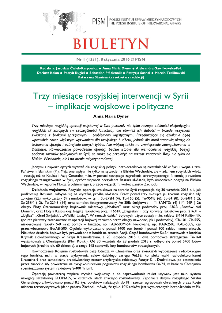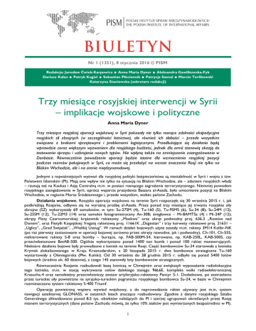 Nr 1 (1351), 8 stycznia 2016 © PISM . . . . . . Redakcja: Jarosław Ćwiek-Karpowicz Anna Maria Dyner Aleksandra Gawlikowska-Fyk Dariusz Kałan Patryk Kugiel Sebastian Płóciennik Patrycja Sasnal Marcin Terlikowski Katarzyna Staniewska (sekretarz redakcji) Trzy miesiące rosyjskiej interwencji w Syrii – implikacje wojskowe i polityczne Anna Maria Dyner Trzy miesiące rosyjskiej operacji wojskowej w Syrii pokazały nie tylko rosnące zdolności ekspedycyjne rosyjskich sił zbrojnych (w szczególności lotnictwa), ale również ich słabości – przede wszystkim związane z brakami sprzętowymi i problemami logistycznymi. Przedłużające się działania będą wprawdzie coraz większym wyzwaniem dla rosyjskiego budżetu, jednak dla armii stanowią okazję do testowania sprzętu i uzbrojenia nowych typów. Nie wpłyną także na zmniejszenie zaangażowania w Donbasie. Równocześnie powodzenie operacji będzie istotne dla wzmocnienia rosyjskiej pozycji podczas rozmów pokojowych w Syrii, co może się przełożyć na wzrost znaczenia Rosji nie tylko na Bliskim Wschodzie, ale i na arenie międzynarodowej. Jednymi z najważniejszych wyzwań dla rosyjskiej polityki bezpieczeństwa są niestabilność w Syrii i wojna z tzw. Państwem Islamskim (PI). Mają one wpływ nie tylko na sytuację na Bliskim Wschodzie, ale – zdaniem rosyjskich władz – rzutują też na Kaukaz i Azję Centralną m.in. w postaci rosnącego zagrożenia terrorystycznego. Niemniej powodem rosyjskiego zaangażowania w Syrii, oprócz wsparcia prezydenta Baszara al-Asada, było umocnienie pozycji na Bliskim Wschodzie, w regionie Morza Śródziemnego i, przede wszystkim, wobec państw Zachodu. Działania wojskowe. Rosyjska operacja wojskowa na terenie Syrii rozpoczęła się 30 września 2015 r. i, jak podkreślają Rosjanie, odbywa się na wyraźną prośbę al-Asada. Przez ponad trzy miesiące jej trwania rosyjskie siły zbrojne (SZ) wykorzystały 69 samolotów, w tym: Su-27SM (4), Tu-160 (5), Tu-95MS (6), Su-34 (8), Su-24M (12), Su-25SM (12), Tu-22M3 (14) oraz samolot fotogrametryczny An-30B; śmigłowce – Mi-8AMTSz (4) i Mi-24P (12); okręty Floty Czarnomorskiej: krążownik rakietowy „Moskwa” oraz okręt podwodny proj. 636.3 „Rostów nad Donem”, oraz Flotylli Kaspijskiej: fregatę rakietową proj. 11661K „Dagestan” i trzy korwety rakietowe proj. 21631 – „Uglicz”, „Grad Swijażsk”, „Wielikij Ustiug”. W ramach działań bojowych użyte zostały m.in. rakiety 3M14 Kalibr-NK (po raz pierwszy zastosowane w operacji bojowej zarówno przez okręty nawodne, jak i podwodny), Ch-101, Ch-555, niekierowane rakiety S-8 oraz bomby – burzące, np. FAB-500M-54, kierowane, np. KAB-250L, KAB-500S, czy przeciwbetonowe BetAB-500. Ogólnie wykorzystano ponad 1400 ton bomb i ponad 100 rakiet manewrujących. Niektóre działania bojowe były prowadzone z lotnisk na terenie Rosji. Część bombowców Su-34 startowała z lotniska Krymsk zlokalizowanego w Kraju Krasnodarskim, a 20 listopada 2015 r. dwa bombowce strategiczne Tu-160 wystartowały z Oleniegorska (Płw. Kolski). Od 30 września do 28 grudnia 2015 r. odbyło się ponad 5400 lotów bojowych (średnio ok. 60 dziennie), z czego 145 stanowiły loty bombowców strategicznych. Równocześnie Rosjanie rozbudowali bazę lotniczą w Chmejmim oraz zwiększyli wyposażenie radiolokacyjne tego lotniska, m.in. w stację wykrywania celów dalekiego zasięgu 96Ł6E, kompleks walki radioelektronicznej Krasucha-4 oraz samobieżny przeciwlotniczy zestaw artyleryjsko-rakietowy Pancyr S-1. Dodatkowo, po zestrzeleniu przez tureckie siły powietrzne na syryjsko-tureckim pograniczu rosyjskiego bombowca Su-24, w bazie w Chmejmim rozmieszczono system rakietowy S-400 Triumf. Operację powietrzną wspiera wywiad wojskowy, a do naprowadzania rakiet używany jest m.in. system nawigacji satelitarnej GLONASS, w ostatnich latach znacząco rozbudowany. Zgodnie z danymi rosyjskiego Sztabu Generalnego zlikwidowano ponad 8,5 tys. obiektów należących do PI i szerzej ugrupowań określanych przez Rosję mianem terrorystycznych (dane państw Zachodu mówią, że tylko 10% ataków jest wymierzonych bezpośrednio w PI). 1 Atakowano głównie miejsca koncentracji wrogich wojsk, punkty dowodzenia, bazy, magazyny oraz linie komunikacyjne. Rosyjskie wsparcie zostało wykorzystane przez syryjską armię rządową, która prowadzi udaną kontrofensywę m.in. w prowincjach Aleppo, Homs, Idlib i Latakia. W czasie trzech miesięcy trwania operacji zginęło dwóch rosyjskich żołnierzy – dowódca zestrzelonego przez tureckie lotnictwo bombowca Su-24 oraz żołnierz piechoty morskiej uczestniczący w operacji ratunkowej po tym zdarzeniu. Rosja straciła też dwie maszyny – Su-24 oraz śmigłowiec Mi-8. Słabości rosyjskich SZ. W trakcie syryjskiej operacji wojskowej ujawniły się liczne problemy jednostek walczących z PI. Zestrzelenie rosyjskiego bombowca Su-24 przez turecki F-16 pokazało, że Rosjanie nie brali pod uwagę możliwości ataku na samolot. Chodzi tu zarówno o brak pokładowych systemów obrony pasywnej, jak i o to, że prowadziły one działania bojowe bez osłony myśliwców. Dopiero po incydencie rosyjskie władze zdecydowały, że myśliwce udzielą wsparcia samolotom bombowym, a do bazy w Chmejmim zostanie dostarczony system S-400. Postanowiono też, że dodatkowym wsparciem dla lotnictwa ma być krążownik Moskwa, na którego pokładzie znajduje się system S-300 Fort. W trakcie operacji rosyjskie Wojska Powietrzno-Kosmiczne odbywały nawet do 100 lotów bojowych dziennie, co odbiło się niekorzystnie na działających tam jednostkach – już w połowie października 2015 r. ok. 30% samolotów było niezdolnych do akcji. Wykorzystywanym maszynom nie sprzyja poza tym syryjski klimat. Duża intensywność działań uwidoczniła również rosyjskie problemy z logistyką, spowodowane przede wszystkim brakiem doświadczenia w operacjach ekspedycyjnych. Niemniej z duży