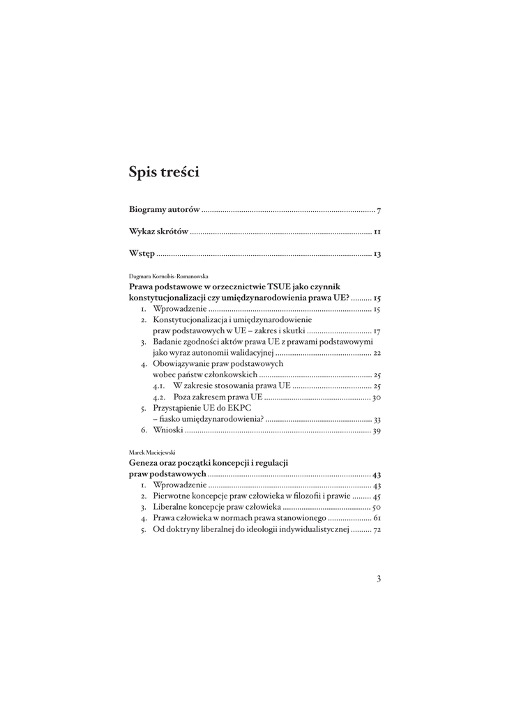Spis treści Biogramy autorów ................................................................................... 7 Wykaz skrótów ....................................................................................... 11 Wstęp ....................................................................................................... 13 Dagmara Kornobis-Romanowska Prawa podstawowe w orzecznictwie TSUE jako czynnik konstytucjonalizacji czy umiędzynarodowienia prawa UE? .......... 15 1. Wprowadzenie .............................................................................. 15 2. Konstytucjonalizacja i umiędzynarodowienie praw podstawowych w UE – zakres i skutki ............................... 17 3. Badanie zgodności aktów prawa UE z prawami podstawowymi jako wyraz autonomii walidacyjnej .............................................. 22 4. Obowiązywanie praw podstawowych wobec państw członkowskich ...................................................... 25 4.1. W zakresie stosowania prawa UE ...................................... 25 4.2. Poza zakresem prawa UE ................................................... 30 5. Przystąpienie UE do EKPC – fiasko umiędzynarodowienia? ................................................... 33 6. Wnioski ......................................................................................... 39 Marek Maciejewski Geneza oraz początki koncepcji i regulacji praw podstawowych .............................................................................. 43 1. Wprowadzenie .............................................................................. 43 2. Pierwotne koncepcje praw człowieka w filozofii i prawie ......... 45 3. Liberalne koncepcje praw człowieka .......................................... 50 4. Prawa człowieka w normach prawa stanowionego ..................... 61 5. Od doktryny liberalnej do ideologii indywidualistycznej .......... 72 3 Unia Europejska w roli gwaranta i promotora praw podstawowych Robert Grzeszczak Zupełny i efektywny system ochrony praw podstawowych w Unii Europejskiej ............................................................................... 77 1 Uwagi wprowadzające ................................................................... 78 2. Pluralizm wartości i pluralizm źródeł ochrony praw człowieka .................................................. 80 3. Koncepcja ochrony praw podstawowych w Unii Europejskiej – wprowadzenie do problematyki ............. 82 4. Strukturalna niespójność: zagrożenie konfliktami proceduralnymi i prawnomaterialnymi ....................................... 85 5. Traktatowy wymóg przystąpienia Unii do Konwencji i ochrona autonomii jej prawa ............................. 90 6. Trzecia płaszczyzna – standard krajowy ...................................... 97 Podsumowanie ................................................................................... 99 Aleksander Cieśliński Status wolności gospodarczej w systemie Karty praw podstawowych Unii Europejskiej ................................ 103 1. Ogólne rozumienie wolności gospodarczej .............................. 103 2. Charakterystyka właściwych postanowień Karty praw podstawowych ......................................................... 106 2.1 Rola artykułu 15 ................................................................... 107 2.2 Artykuł 16 i problem jego ogólnego brzmienia ................. 113 2.3 Wyzwanie określenia wzajemnych relacji artykułów 15 i 16 ........................................................117 3. Wolność gospodarcza w aktualnym orzecznictwie .................. 124 3.1 Ograniczone znaczenie artykułu 15 ................................... 124 3.2 Zakres zastosowania artykułu 16 ....................................... 126 3.2.1 Bezpośrednia kontrola działań instytucji unijnych .................................................. 127 3.2.2 Kontrola środków krajowych ................................ 129 3.3 Zagadnienie powiązania ochrony wolności gospodarczej i własności ..................................................... 133 3.4 Szczególny przypadek spraw z zakresu rynku wewnętrznego .......................................................... 136 4 Spis treści Krystyna Kowalik-Bańczyk Prawo do dobrej administracji z Karty praw podstawowych UE w postępowaniach krajowych ..................................................... 143 1. Prawo do dobrej administracji .................................................... 145 2. Zakres podmiotowy stosowania art. 41 KPP ............................. 152 2.1. Podmioty uprawnione ....................................................... 153 2.2. Podmioty związane art. 41 KPP ....................................... 154 3. Praktyka sięgania po art. 41 KPP przez sądy polskie ................ 157 3.1. Zasada państwa prawa ........................................................ 158 3.2. Obowiązek działania w rozsądnym terminie ................... 159 3.3. Technika powoływania art. 41 przez polskie sądy administracyjne ................................. 160 4. Podsumowanie ............................................................................. 161 Monika Szwarc Stosowanie Karty praw podstawowych w dziedzinie prawa karnego Unii Europejskiej ..................................................... 165 1. Wprowadzenie ............................................................................. 165 2. Stosowanie Karty praw podstawowych w kontekście wymierzania przez państwa członkowskie sankcji (karnych) – za naruszenia prawa Unii Europejskiej ................................... 170 3. Stosowanie Karty w kontekście wymierzania przez państwa członkowskie sankcji (karnych) – w ramach korzystania z wyjątków od swobód rynku wewnętrznego ............................ 176 4. Obowiązki sądu krajowego w przypadku związania państwa członkowskiego Kartą praw podstawowych ............................ 180 Zakończen
