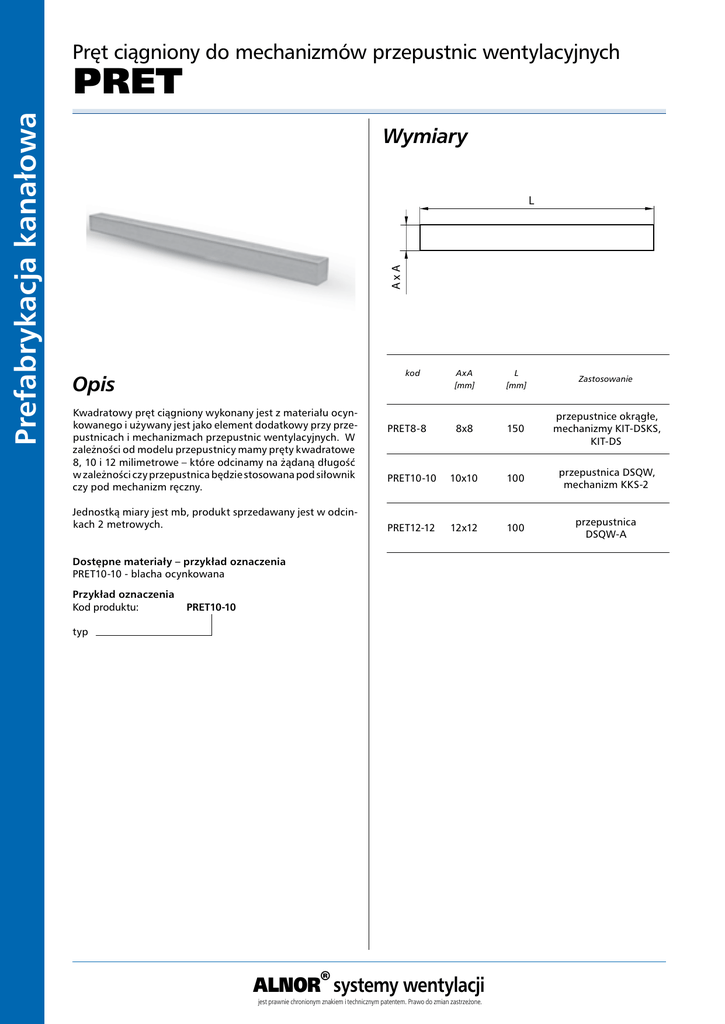 Pręt ciągniony do mechanizmów przepustnic wentylacyjnych Pobierz Wentyle Pobierz AlnorCAM Zamawiaj w B2B Wymiary L AxA Prefabrykacja kanałowa PRET kod Opis Kwadratowy pręt ciągniony wykonany jest z materiału ocynkowanego i używany jest jako element dodatkowy przy przepustnicach i mechanizmach przepustnic wentylacyjnych. W zależności od modelu przepustnicy mamy pręty kwadratowe 8, 10 i 12 milimetrowe – które odcinamy na żądaną długość w zależności czy przepustnica będzie stosowana pod siłownik czy pod mechanizm ręczny. Jednostką miary jest mb, produkt sprzedawany jest w odcinkach 2 metrowych. AxA [mm] L [mm] Zastosowanie 8x8 150 przepustnice okrągłe, mechanizmy KIT-DSKS, KIT-DS PRET10-10 10x10 100 przepustnica DSQW, mechanizm KKS-2 PRET12-12 12x12 100 przepustnica DSQW-A PRET8-8 Dostępne materiały – przykład oznaczenia PRET10-10 - blacha ocynkowana Przykład oznaczenia Kod produktu: PRET10-10 typ http://www.alnor.com.pl/produkty_pl/budowa-kanalow.html ALNOR® systemy wentylacji jest prawnie chronionym znakiem i technicznym patentem. Prawo do zmian zastrzeżone.