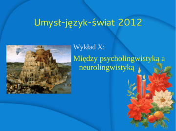 Umysł-język-świat 2012 Wykład X: Między psycholingwistyką a neurolingwistyką Teorie neurolingwistyczne John Hughlings Jackson (1835 - 1911) badał jak bodźce wywołują reakcje i złożoność reakcji Dwa poziomy języka: poziom automatyczny poziom propozycjonalny: forma i stopień elastyczności mowa to część myślenia zastosowanie ewolucyjnych zasad Spencera do opisu układu nerwowego 3 poziomy funkcji: automatyczne odruchy, automatyczne działania, działania intencjonalne antylokalizm: “lokalizacja symptomów nie może być identyfikowana z lokalizacją funkcji” Teorie neurolingwistyczne Stanowiska holistyczne Pierre Marie: afazja: zaburzenie obejmujące upośledzenie intelektualne AW: ubytek ogólnej inteligencji; AB: anarthria (trudności artykulacji) + afazja Henry Head: uszkodzenia mózgu powodują “asymbolię” (zarówno f. werbalne, jak i niewerbalne) zasięg lezji określa stopień zaburzenia symbolicznego 4 typy afazji (związane z typami symbolicznego myślenia): werbalna (motoryczna), syntaktyczna (agramatyzm), nominalna (zab. nazywania), semantyczna (zab. przypisywania znaczeń) Wybrane teorie neurolingwistyczne Stanowiska holistyczne - cd. Kurt Goldstein: badania nad afazją amnestyczną afazję wywołuje “niezdolność do zajmowania abstrakcyjnej postawy”, tzn niezdolność do: podejmowania inicjatywy, zmiany i wyboru aspektu, jednoczesnego utrzymywania w pamięci rozmaitych aspektów, wybór tego, co istotne z całości i in. Karl Lashley: teoria mózgowej ekwipotencji i efektu masowego jednostka psychologiczna nie gwarantuje jedności neurologicznej Teorie neurolingwistyczne Dynamiczna lokalizacja funkcji Iwan Pawłow: złożone zachowanie nie może być realizowane przez ustalone i izolowane struktury mózgowe wyłania się ono w ontogenetycznym (osobniczym) rozwoju systemów dynamicznych Lew Wygotski: najpierw: co lokalizować, później gdzie funkcje analizowane w kontekście rozwoju ontogenetycznego funkcja: złożona działalność, którą (cały) organizm adaptuje do określonego zadania; wykonywana na wiele sposobów Lingwistyka a afazjologia Roman Jakobson (1896 - 1982) badania nad afazją testem dla teorii lingwistycznych analiza zaburzeń opisowymi metodami lingwistyki – lepsze zrozumienie roli mózgu w mowie zależności pomiędzy: uniwersaliami lingwistycznymi, rozwojem języka dzieci i symptomami afazji Dwa typy operacji językowych i afazji: wybór jednostek językowych (anomia i parafazje) zestawienia tych jednostek (agramatyzm), a dokładniej: kodowanie – dekodowanie ograniczenie – przerwanie (stopień zaburzenia) ciągłość - współwystępowanie Model Levelta leksykonu mentalnego Poziom leksemów (formy słów) Poziom lematów (formy gramatyczne, własności semantyczne) Poziom pojęciowy (znaczeniowy) – wykracza poza wiedzę lingwistyczną Leksykon mentalny: przechowalnia informacji dot. znaczeń słów, informacji gramatycznych oraz form, jakie słowa mogą przyjmować Problem organizacji leksykonu mentalnego zmienność użycie skutkuje łatwiejszym dostępem Eksperymenty z prymowaniem Problem liczby systemów semantycznych Model Levelta leksykonu mentalnego Neuronalne podłoże leksykonu Parafazje semantyczne głęboka dysleksja demencja semantyczna Warrington – problemy z nazywaniem biologicznych obiektów i tworów człowieka Modularność/interaktywność Czy systemy takiej jak zapamiętywanie, uwaga, rozumienie i produkowanie wypowiedzi współdziałają? A jeśli tak, to na jakim etapie przetwarzania języka? Podejście modularne (Fodor): proces analizy przebiega od dołu (dane sensoryczne) do góry (poziom pojęciowy) Podejście interaktywne (McClelland, Rumelhart): procesy wyższego poziomu mogą wpływać na anlizy niższego poziomu (np.. analizy percepcyjne) Model pojmowania języka Preleksykalne etapy: analiza akustyczna i wzrokowa Fonemy: najmniejsze elementy dźwiękowe odgrywające rolę w różnicach znaczeniowych; dźwięczność, mięjsce artykulacji, sposób artykulacji; problem segmentacji Selekcja leksykalna: dobór reprezentacji leksykalnej najlepiej pasującej do danych wejściowych (sensorycznych) Czytanie a słuchanie: ścieżki dostępu do leksykonu: Bezpośrednia droga dane ortograficzne na leksykalne reprezentacje Przekład z grafemów na fonemy i za ich pośrednictwem dostęp do leksykonu Model pojmowania / model mówienia Pojmowanie słów Leksykalny dostęp – leksykalna selekcja – leksykalna integracja /k/: kapelusz, kosz, kubek, krzew, kareta, kasza, kapok, ... /ka/: kapelusz, kareta, kasza, kapok /kap/: kapelusz, kapok, ... Anne Cutler (1995): rola „rywalizacji” w rozpoznawaniu słów Systemy mózgowe: Zakręt skroniowy górny Bruzda skroniowa górna: rozróżnienie dźwięków mowy i innych Zakręt skroniowy środkowy: fonologiczne aspekty słowa Zakręt środkowy dolny: aspekty leksykalno-semantyczne Zakręt kątowy