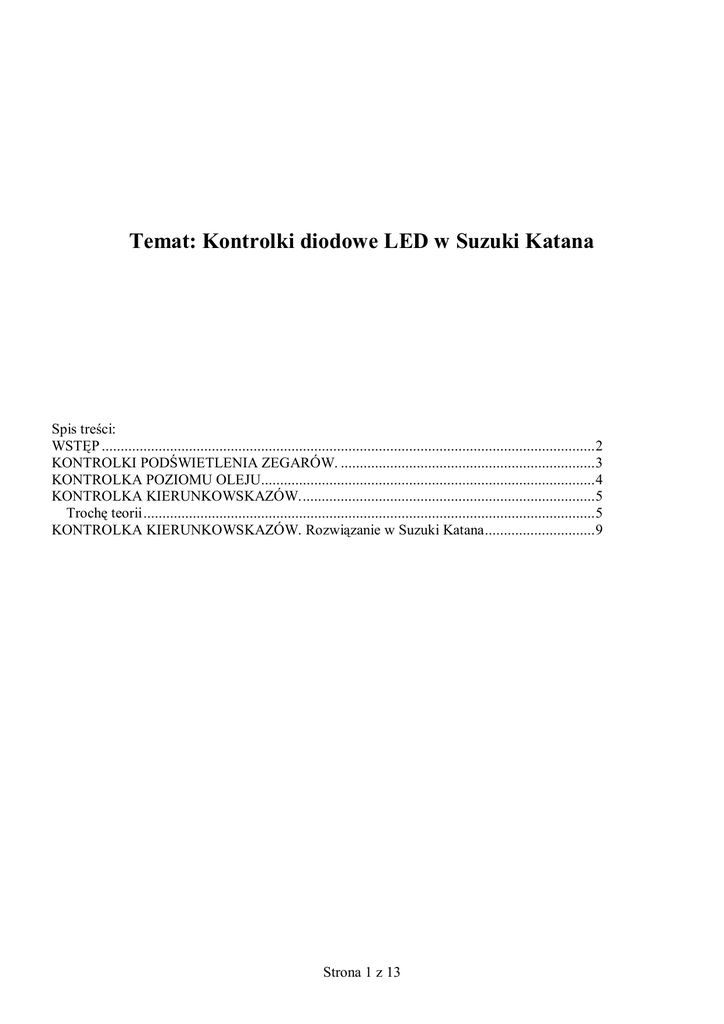 Temat: Kontrolki diodowe LED w Suzuki Katana Spis treści: WSTĘP ..................................................................................................................................2 KONTROLKI PODŚWIETLENIA ZEGARÓW. ...................................................................3 KONTROLKA POZIOMU OLEJU........................................................................................4 KONTROLKA KIERUNKOWSKAZÓW..............................................................................5 Trochę teorii.......................................................................................................................5 KONTROLKA KIERUNKOWSKAZÓW. Rozwiązanie w Suzuki Katana.............................9 Strona 1 z 13 WSTĘP Do podświetlania zegarów i kontrolek (kierunkowskazów i poziomu oleju) zastosowano fabrycznie żarówki. Są to żarówki typu R5 / T5 wciskane o mocy 1,2W. Oczywiście można zakupić np. na Allegro takie żarówki w wersji kolorowej i w ten sposób uatrakcyjnić podświetlenie naszych zegarów. Żarówki posiadają jednak wiele wad, często ulegają przepaleniu, mają stosunkowo małą moc i co za tym słabo oświetlają wskaźniki, a jeśli chodzi o kontrolki kierunkowskazów i oleju ich niewielka jasność wynikająca z małej mocy 1,2W powoduje, że np. w słoneczny dzień są one słabo widoczne. Rozwiązaniem jest zastosowanie diod LED, które posiadają niemal same zalety: duża trwałości sięgająca 100 tys godzin, mały pobór prądu, dostępność w wielu kolorach a przede wszystkim większa jasność w stosunku do standardowych żarówek. W ostatnim okresie kontrolki LED bardzo potaniały, i już za kilka (kilkanaście) złotych możemy mieć takie oświetlenie. Zastosowanie diod LED pozwala w łatwy sposób uatrakcyjnić nasz pojazd, a także spowodować że kontrolki będą dobrze widoczne także w słońcu. Rys. 1_KONTROLKI.JPG Opis do rysunku: A u góry = oryginalna oprawka z żarówką od kontrolki kierunkowskazów lub oleju A na dole = wyciągnięta z oprawki żarówka R5 / T5 12V 1,2W B u góry = oryginalna oprawka z założoną zamiast żarówki dioda LED o barwie białej B na dole = diodowy zamiennik żarówki (całoszklanej na wcisk ) R5 12V o barwie świecenia białej B u góry = oryginalna oprawka z założoną zamiast żarówki dioda LED o barwie niebieskiej B na dole = diodowy zamiennik żarówki (całoszklanej na wcisk ) R5 12V o barwie świecenia niebieskiej. Dostępnych jest wiele kolorów diod: niebieski, biały xenon, czerwony, zielony, pomarańczowy. Możemy dobrać kolory wg naszych potrzeb i preferencji. Strona 2 z 13 KONTROLKI PODŚWIETLENIA ZEGARÓW. Rys. 2_ZEGARY.JPG Opis do rysunku: Strzałkami zaznaczono trzy oprawki (oprawki w kolorze czarnym) od żarówek podświetlenia zegarów. Wymiana na podświetlenie diodowe polega na wymianie żarówek na diody. UWAGA. Żarówka mogła być założona w dowolny sposób, natomiast ze sposobu działania diody LED wynika, że musi być ona założona z odpowiednią biegunowością. Najlepiej po założeniu diod uruchomić podświetlenie i sprawdzić czy wszystkie kontrolki świecą. jeśli któraś nie świeci wykręcamy ją, obracamy o 180 stopni i zakładamy powrotem. Po takiej operacji i wymianie na diody kolorowe (w tym wypadku niebieskie) podświetlone zegary będą wyglądały tak. Rys. 3_NIEB_PODSW.JPG Strona 3 z 13 KONTROLKA POZIOMU OLEJU Rys. 4_KON_OLEJU.JPG Opis do rysunku: Strzałką zaznaczono oprawki (oprawka w kolorze czerwonym) od żarówki kontrolki poziomu oleju. Wymiana na podświetlenie diodowe polega na wymianie żarówki na diodę. UWAGA. Żarówka mogła być założona w dowolny sposób, natomiast ze sposobu działania diody LED wynika, że musi być ona założona z odpowiednią biegunowością. Najlepiej wymiany dokonywać wtedy, gdy świeci nam kontrolka poziomu oleju. Po założeniu diody sprawdzić czy kontrolka świeci. jeśli nie świeci wykręcamy ją, obracamy o 180 stopni i zakładamy powrotem. Strona 4 z 13 KONTROLKA KIERUNKOWSKAZÓW. Mogłoby się wydawać, że wymiana kontrolki kierunkowskazów będzie równie łatwa jak np. kontrolka poziomu olej, jednak w praktyce jest inaczej. Po wymianie żarówki na diodę LED i świeci się ona tylko jak są włączone kierunkowskazy z jednej strony (prawe lub lewe w zależności od założenia diody). Musimy sobie wytłumaczyć dlaczego tak się dzieje czyli trochę teorii. Jeśli Cię to nie interesuje przeskocz od razu do następnego działu. Trochę teorii Rys. 5_ORGINALNA_INSTALACJA.JPG Opis do rysunku: Tak wygląda oryginalna (nieco uproszczona) instalacja kierunkowskazów. Składa się ona z: 1. Przerywacz 2. Przełącznika Prawo – Lewo 3. Żarówek kierunkowskazów Lewej strony (przednia + tylnia) 4. Żarówek kierunkowskazów Prawej strony (przednia + tylnia) 5. Kontrolka kierunkowskazów Włączamy teraz np. lewy kierunkowskaz: Rys. 6_ORGINALNA_INS_LEWY_KIER.JPG Opis do rysunku: I co się dzieje. Prąd płynie tam, gdzie na rysunku są czerwone linie. Czyli świecą lewe kierunki. Strona 5 z 13 Ale jednocześnie prąd dopływa także do kontrolki. Kontrolka musi mieć po drugiej stronie „masę”, a tę zapewniają żarówki drugiej strony. Przez żarniki żarówek prawej strony przepływa niewielki prąd, który jest zbyt mały aby „zaświecić” żarówkę (do świecenia żarówek potrzebny jest prąd 2x10W / 12V = 1,67A, natomiast przez włókno żarówki od kontrolki przepływa prąd 1,2W /12V = 0,1A). W ten sposób na prawej stronie kontrolki uzyskaliśmy „sztuczną masę”. W sytuacji włączonych prawych kierunków wygląda to analogicznie. UWAGI. • Jeżeli chcielibyśmy zrobić światła awaryjne to kontrolka nie będzie świecić (brak „masy”). • Jeżeli zamienimy żarówki kierunkowskazów na diodowe to kontrolka nie będzie świecić (brak „masy”). Wymieniliśmy sobie kontrolkę z żarówki na diodę LED (bo wydaje nam się że to rozwiąza