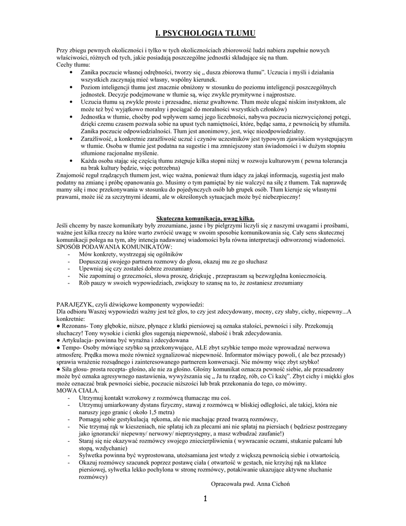 I. PSYCHOLOGIA TŁUMU Przy zbiegu pewnych okoliczności i tylko w tych okolicznościach zbiorowość ludzi nabiera zupełnie nowych właściwości, różnych od tych, jakie posiadają poszczególne jednostki składające się na tłum. Cechy tłumu: • Zanika poczucie własnej odrębności, tworzy się „ dusza zbiorowa tłumu”. Uczucia i myśli i działania wszystkich zaczynają mieć własny, wspólny kierunek. • Poziom inteligencji tłumu jest znacznie obniżony w stosunku do poziomu inteligencji poszczególnych jednostek. Decyzje podejmowane w tłumie są, więc zwykle prymitywne i najprostsze. • Uczucia tłumu są zwykle proste i przesadne, nieraz gwałtowne. Tłum może ulegać niskim instynktom, ale może też być wyjątkowo moralny i pociągać do moralności wszystkich członków) • Jednostka w tłumie, choćby pod wpływem samej jego liczebności, nabywa poczucia niezwyciężonej potęgi, dzięki czemu czasem pozwala sobie na upust tych namiętności, które, będąc sama, z pewnością by stłumiła. Zanika poczucie odpowiedzialności. Tłum jest anonimowy, jest, więc nieodpowiedzialny. • Zaraźliwość, a konkretnie zaraźliwość uczuć i czynów uczestników jest typowym zjawiskiem występującym w tłumie. Osoba w tłumie jest podatna na sugestie i ma zmniejszony stan świadomości i w dużym stopniu stłumione racjonalne myślenie. • Każda osoba stając się częścią tłumu zstępuje kilka stopni niżej w rozwoju kulturowym ( pewna tolerancja na brak kultury będzie, więc potrzebna) Znajomość reguł rządzących tłumem jest, więc ważna, ponieważ tłum idący za jakąś informacją, sugestią jest mało podatny na zmianę i próbę opanowania go. Musimy o tym pamiętać by nie walczyć na siłę z tłumem. Tak naprawdę mamy siłę i moc przekonywania w stosunku do pojedynczych osób lub grupek osób. Tłum kieruje się własnymi prawami, może iść za szczytnymi ideami, ale w określonych sytuacjach może być niebezpieczny! Skuteczna komunikacja, uwag kilka. Jeśli chcemy by nasze komunikaty były zrozumiane, jasne i by pielgrzymi liczyli się z naszymi uwagami i prośbami, ważne jest kilka rzeczy na które warto zwrócić uwagę w swoim sposobie komunikowania się. Cały sens skutecznej komunikacji polega na tym, aby intencja nadawanej wiadomości była równa interpretacji odtworzonej wiadomości. SPOSÓB PODAWANIA KOMUNIKATÓW: - Mów konkrety, wystrzegaj się ogólników - Dopuszczaj swojego partnera rozmowy do głosu, okazuj mu ze go słuchasz - Upewniaj się czy zostałeś dobrze zrozumiany - Nie zapominaj o grzeczności, słowa proszę, dziękuję , przepraszam są bezwzględna koniecznością. - Rób pauzy w swoich wypowiedziach, zwiększy to szansę na to, że zostaniesz zrozumiany PARAJĘZYK, czyli dźwiękowe komponenty wypowiedzi: Dla odbioru Waszej wypowiedzi ważny jest też głos, to czy jest zdecydowany, mocny, czy słaby, cichy, niepewny...A konkretnie: ● Rezonans- Tony głębokie, niższe, płynące z klatki piersiowej są oznaka stałości, pewności i siły. Przekonują słuchaczy! Tony wysokie i cienki głos sugerują niepewność, słabość i brak zdecydowania. ● Artykulacja- powinna być wyraźna i zdecydowana ● Tempo- Osoby mówiące szybko są przekonywujące, ALE zbyt szybkie tempo może wprowadzać nerwowa atmosferę. Prędka mowa może również sygnalizować niepewność. Informator mówiący powoli, ( ale bez przesady) sprawia wrażenie rozsądnego i zainteresowanego partnerem konwersacji. Nie mówmy więc zbyt szybko! ● Siła głosu- prosta recepta- głośno, ale nie za głośno. Głośny komunikat oznacza pewność siebie, ale przesadzony może być oznaka agresywnego nastawienia, wywyższania się „ Ja tu rządzę, rób, co Ci każę”. Zbyt cichy i miękki głos może oznaczać brak pewności siebie, poczucie niższości lub brak przekonania do tego, co mówimy. MOWA CIAŁA. - Utrzymuj kontakt wzrokowy z rozmówcą tłumacząc mu coś. - Utrzymuj umiarkowany dystans fizyczny, stawaj z rozmówcą w bliskiej odległości, ale takiej, która nie naruszy jego granic ( około 1,5 metra) - Pomagaj sobie gestykulacją rękoma, ale nie machając przed twarzą rozmówcy, - Nie trzymaj rąk w kieszeniach, nie splataj ich za plecami ani nie splataj na piersiach ( będziesz postrzegany jako ignorancki/ niepewny/ nerwowy/ nieprzystępny, a masz wzbudzać zaufanie!) - Staraj się nie okazywać rozmówcy swojego zniecierpliwienia ( wywracanie oczami, stukanie palcami lub stopą, wzdychanie) - Sylwetka powinna być wyprostowana, utożsamiana jest wtedy z większą pewnością siebie i otwartością. - Okazuj rozmówcy szacunek poprzez postawę ciała ( otwartość w gestach, nie krzyżuj rąk na klatce piersiowej, sylwetka lekko pochylona w stronę rozmówcy, potakiwanie ukazujące aktywne słuchanie rozmówcy) Opracowała pwd. Anna Cichoń 1 ASERTYWNOŚĆ W KOMUNIKACJI MIĘDZYLUDZKIEJ Przydatne zwroty i wyrażenia • komunikaty typu „ja” np. – ja myślę... – ja czuję... – ja chcę... – ja uważam... – ja sądzę... – według mnie,.. – moim zdaniem... • oferuj kompromis, np.: — Ja myślę, że..., a co Pani/Pan myśli? — Jaki, według Pani/Pana, mógłby być akceptowalny kompromis? Przydatne techniki Zacięta płyta Powtarzaj swoje zdanie, używając niskiego, spokojnego głosu. Nie dawaj się wciągać w argumentowanie czy udowadnianie swojej racji, a tym bardziej w tłumaczenie się. Ty: „Ta droga jest zamknięta dla pielgrzymów” Pielgrzym: „Ale kto to wymyślił, przecież tedy jest bliżej…” Ty: „Ta droga jest zamknięta dla pielgrzymów” Pielgrzym „ale tamten Pan tam poszedł ! O ! ktoś go wpuścił…” Ty: „Ta droga jest zamknięta dla pielgrzymów” Zwrot akcji Ta technika polega na zatrzymaniu omawiania problemu, a skoncentrowaniu się na zachowaniu rozmówców w danej chwili. Spotykasz się z krytyką pielgrzyma dotyczącą panującego chaosu. Widzę, że