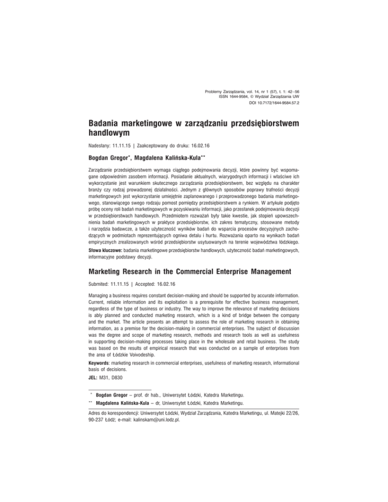 Problemy ZarzÈdzania, vol. 14, nr 1 (57), t. 1: 42 – 56 ISSN 1644-9584, © Wydziaï ZarzÈdzania UW DOI 10.7172/1644-9584.57.2 Badania marketingowe wb zarzÈdzaniu przedsiÚbiorstwem handlowym Nadesïany: 11.11.15 | Zaakceptowany do druku: 16.02.16 Bogdan Gregor*, Magdalena Kaliñska-Kula** ZarzÈdzanie przedsiÚbiorstwem wymaga ciÈgïego podejmowania decyzji, które powinny byÊ wspomagane odpowiednim zasobem informacji. Posiadanie aktualnych, wiarygodnych informacji ib wïaĂciwe ich wykorzystanie jest warunkiem skutecznego zarzÈdzania przedsiÚbiorstwem, bez wzglÚdu na charakter branĝy czy rodzaj prowadzonej dziaïalnoĂci. Jednym zb gïównych sposobów poprawy trafnoĂci decyzji marketingowych jest wykorzystanie umiejÚtnie zaplanowanego ibprzeprowadzonego badania marketingowego, stanowiÈcego swego rodzaju pomost pomiÚdzy przedsiÚbiorstwem abrynkiem. W artykule podjÚto próbÚ oceny roli badañ marketingowych wbpozyskiwaniu informacji, jako przesïanek podejmowania decyzji wb przedsiÚbiorstwach handlowych. Przedmiotem rozwaĝañ byïy takie kwestie, jak stopieñ upowszechnienia badañ marketingowych wb praktyce przedsiÚbiorstw, ich zakres tematyczny, stosowane metody ib narzÚdzia badawcze, ab takĝe uĝytecznoĂÊ wyników badañ do wsparcia procesów decyzyjnych zachodzÈcych wb podmiotach reprezentujÈcych ogniwa detalu ib hurtu. Rozwaĝania oparto na wynikach badañ empirycznych zrealizowanych wĂród przedsiÚbiorstw usytuowanych na terenie województwa ïódzkiego. Sïowa kluczowe: badania marketingowe przedsiÚbiorstw handlowych, uĝytecznoĂÊ badañ marketingowych, informacyjne podstawy decyzji. Marketing Research in the Commercial Enterprise Management Submited: 11.11.15 | Accepted: 16.02.16 Managing abbusiness requires constant decision-making and should be supported by accurate information. Current, reliable information and its exploitation is ab prerequisite for effective business management, regardless of the type of business or industry. The way to improve the relevance of marketing decisions is ably planned and conducted marketing research, which is ab kind of bridge between the company and the market. The article presents an attempt to assess the role of marketing research in obtaining information, as abpremise for the decision-making in commercial enterprises. The subject of discussion was the degree and scope of marketing research, methods and research tools as well as usefulness in supporting decision-making processes taking place in the wholesale and retail business. The study was based on the results of empirical research that was conducted on ab sample of enterprises from the area of ódzkie Voivodeship. Keywords: marketing research in commercial enterprises, usefulness of marketing research, informational basis of decisions. JEL: M31, D830 * Bogdan Gregor – prof. dr hab., Uniwersytet ódzki, Katedra Marketingu. ** Magdalena Kaliñska-Kula – dr, Uniwersytet ódzki, Katedra Marketingu. Adres do korespondencji: Uniwersytet ódzki, Wydziaï ZarzÈdzania, Katedra Marketingu, ul. Matejki 22/26, 90-237 ódě; e-mail: [email protected]. Badania marketingowe wb zarzÈdzaniu przedsiÚbiorstwem handlowym 1. WstÚp ZarzÈdzanie przedsiÚbiorstwem wymaga ciÈgïego podejmowania decyzji. Powinny byÊ one wspomagane odpowiednim zasobem informacji dotyczÈcych obecnego ibprzyszïego otoczenia firmy. Zapotrzebowanie na informacje jest zb kolei pochodnÈ stopnia niepewnoĂci ib ryzyka wb funkcjonowaniu przedsiÚbiorstwa (Koěmiñski, 2009). ZwiÚkszenie niepewnoĂci ib ryzyka, bÚdÈce nastÚpstwem szybkich, rozlegïych zmian otoczenia, prowadzi niewÈtpliwie do wzrostu zapotrzebowania ze strony przedsiÚbiorstwa na informacje. Bez wzglÚdu na charakter branĝy, wbktórej dziaïa przedsiÚbiorstwo, warunkiem skutecznego podejmowania decyzji jest zatem posiadanie aktualnych, wiarygodnych informacji ib wïaĂciwe ich wykorzystanie. Obecnie coraz czÚĂciej zarzÈdzanie przedsiÚbiorstwem utoĝsamia siÚ zbzarzÈdzaniem informacjami. DostÚp do informacji oraz umiejÚtnoĂÊ przeksztaïcenia ich wb unikatowÈ wiedzÚ to kluczowe elementy ksztaïtowania potencjaïu konkurencyjnego nowoczesnego przedsiÚbiorstwa (Grudzewski ib Hejduk, 2002). Jednym zb gïównych sposobów poprawy trafnoĂci decyzji marketingowych i, ogólniej, zwiÚkszenia sprawnoĂci marketingowego zarzÈdzania przedsiÚbiorstwem jest umiejÚtnie zaplanowane ib przeprowadzone badanie marketingowe. Wedïug P. Kotlera „badania marketingowe sÈ podstawowym elementem teorii ibpraktyki nowoczesnego marketingu” (Kotler, 2004, s. 103). StanowiÈ one swego rodzaju pomost pomiÚdzy przedsiÚbiorstwem abrynkiem, ograniczajÈ zakres subiektywnych przesïanek podejmowania decyzji, umoĝliwiajÈ oparcie ich na bezstronnych ibdokïadnych wynikach. W artykule podjÚto próbÚ oceny roli badañ marketingowych wb pozyskiwaniu informacji jako przesïanek podejmowania decyzji wbprzedsiÚbiorstwach handlowych. Analizie poddano: stopieñ upowszechnienia badañ marketingowych wb praktyce przedsiÚbiorstw, ich zakres tematyczny, stosowane metody ibnarzÚdzia badawcze oraz, co szczególnie waĝne, uĝytecznoĂÊ wyników badañ do wsparcia procesów decyzyjnych. Szczególny nacisk poïoĝono na analizÚ porównawczÈ miedzy przedsiÚbiorstwami reprezentujÈcymi ogniwa: detalu ib hurtu. Rozwaĝania oparto na wynikach badañ empirycznych zrealizowanych wĂród przedsiÚbiorstw usytuowanych na terenie województwa ïódzkiego. Zb ogóïu badanych przedsiÚbiorstw wyodrÚbniono grupÚ przedsiÚbiorstw handlowych. Z uwagi na niezbyt duĝÈ ich liczbÚ wartoĂÊ uogólniajÈca rezultatów badania odnoszÈcych siÚ do przedsiÚbiorstw handlowych jest ograniczona. 2. Metodyka badania oraz charakterystyka próby W latach 2011–2013 zostaï zrealizowany przez KatedrÚ Marketingu Uniwersytetu ódzkiego projekt badawczy dotyczÈcy uĝytecznoĂci badañ marketingowych wbpraktyce przedsiÚbiorstw. Projekt obejmowaï dwa badaProbl
