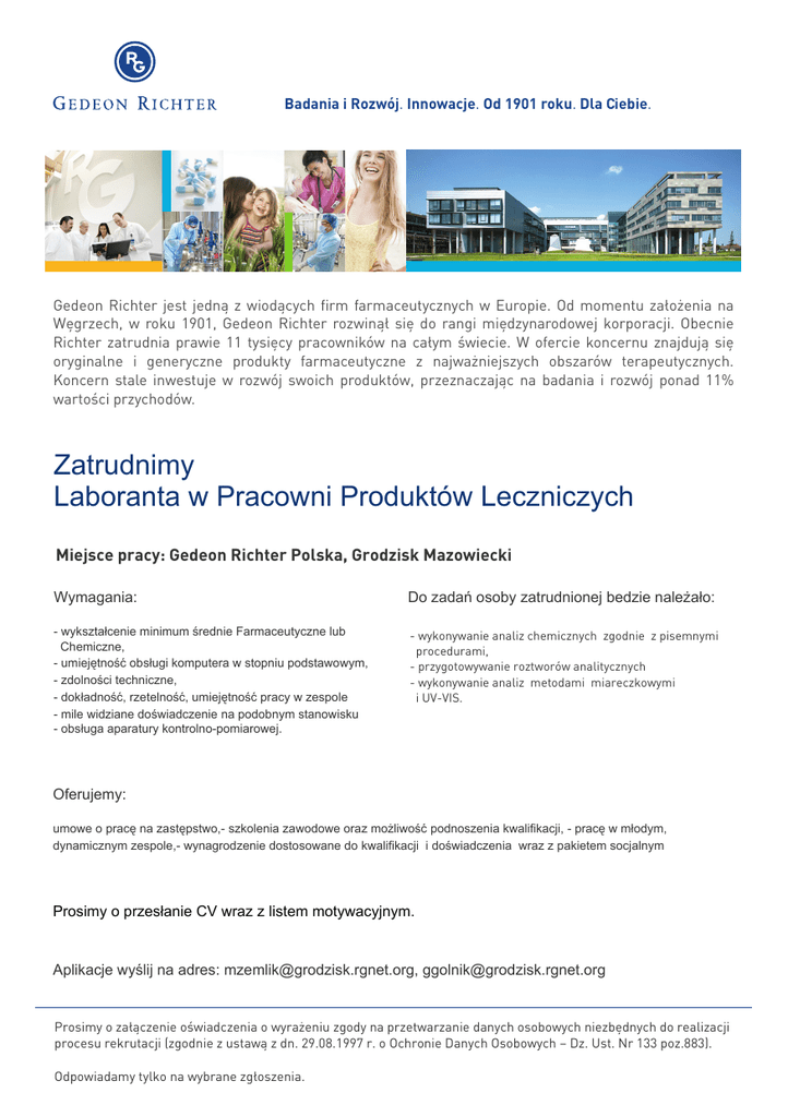 Badania i Rozwój. Innowacje. Od 1901 roku. Dla Ciebie. Gedeon Richter jest jedną z wiodących firm farmaceutycznych w Europie. Od momentu założenia na Węgrzech, w roku 1901, Gedeon Richter rozwinął się do rangi międzynarodowej korporacji. Obecnie Richter zatrudnia prawie 11 tysięcy pracowników na całym świecie. W ofercie koncernu znajdują się oryginalne i generyczne produkty farmaceutyczne z najważniejszych obszarów terapeutycznych. Koncern stale inwestuje w rozwój swoich produktów, przeznaczając na badania i rozwój ponad 11% wartości przychodów. Zatrudnimy Laboranta w Pracowni Produktów Leczniczych Miejsce pracy: Gedeon Richter Polska, Grodzisk Mazowiecki Wymagania: Do zadań osoby zatrudnionej bedzie należało: - wykształcenie minimum średnie Farmaceutyczne lub Chemiczne, - umiejętność obsługi komputera w stopniu podstawowym, - zdolności techniczne, - dokładność, rzetelność, umiejętność pracy w zespole - mile widziane doświadczenie na podobnym stanowisku - obsługa aparatury kontrolno-pomiarowej. - wykonywanie analiz chemicznych zgodnie z pisemnymi procedurami, - przygotowywanie roztworów analitycznych - wykonywanie analiz metodami miareczkowymi i UV-VIS. Oferujemy: umowe o pracę na zastępstwo,- szkolenia zawodowe oraz możliwość podnoszenia kwalifikacji, - pracę w młodym, dynamicznym zespole,- wynagrodzenie dostosowane do kwalifikacji i doświadczenia wraz z pakietem socjalnym Prosimy o przesłanie CV wraz z listem motywacyjnym. Aplikacje wyślij na adres: [email protected], [email protected] Prosimy o załączenie oświadczenia o wyrażeniu zgody na przetwarzanie danych osobowych niezbędnych do realizacji procesu rekrutacji (zgodnie z ustawą z dn. 29.08.1997 r. o Ochronie Danych Osobowych – Dz. Ust. Nr 133 poz.883). Odpowiadamy tylko na wybrane zgłoszenia.